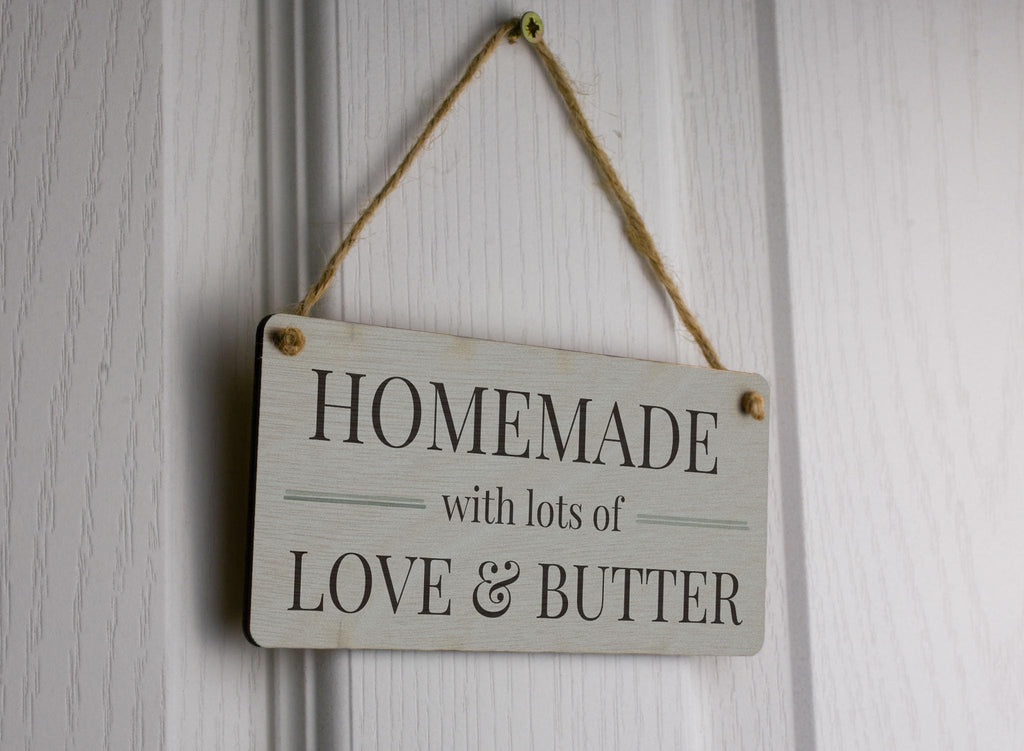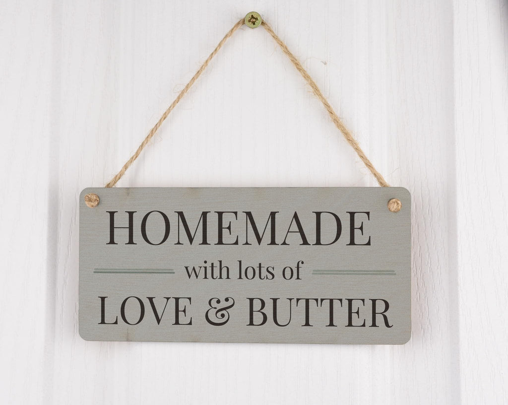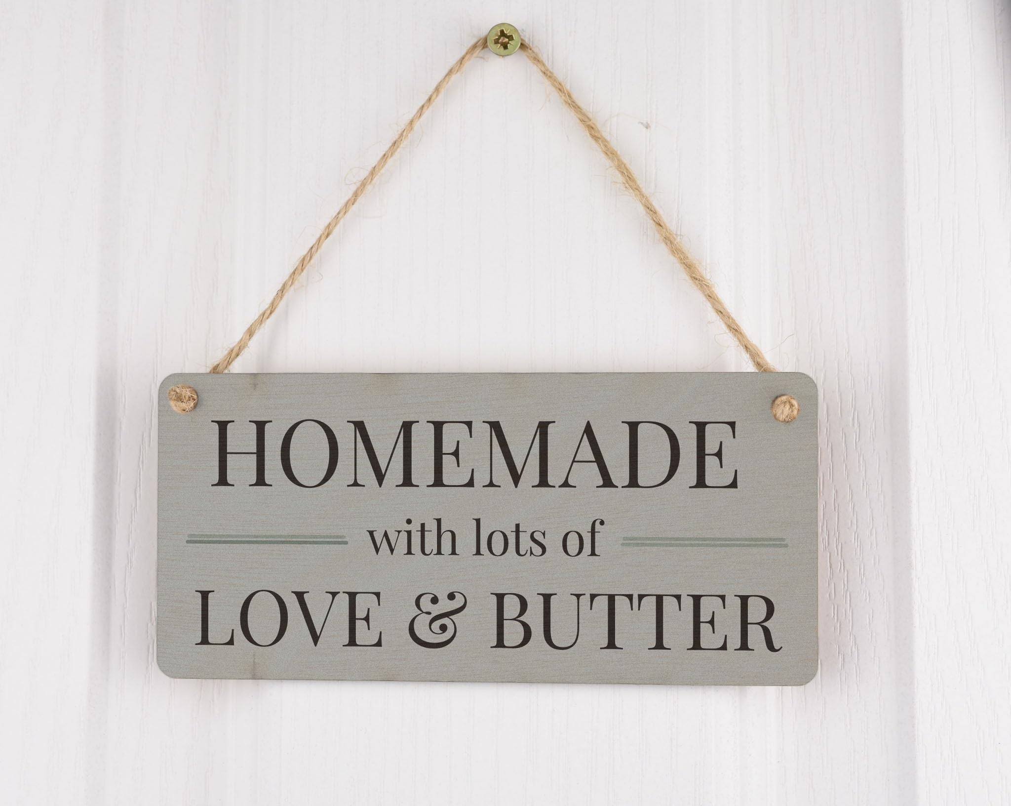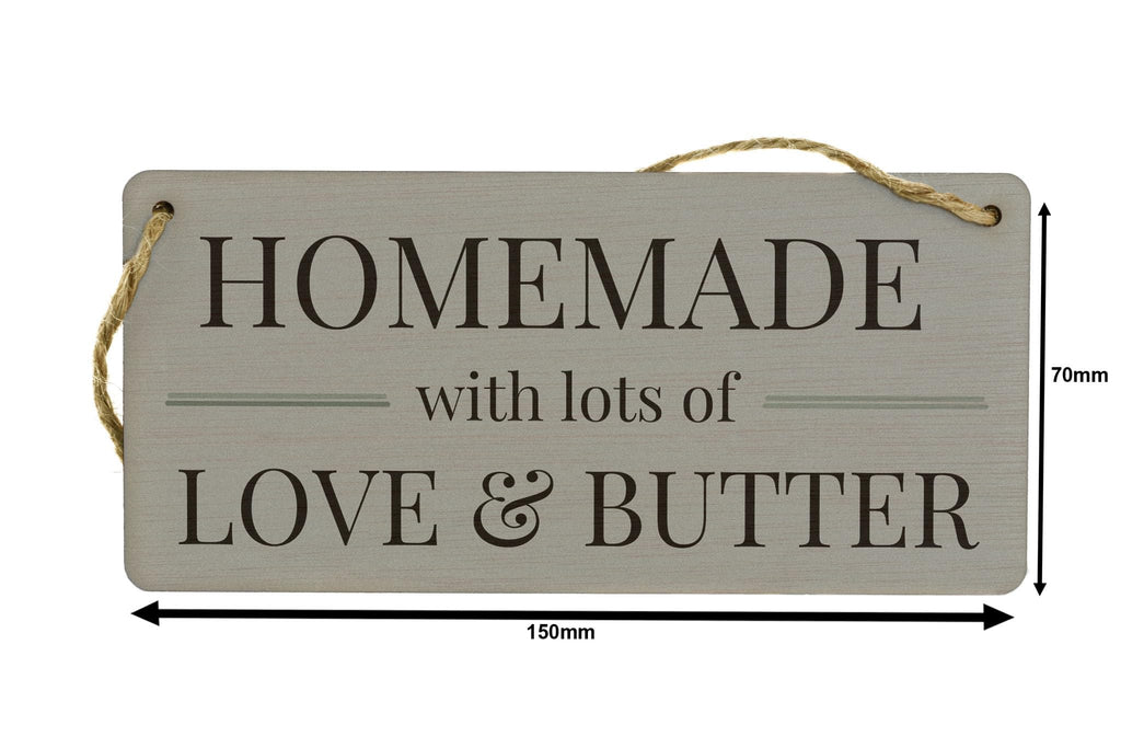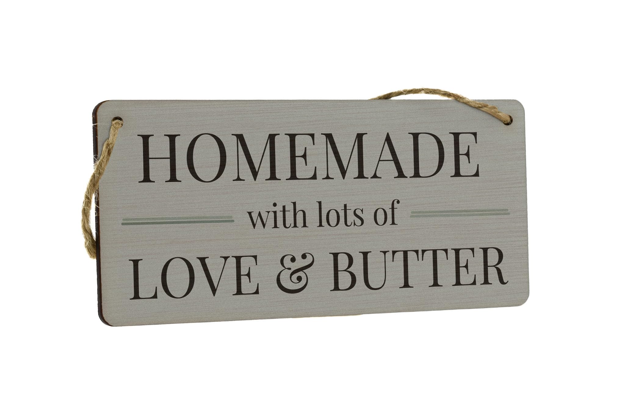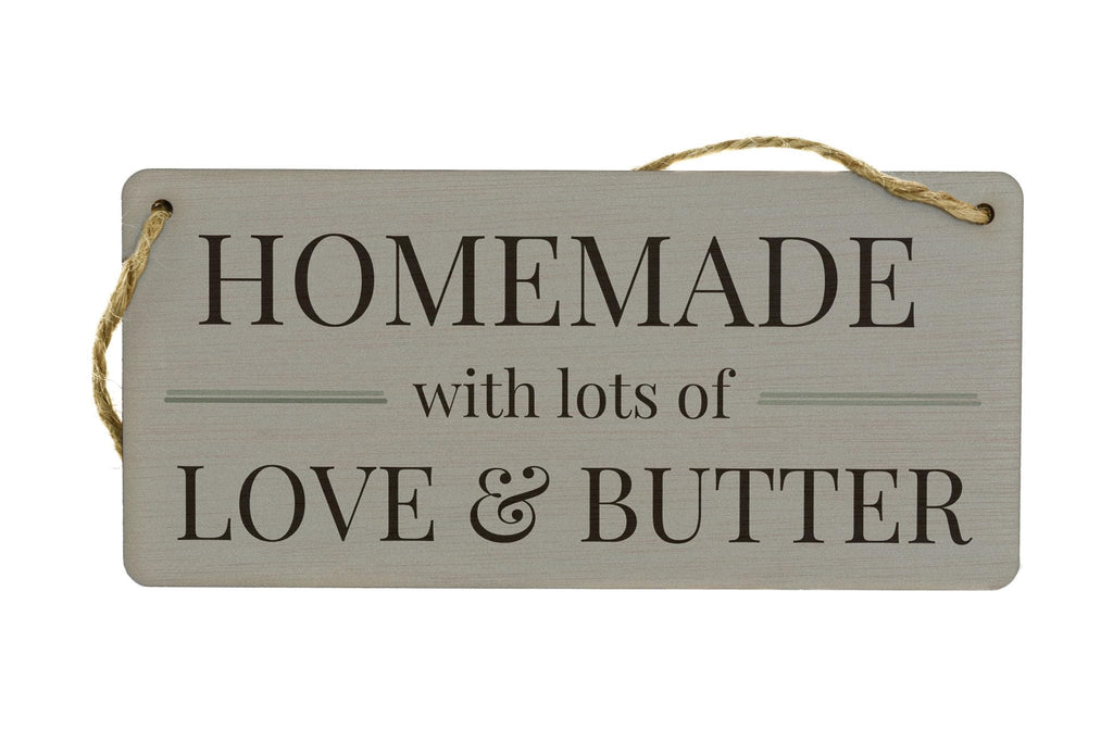 Add a touch of warmth and love to your kitchen with our Homemade with Love and Butter Plywood Hanging Kitchen Sign. This charming farmhouse style home decor piece is the perfect addition to any kitchen, bringing a sense of family and friends to the heart of your home. Crafted from quality plywood, this sign features black writing on a soft grey background, adding a stylish touch to your kitchen decor. Whether you're a cook, baker, chef, or simply someone who enjoys spending time in the kitchen, this sign is sure to inspire you to create delicious meals with lots of love and butter. It also makes a thoughtful gift for your wife, husband, girlfriend, boyfriend, son, daughter, or siblings who share your love for cooking and homemade meals.