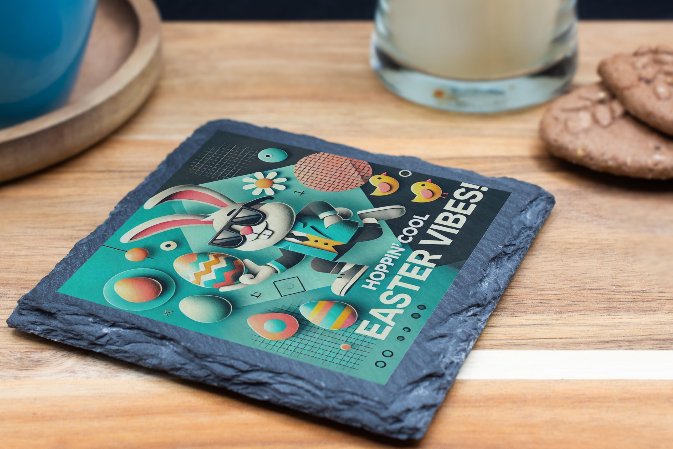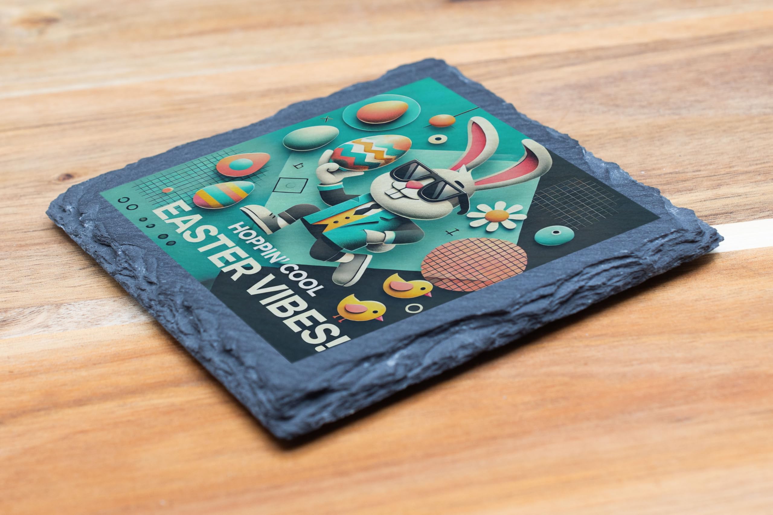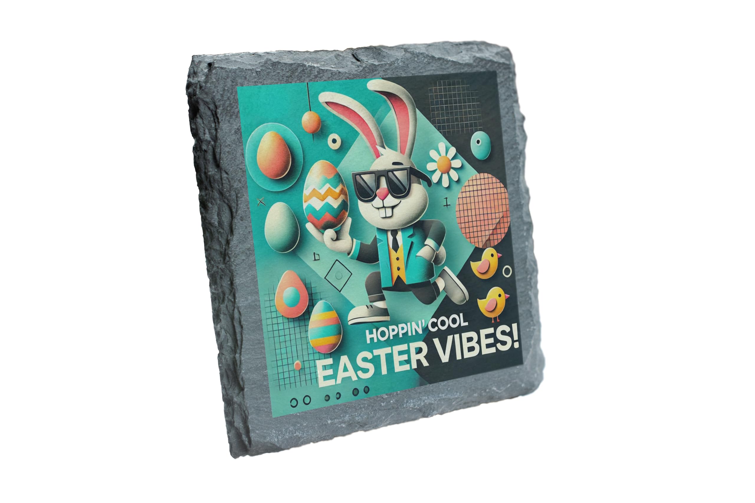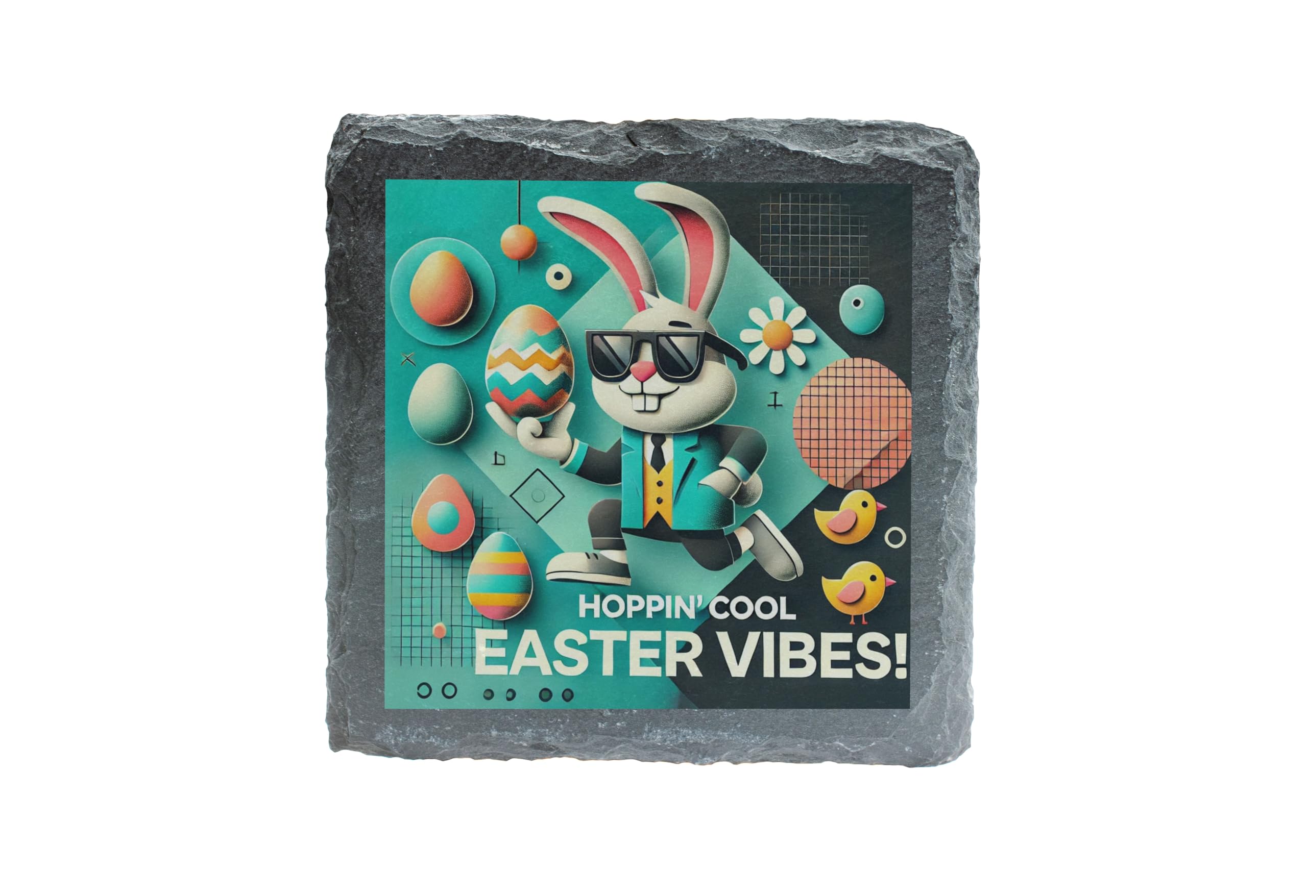 Bring the ultimate Easter spirit to your home with the "Hoppin' Cool Easter Vibes: Slate Coaster." This unique coaster showcases a modern, stylish bunny rocking sunglasses, surrounded by colorful Easter eggs and playful designs. It's the perfect blend of festive charm and contemporary cool. Crafted from high-quality natural slate, this coaster not only protects your surfaces but also adds a trendy flair to your spring decor. Whether you?re hosting an Easter brunch or sipping tea on a sunny afternoon, this coaster is a fun and functional accessory for the season. Gift it to loved ones or keep it as a delightful addition to your home this Easter. Let the good vibes hop in!
