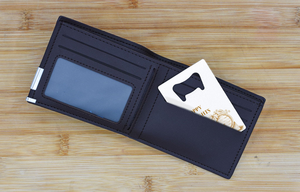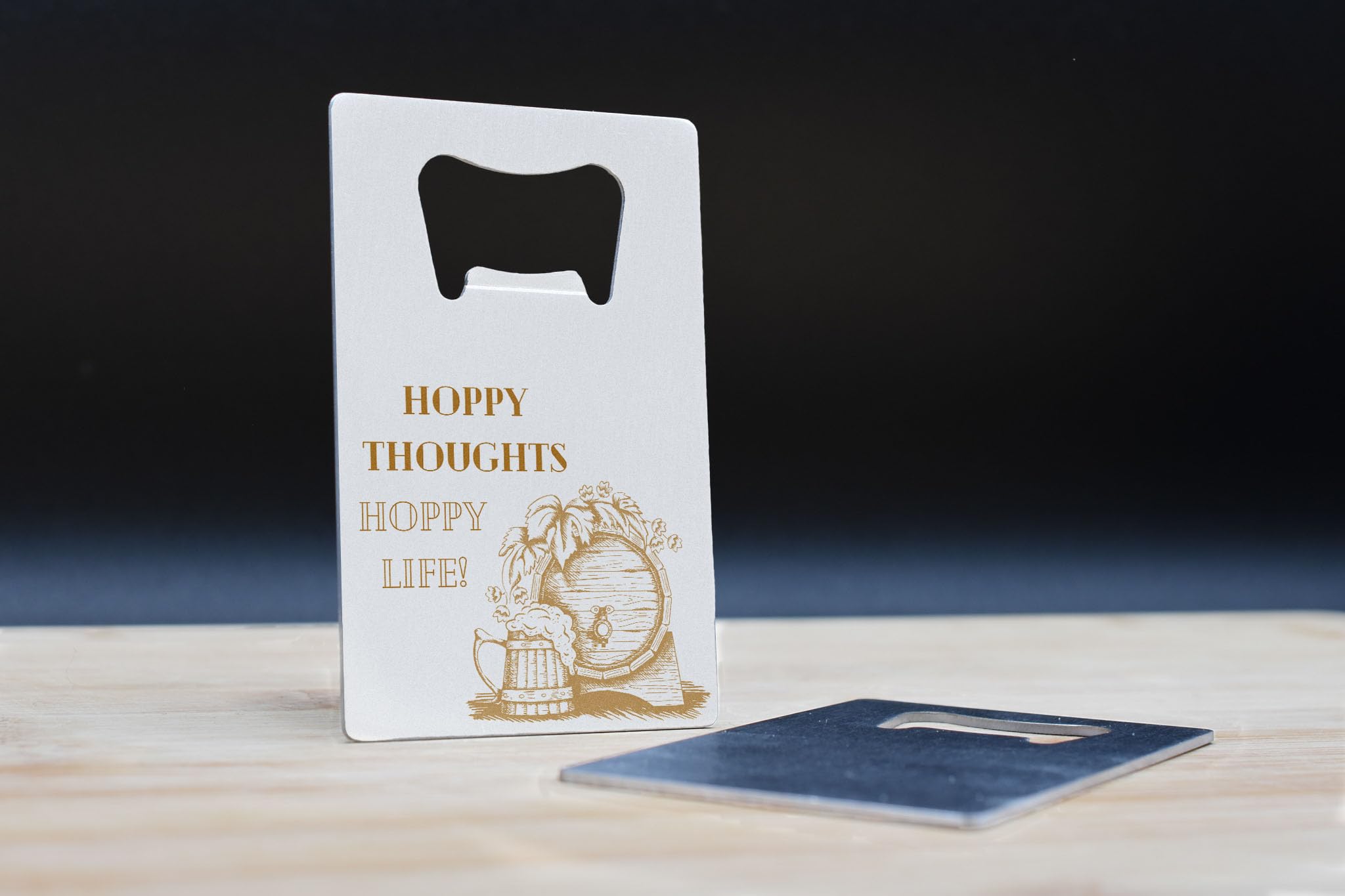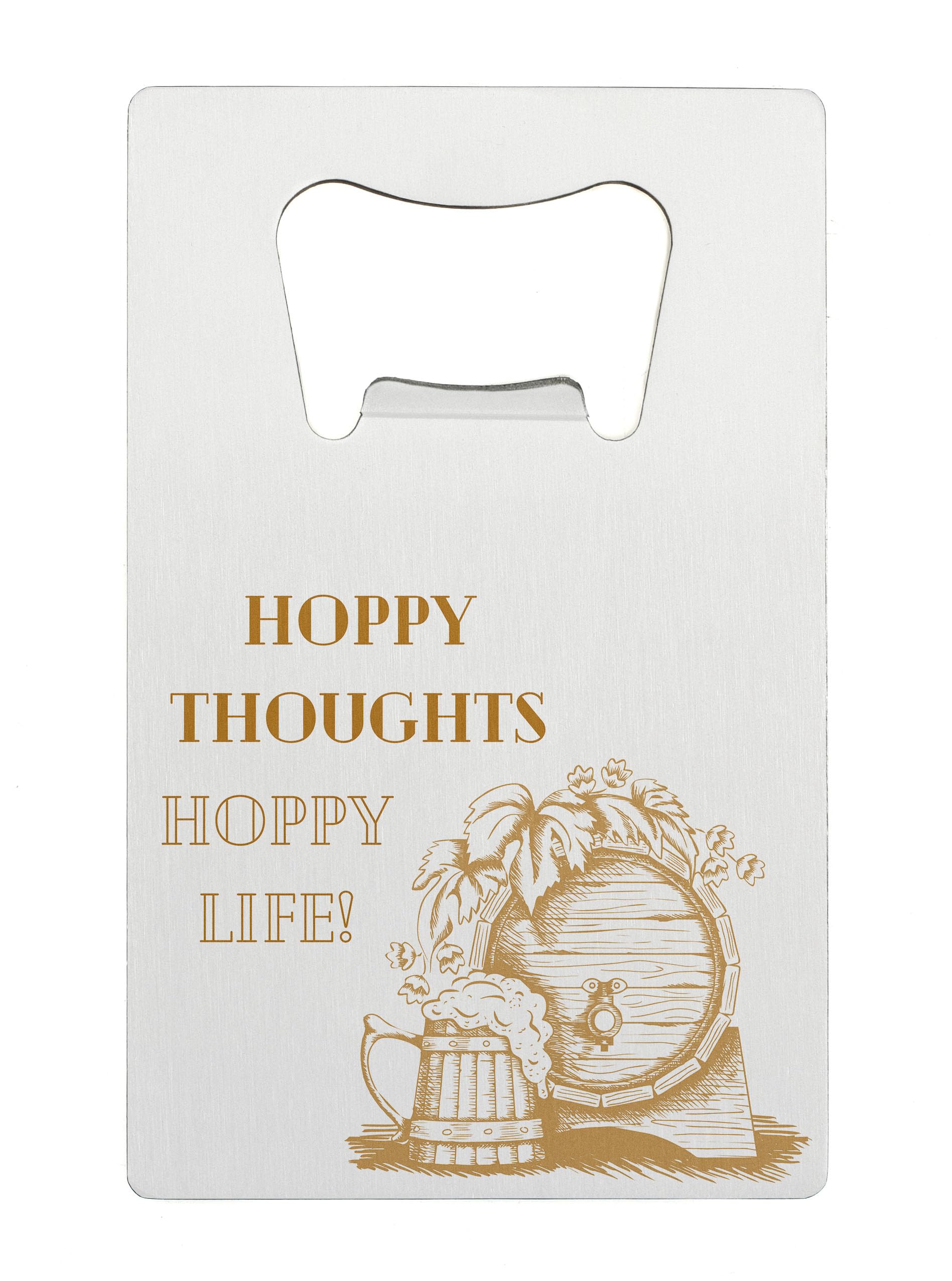 - Stainless steel bottle opener with UV printed 'Hoppy Thoughts - Hoppy Life' design