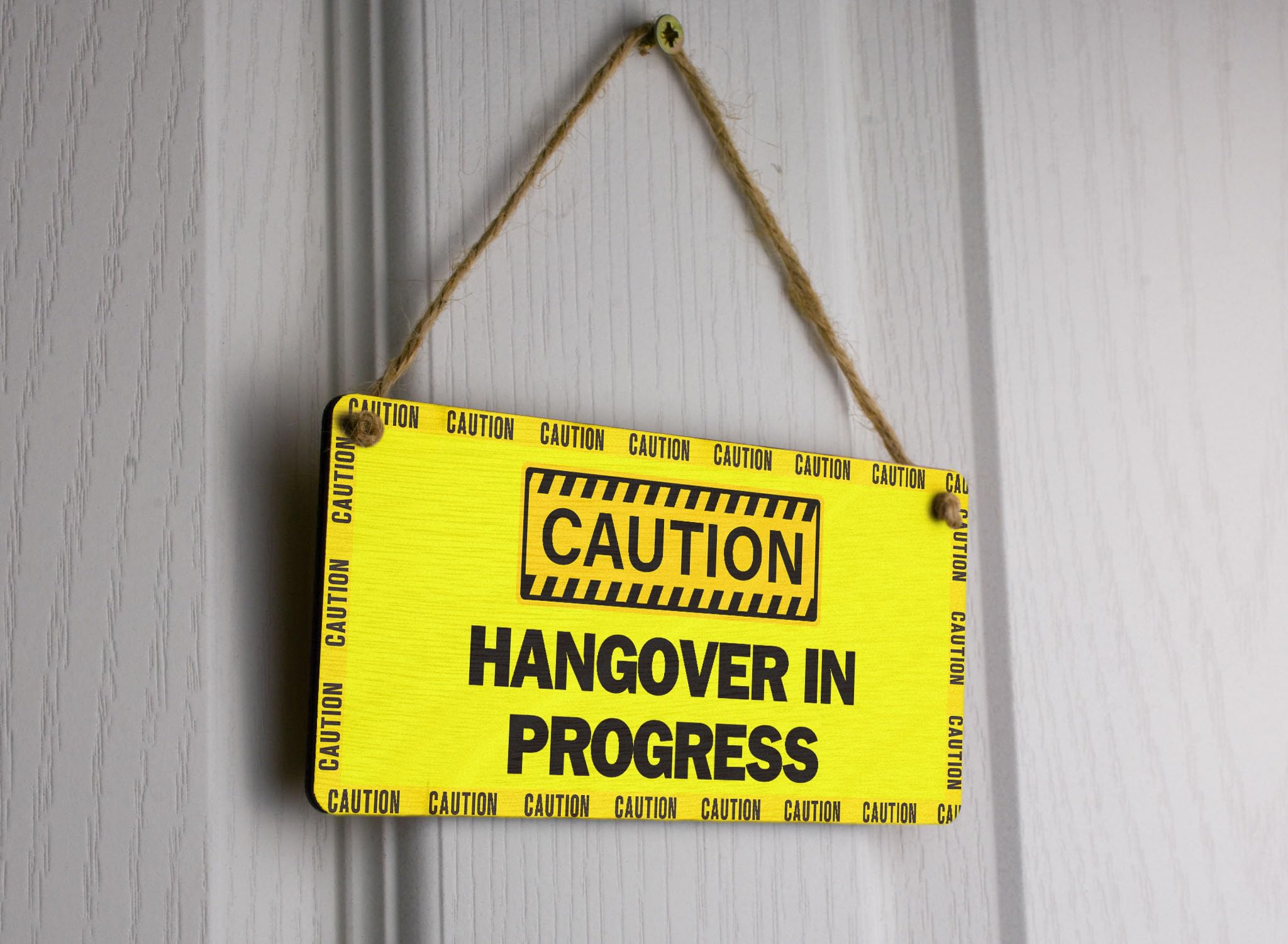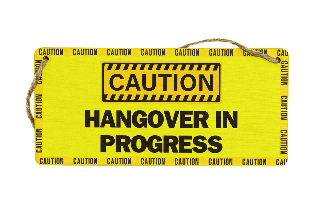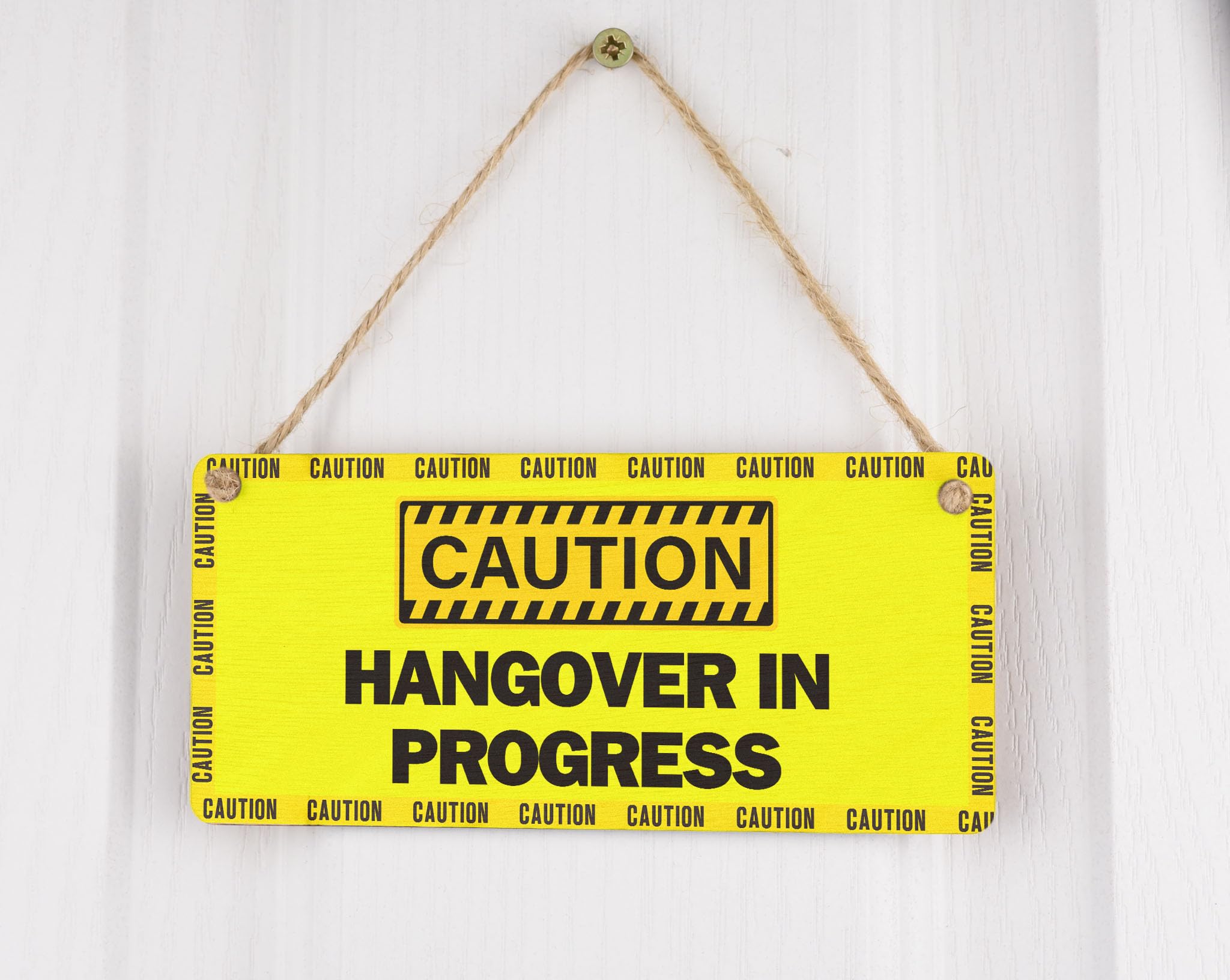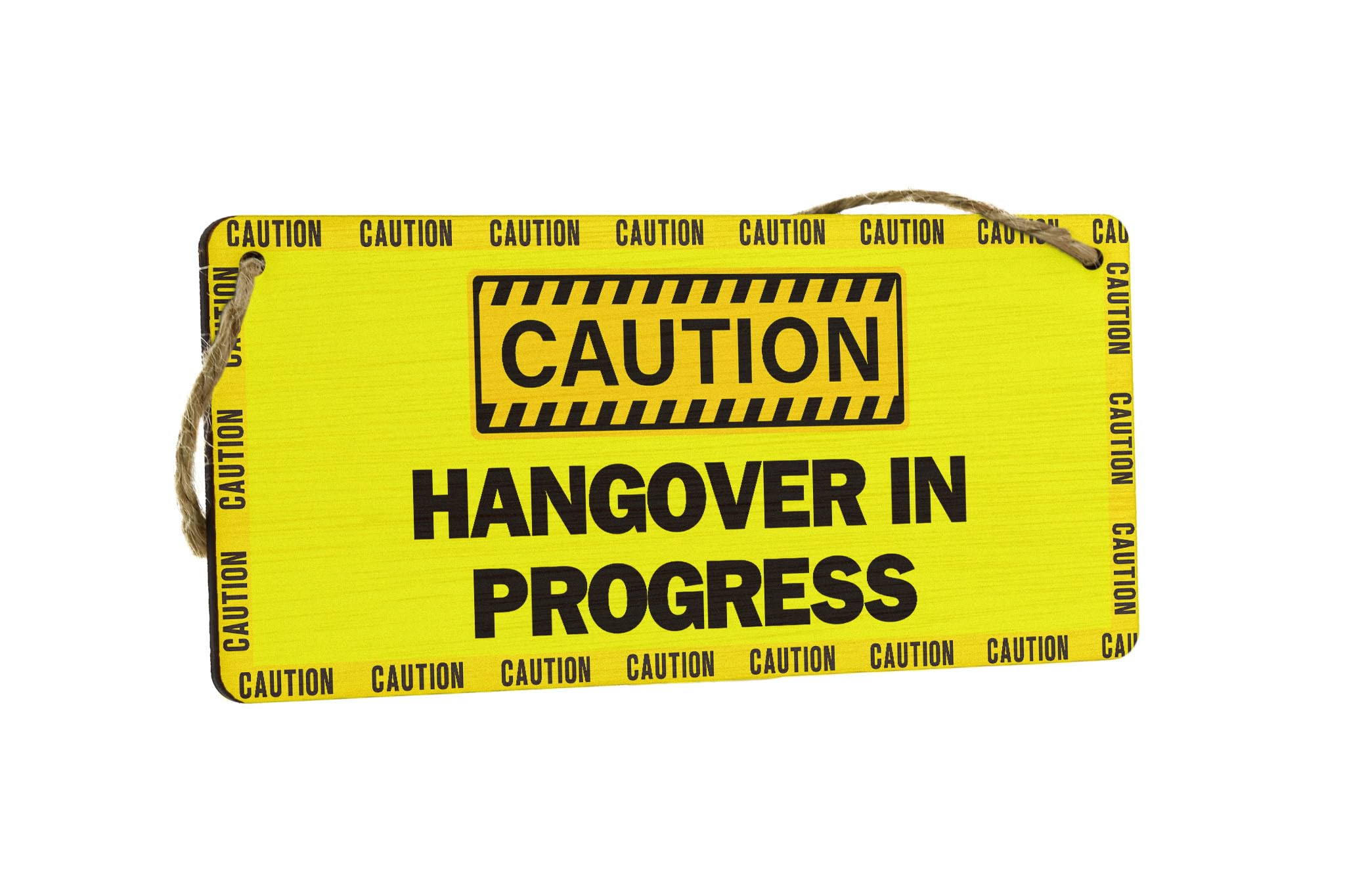 - Bright yellow sign with bold text design that reads 'Caution - Hangover in progress'