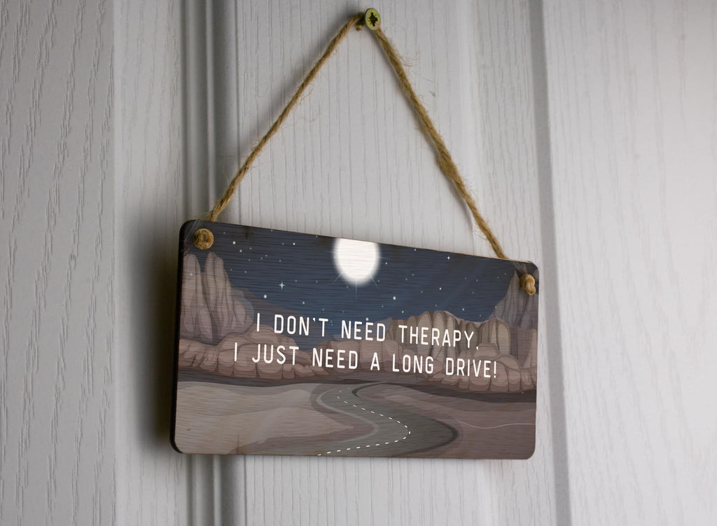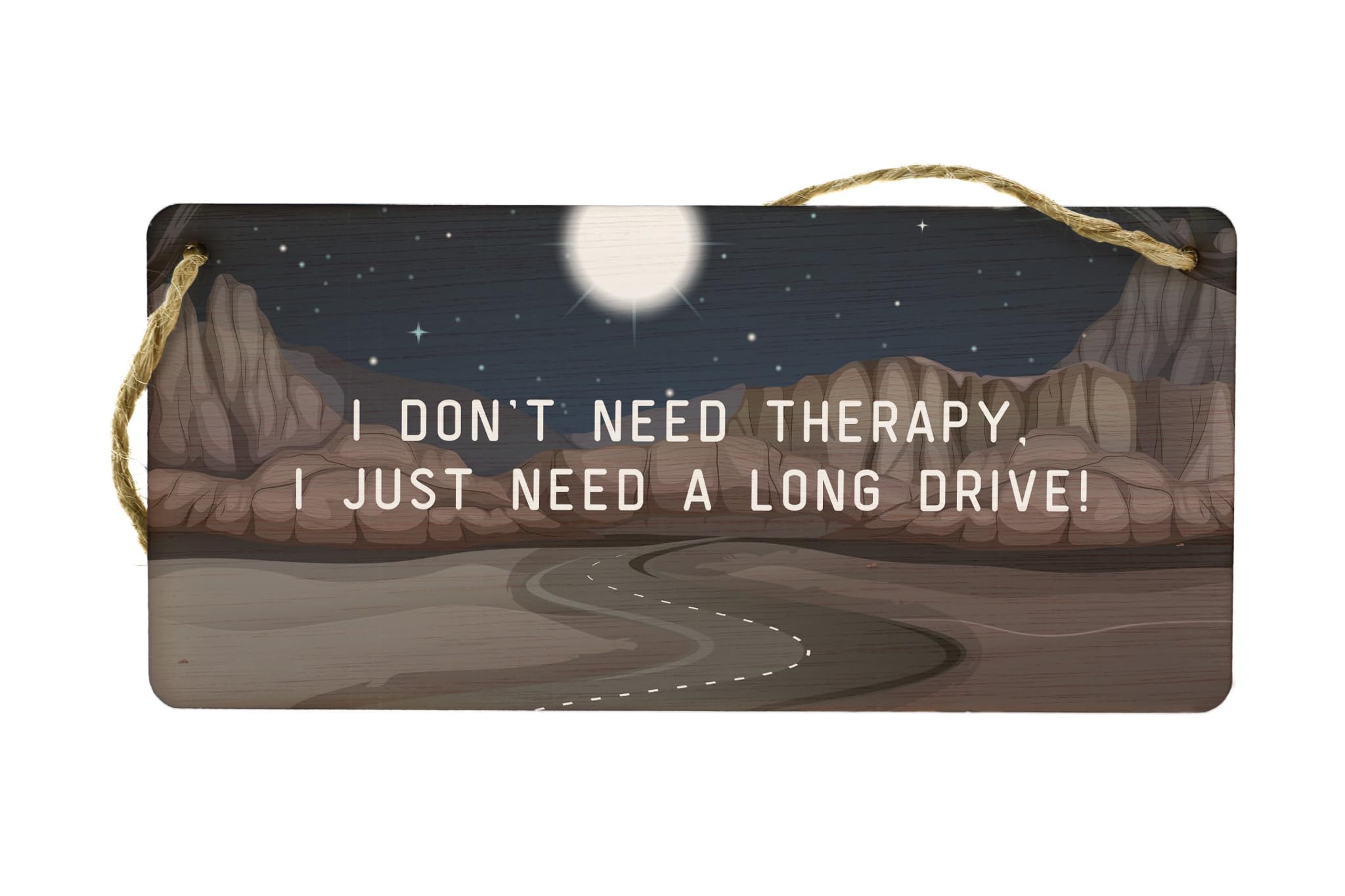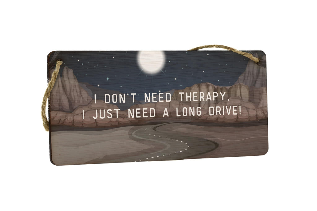 - Reads 'I Don't Need Therapy, I Just Need a Long Drive' to promote mental health
