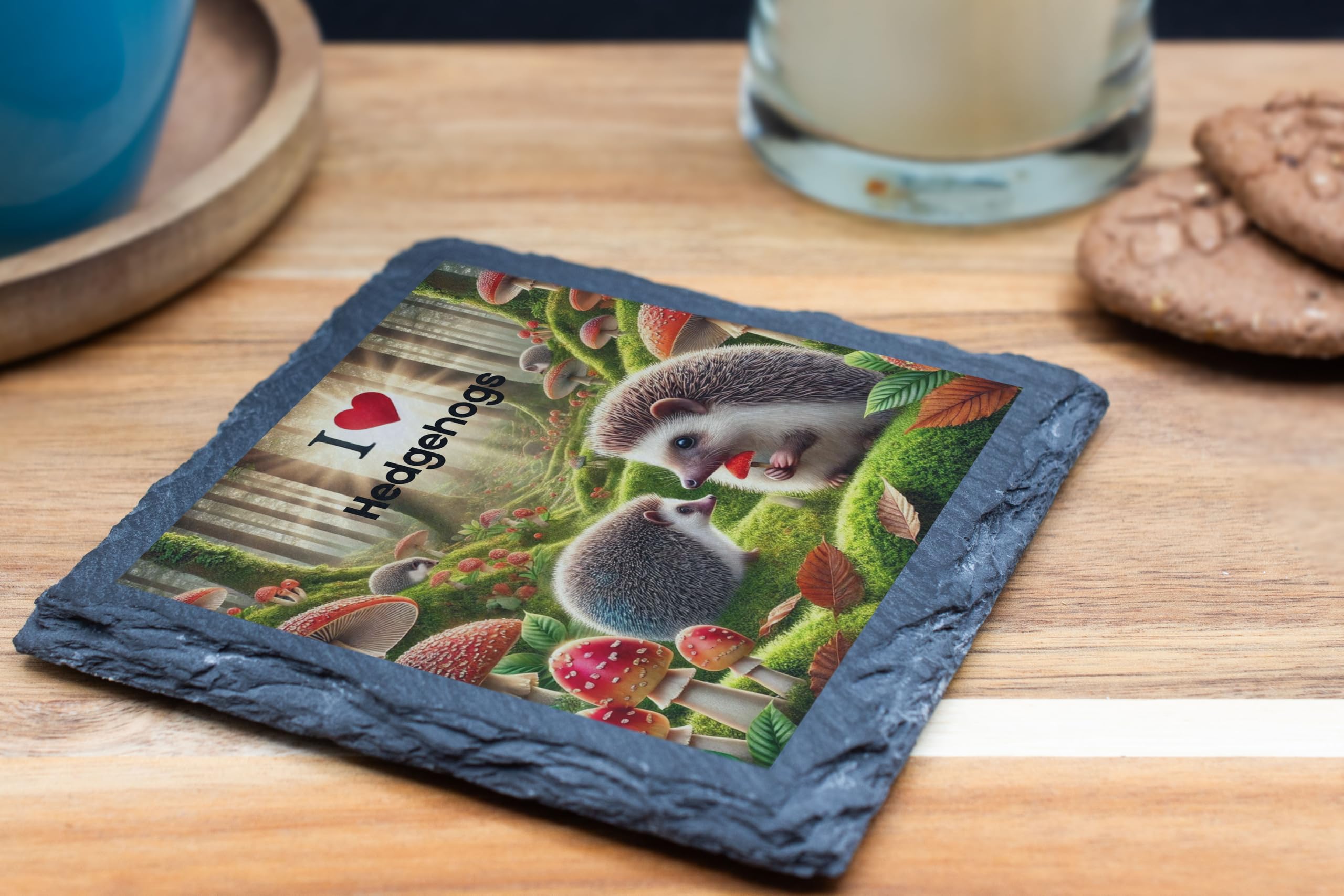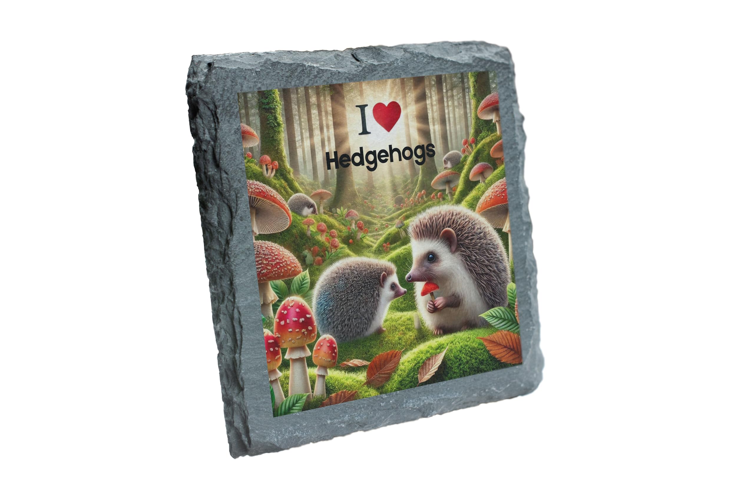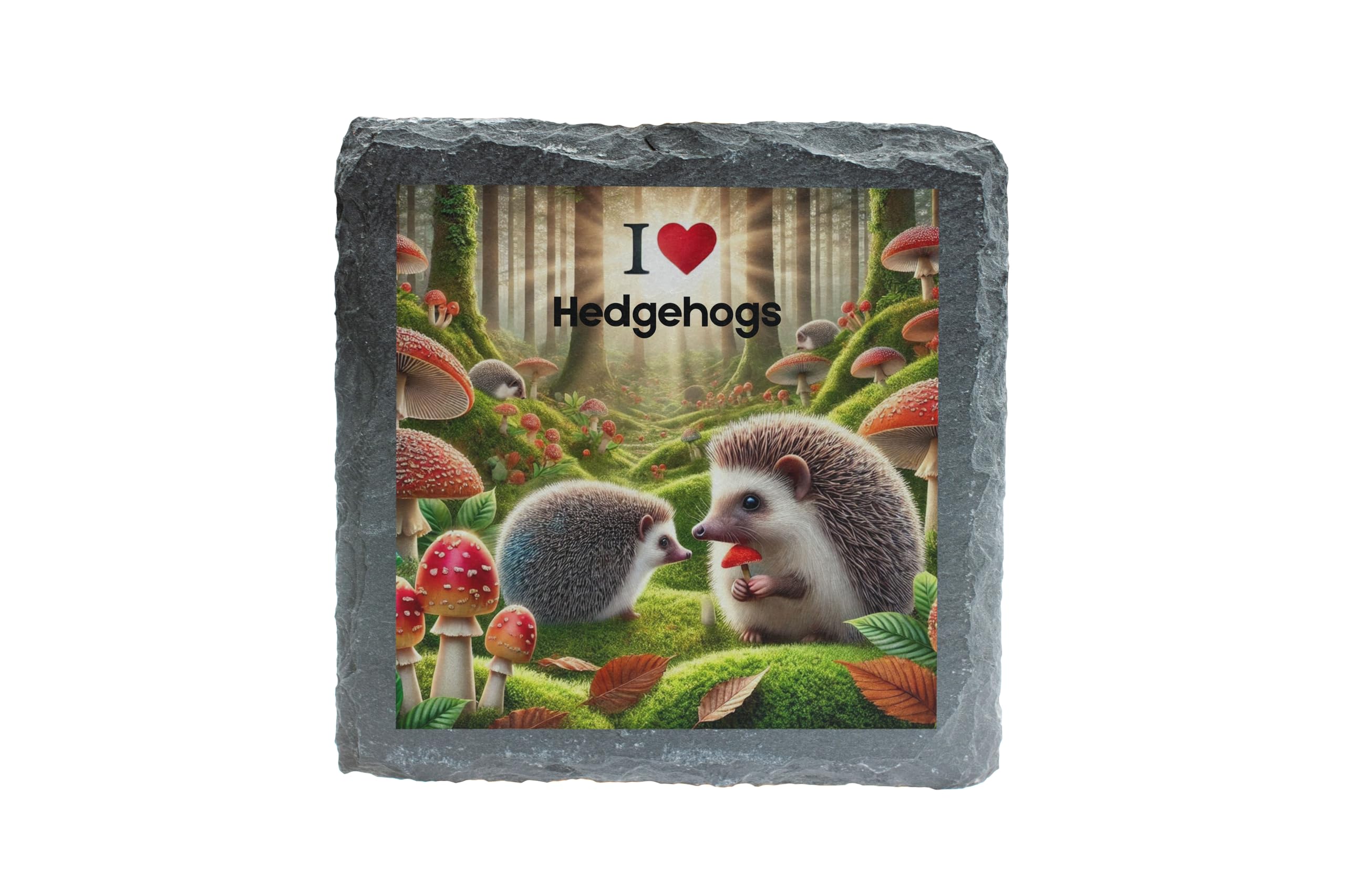 Celebrate your love for hedgehogs with this enchanting "I Love Hedgehogs" Slate Coaster. Designed with a captivating woodland scene, this coaster showcases two adorable hedgehogs amidst vibrant greenery, mushrooms, and fallen leaves. Perfect for protecting your surfaces in style, this coaster combines functionality with a touch of nature's magic. Crafted from natural slate, it provides a rustic yet elegant finish, making it a great addition to your home or a thoughtful gift for any hedgehog fan. Whether you're enjoying your morning coffee or an evening tea, let this whimsical coaster bring joy to your table setting!