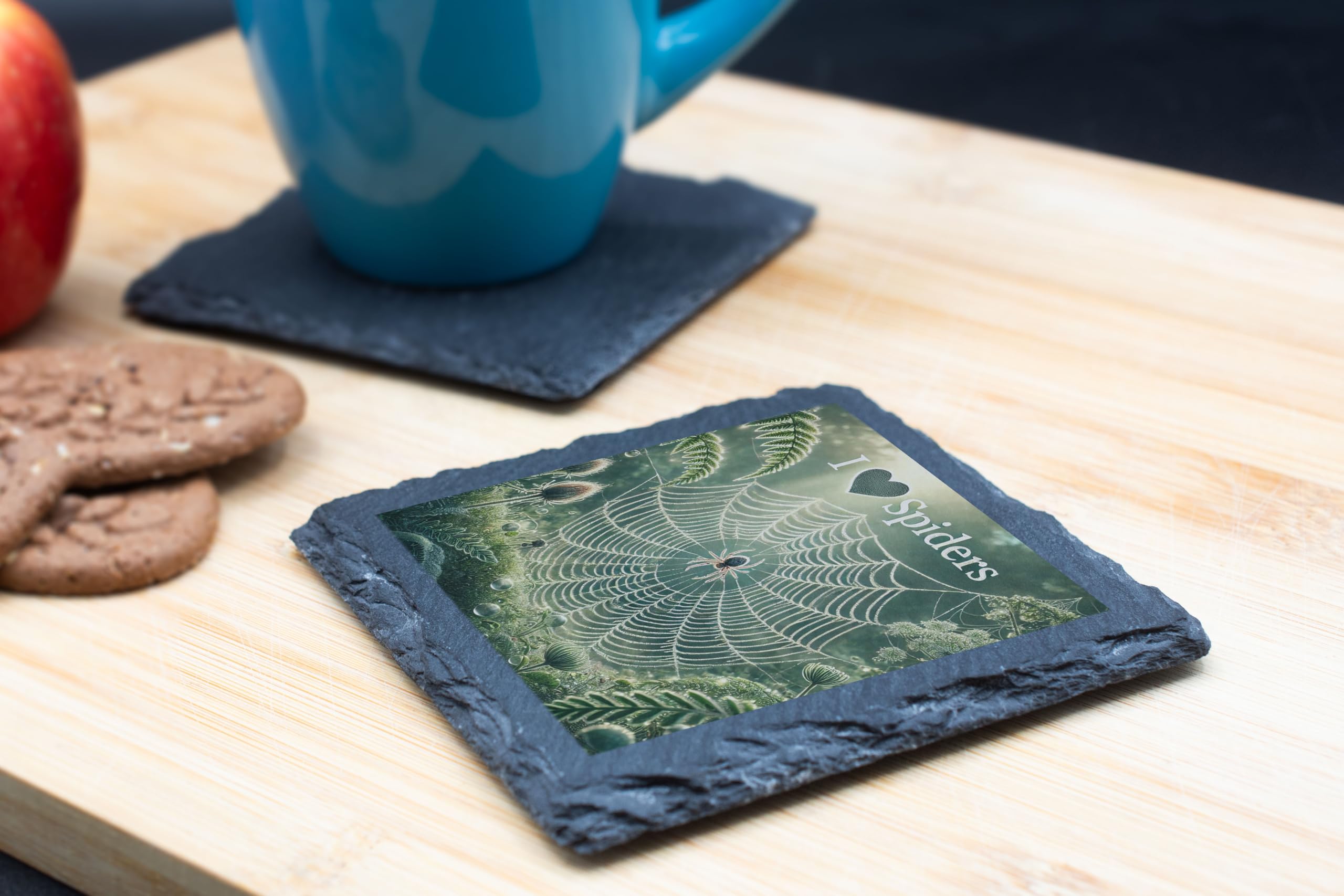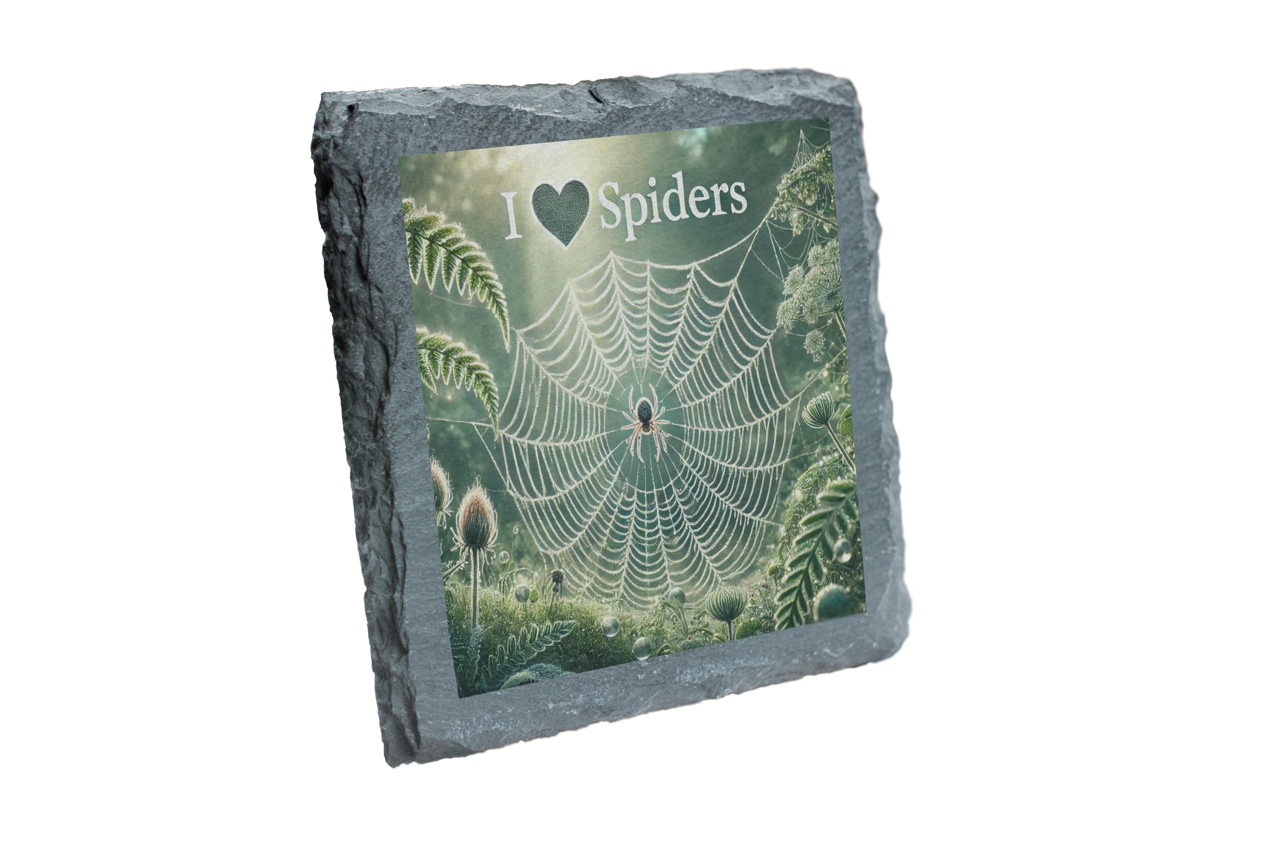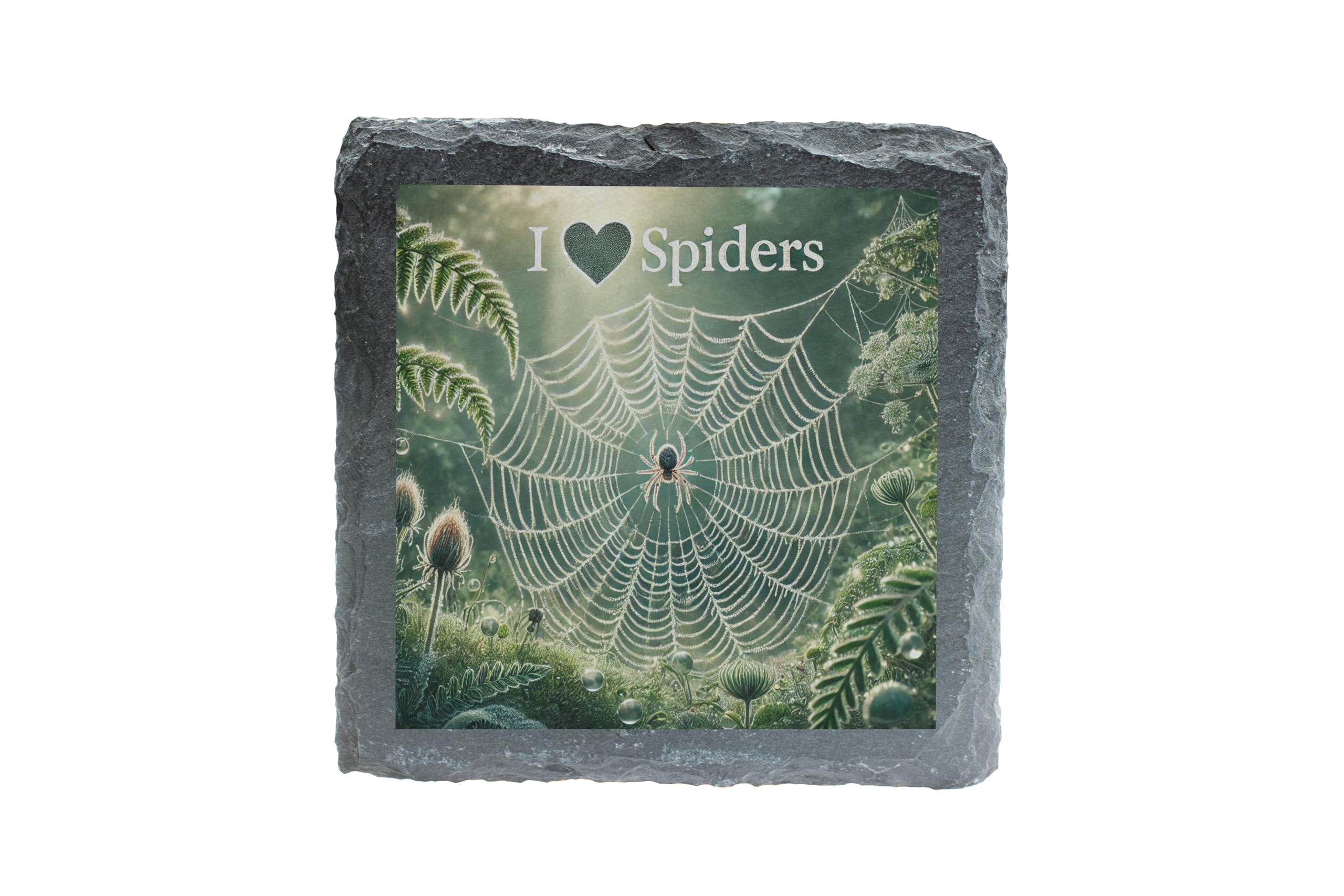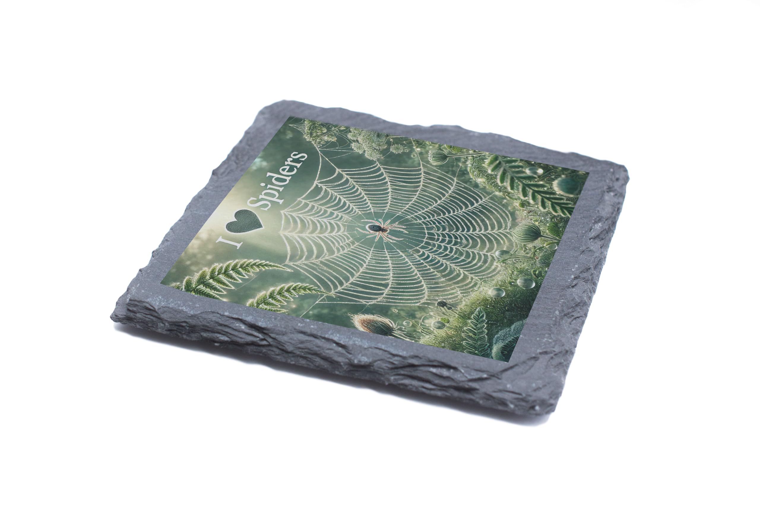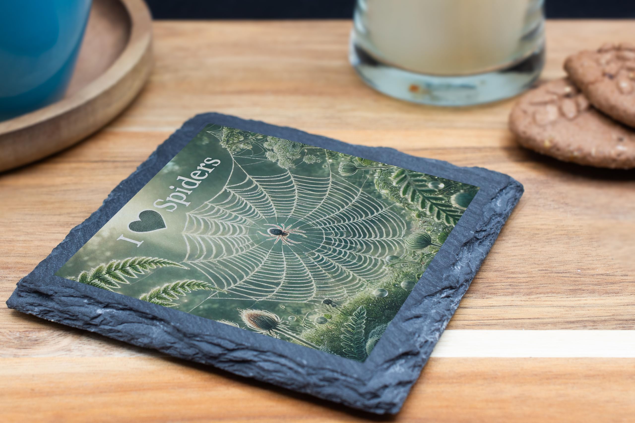 Celebrate your love for the eight-legged wonders of nature with this beautifully crafted "I Love Spiders" slate coaster. Featuring an elegant spider web design with lush greenery and a captivating central spider, this coaster is a striking blend of nature and style. The natural slate material provides durability and a rustic charm, while the soft felt backing ensures your furniture remains scratch-free. Perfect for protecting your surfaces from condensation or as a unique decorative piece, this coaster makes an excellent gift for spider enthusiasts and nature lovers alike. Whether you're adding it to your collection or gifting it to a fellow arachnophile, this slate coaster is a bold statement of admiration for the beauty of spiders. Bring a touch of nature indoors and show off your passion for arachnids with this one-of-a-kind slate coaster!