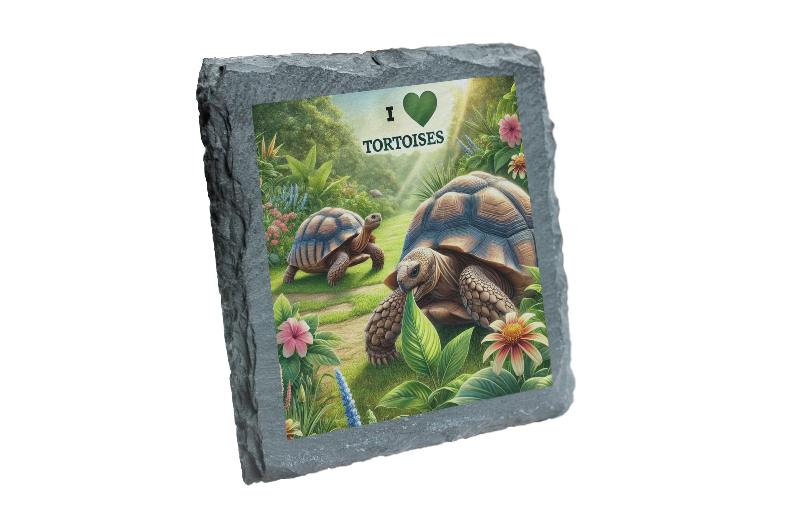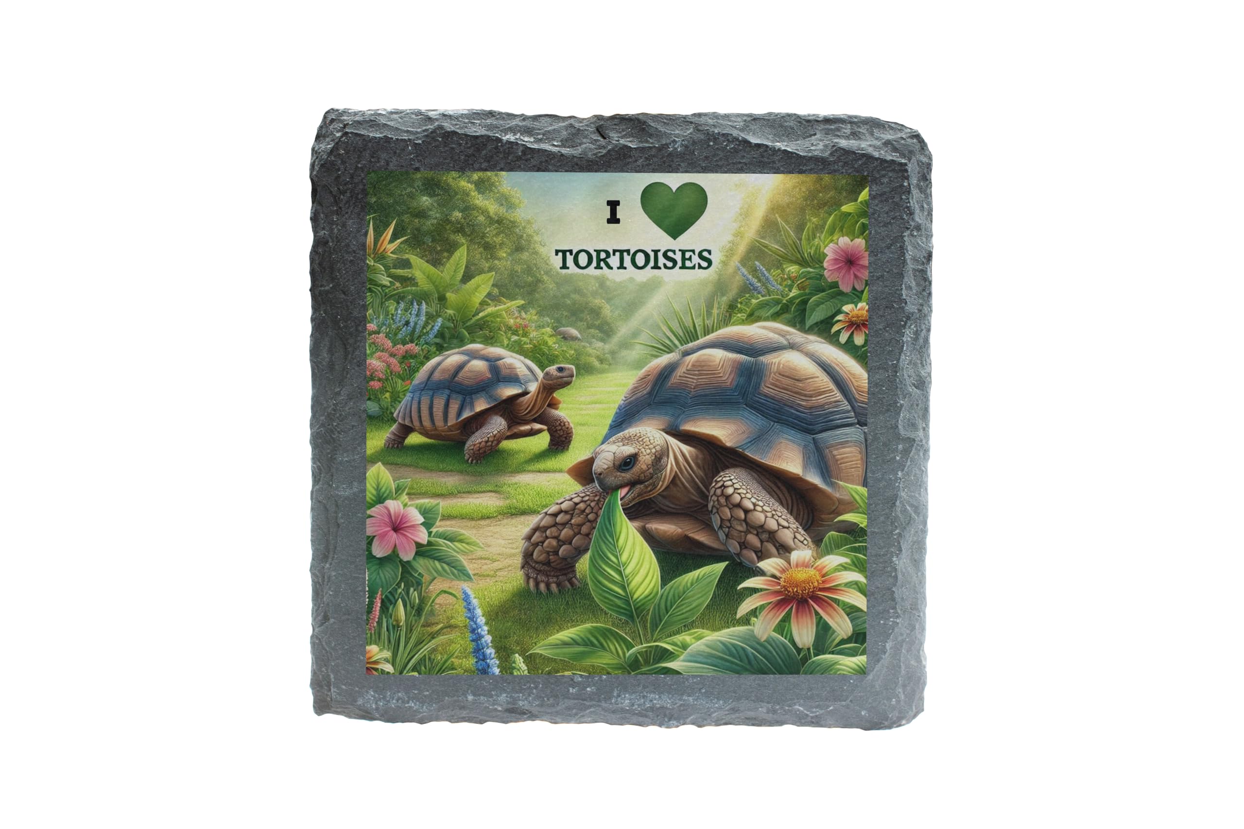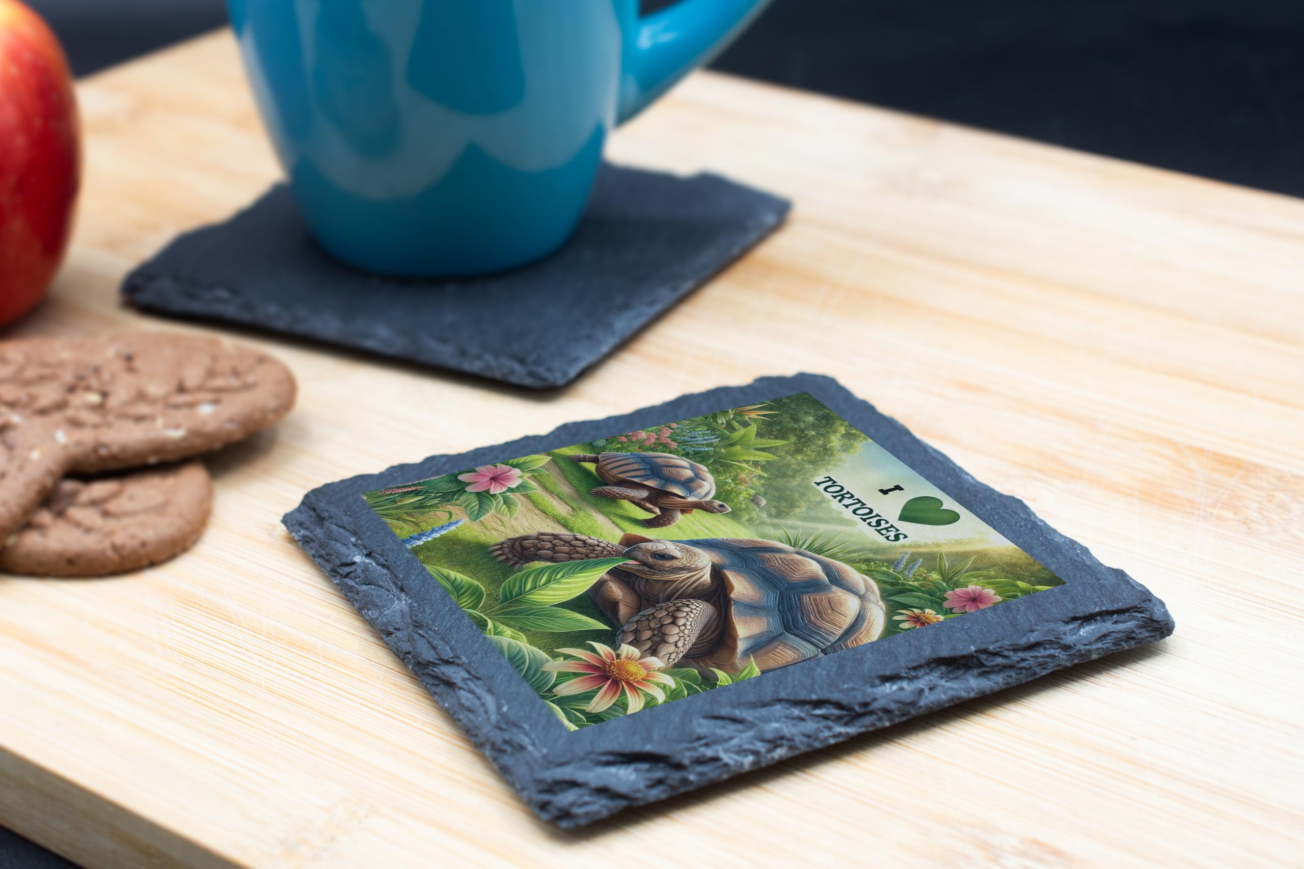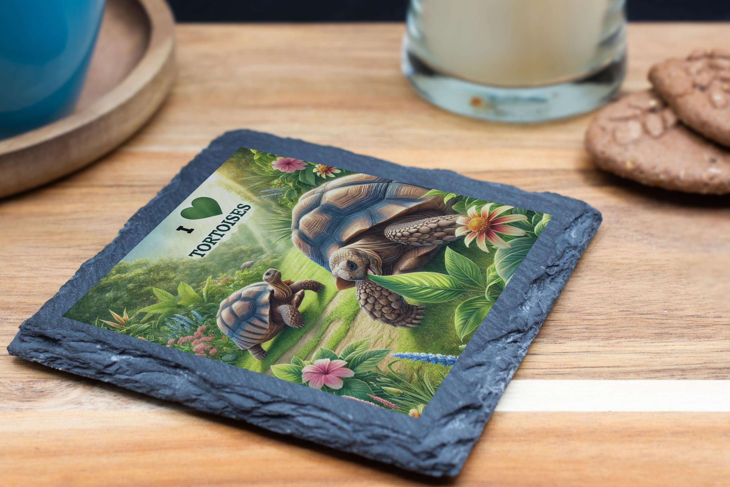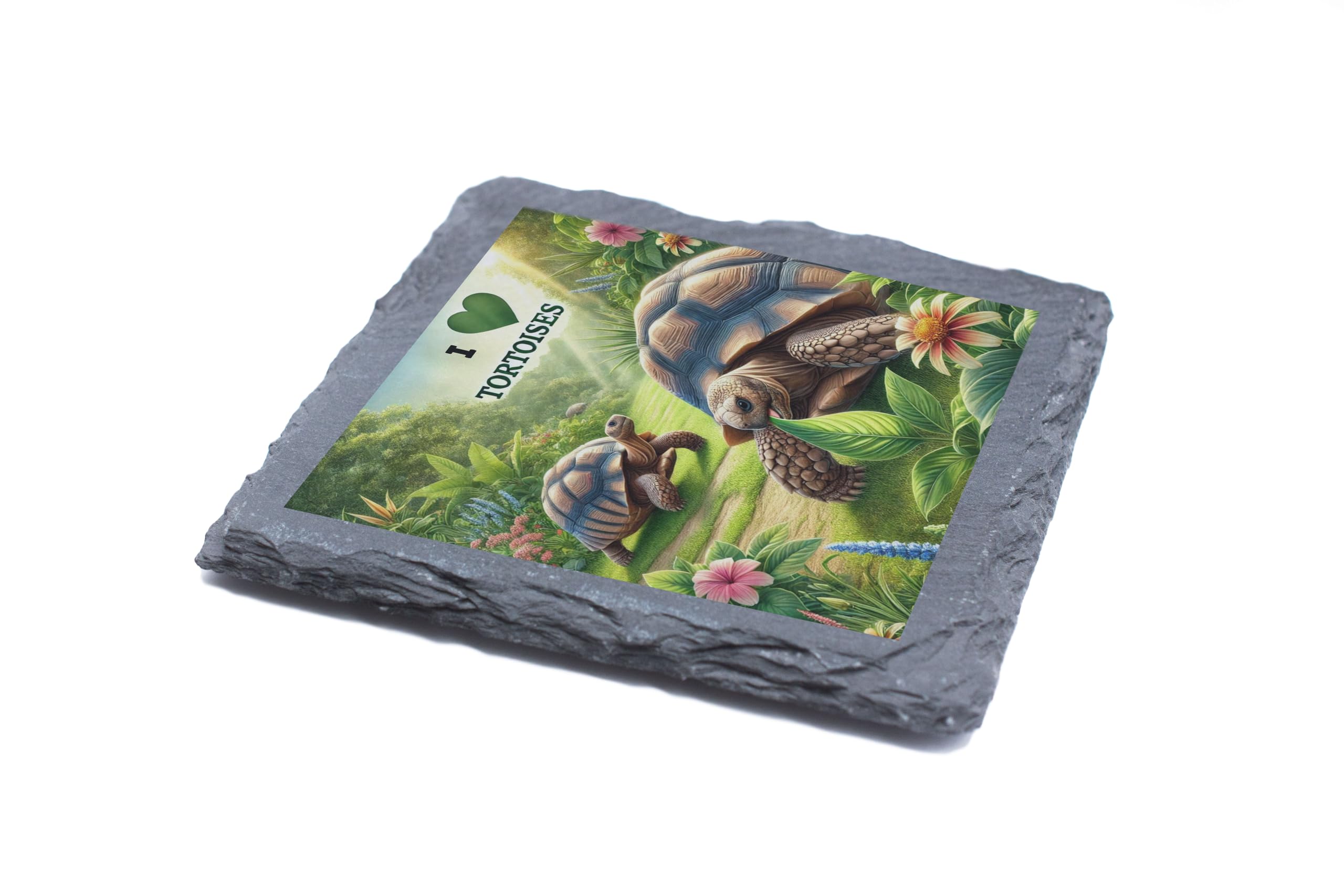 Celebrate your love for tortoises with this beautifully crafted "I Love Tortoises" slate coaster. Featuring a stunning design of tortoises in a lush natural setting, this coaster brings a touch of the outdoors into your home. The intricate artwork and vibrant colors make it a standout piece for your coffee table, desk, or kitchen. Made from high-quality natural slate, this coaster is not only visually striking but also highly durable. Its rustic charm and smooth surface make it a functional and stylish addition to any setting. Equipped with soft felt pads on the underside, it ensures your furniture stays scratch-free while providing a secure grip. Whether you're enjoying a hot cup of tea or a cold drink, this coaster protects your surfaces from spills and heat. It also makes a wonderful gift for tortoise enthusiasts or anyone with a passion for wildlife and nature-inspired decor. Add a unique and practical touch to your space with this delightful slate coaster!