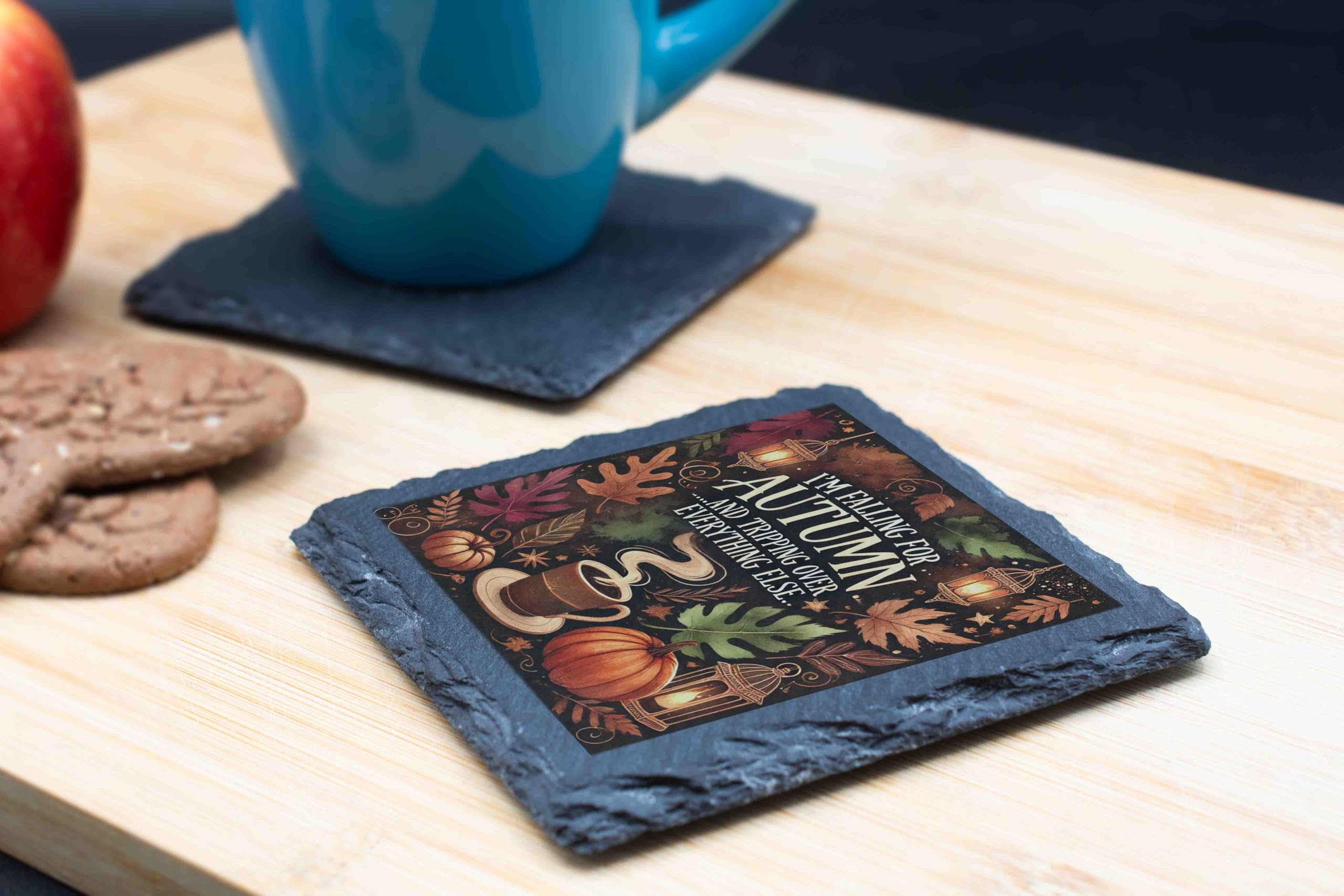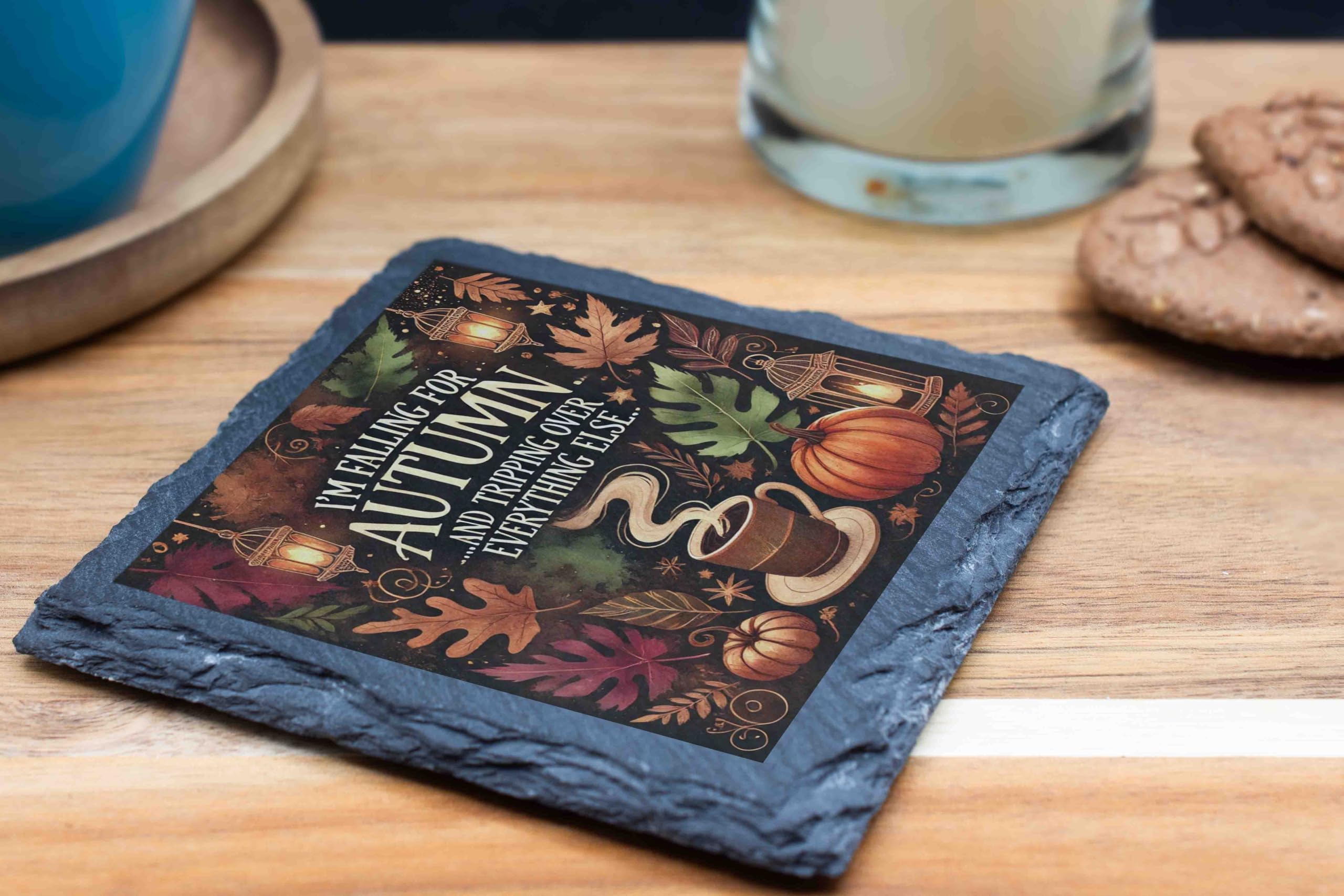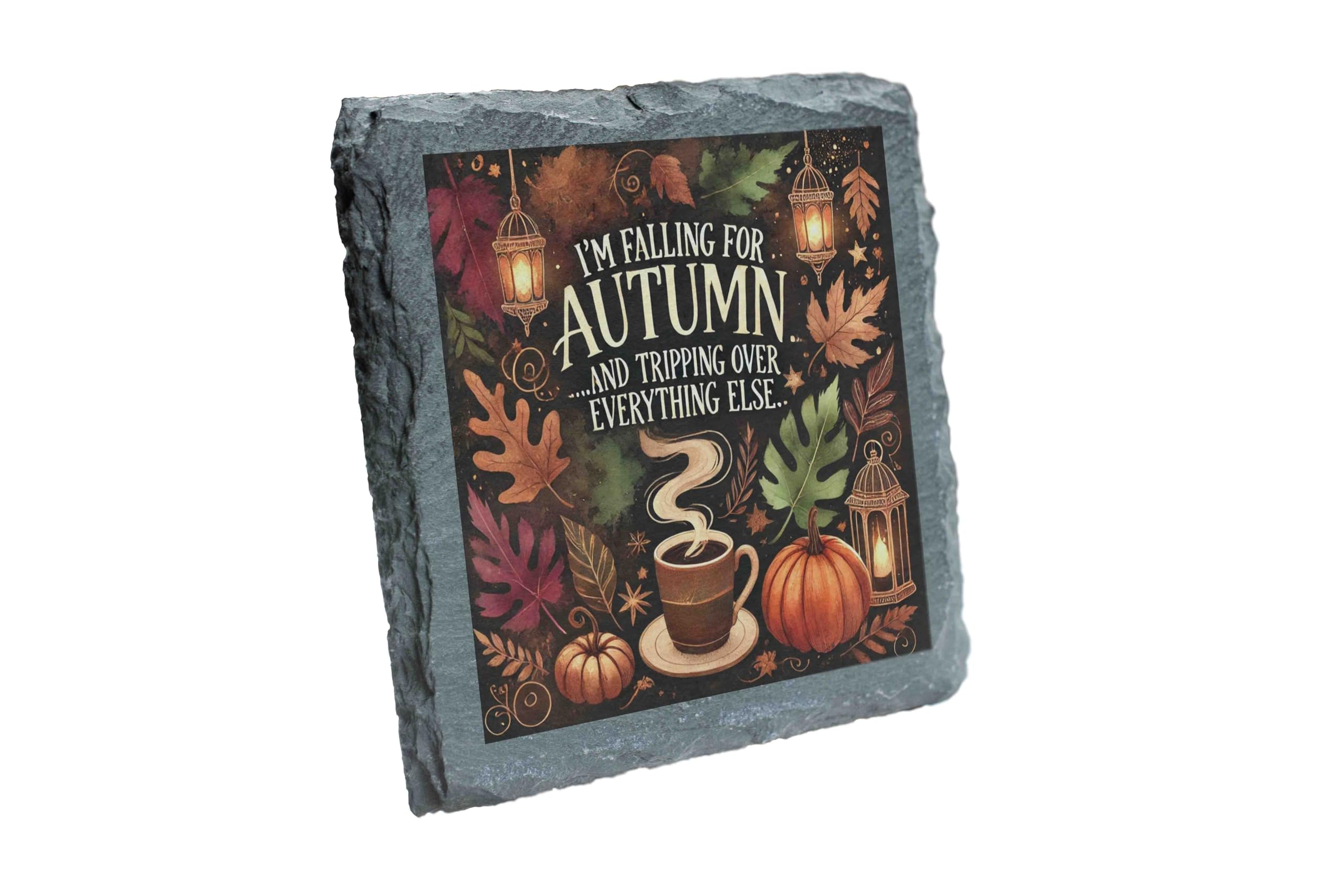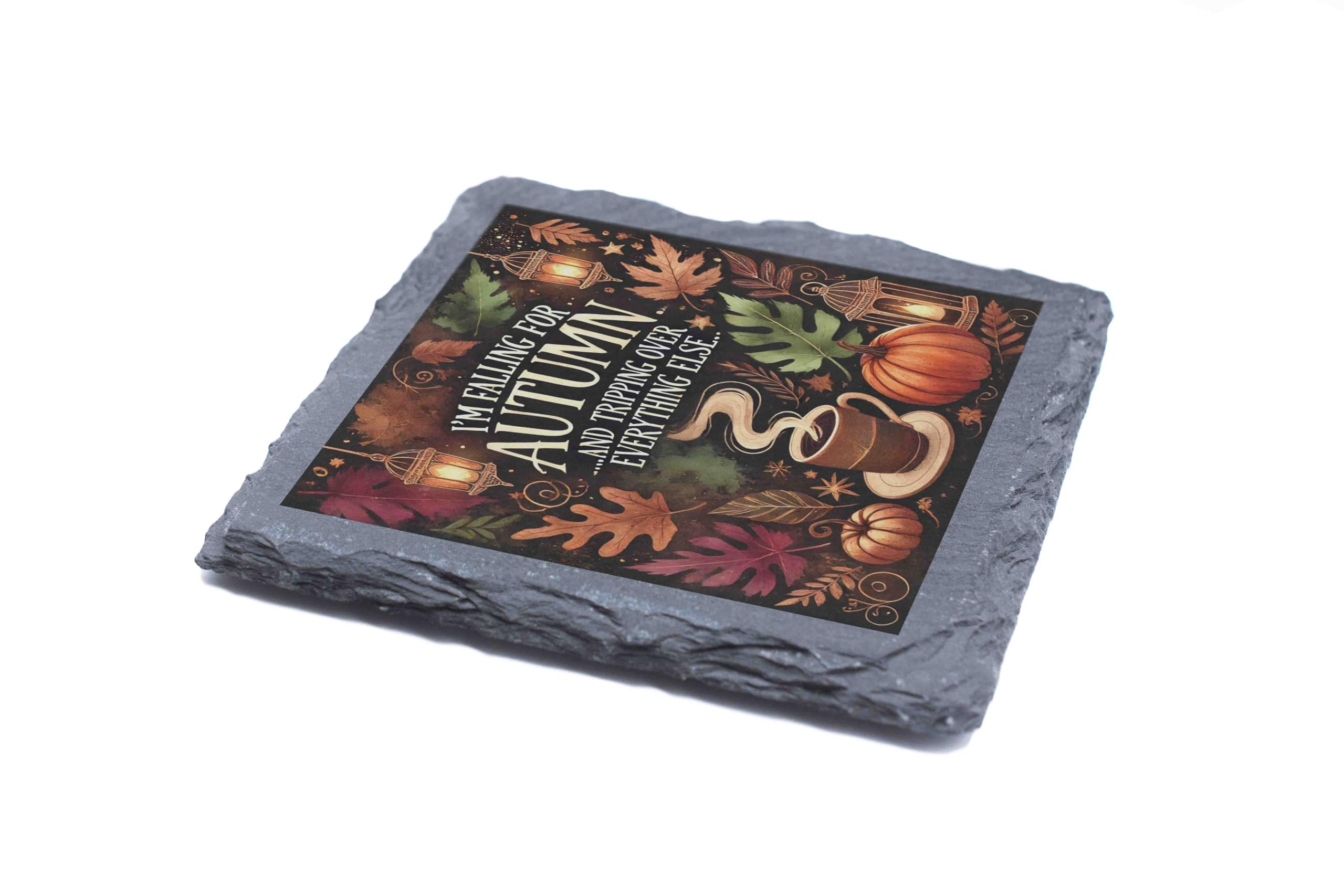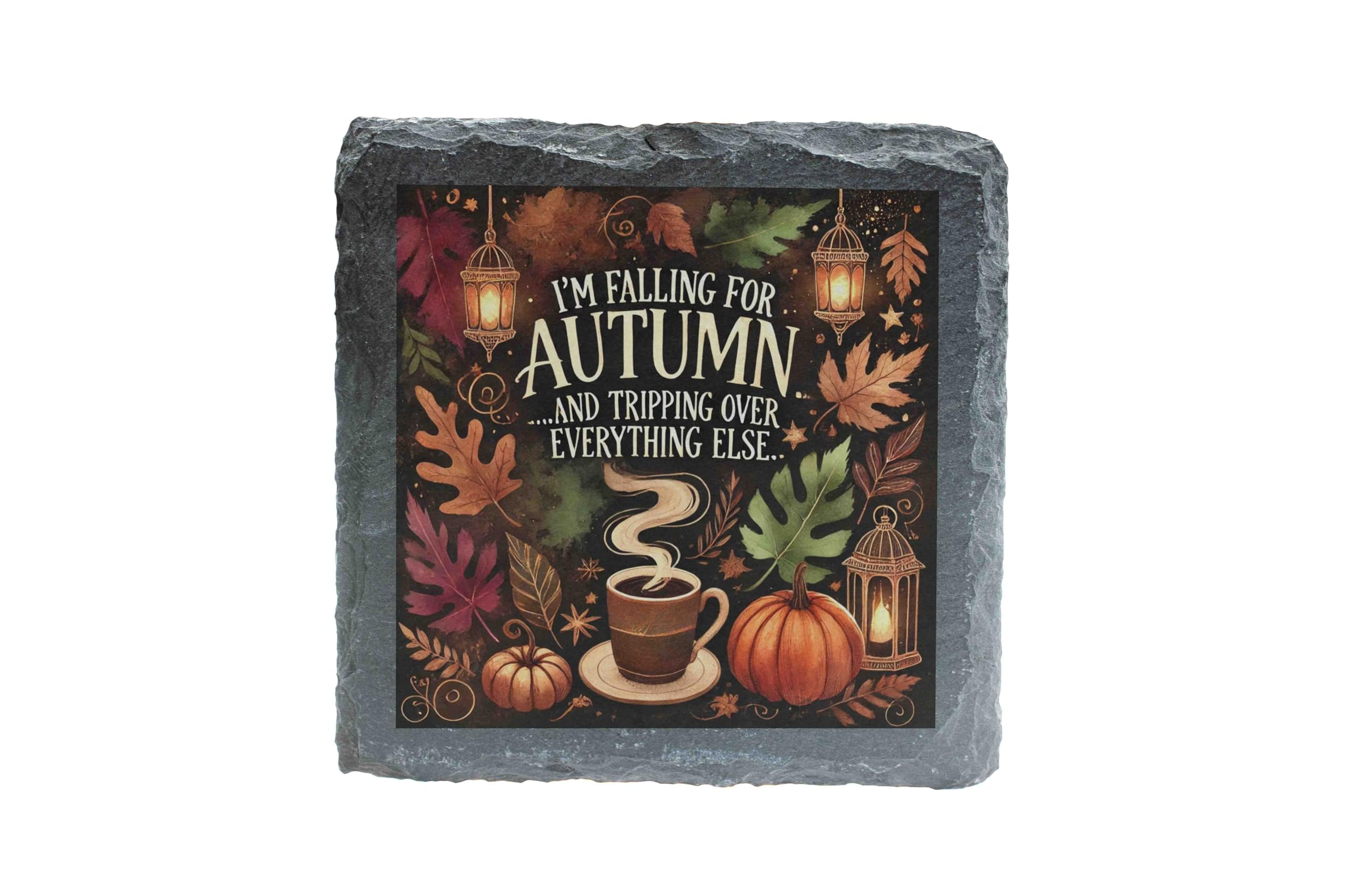 Capture the essence of autumn with this delightful slate coaster that combines humor and seasonal beauty. Featuring a charming fall-themed design of pumpkins, leaves, and cozy coffee, this coaster adds a touch of warmth to your space. The natural slate material is both durable and stylish, with textured edges that enhance its rustic appeal. Whether you're sipping pumpkin spice lattes or entertaining friends, this coaster is the perfect seasonal companion. With a soft backing to protect surfaces and keep it steady, it?s practical and decorative. It?s also a wonderful gift for those who can?t get enough of the cozy fall season. Embrace the autumn spirit today!