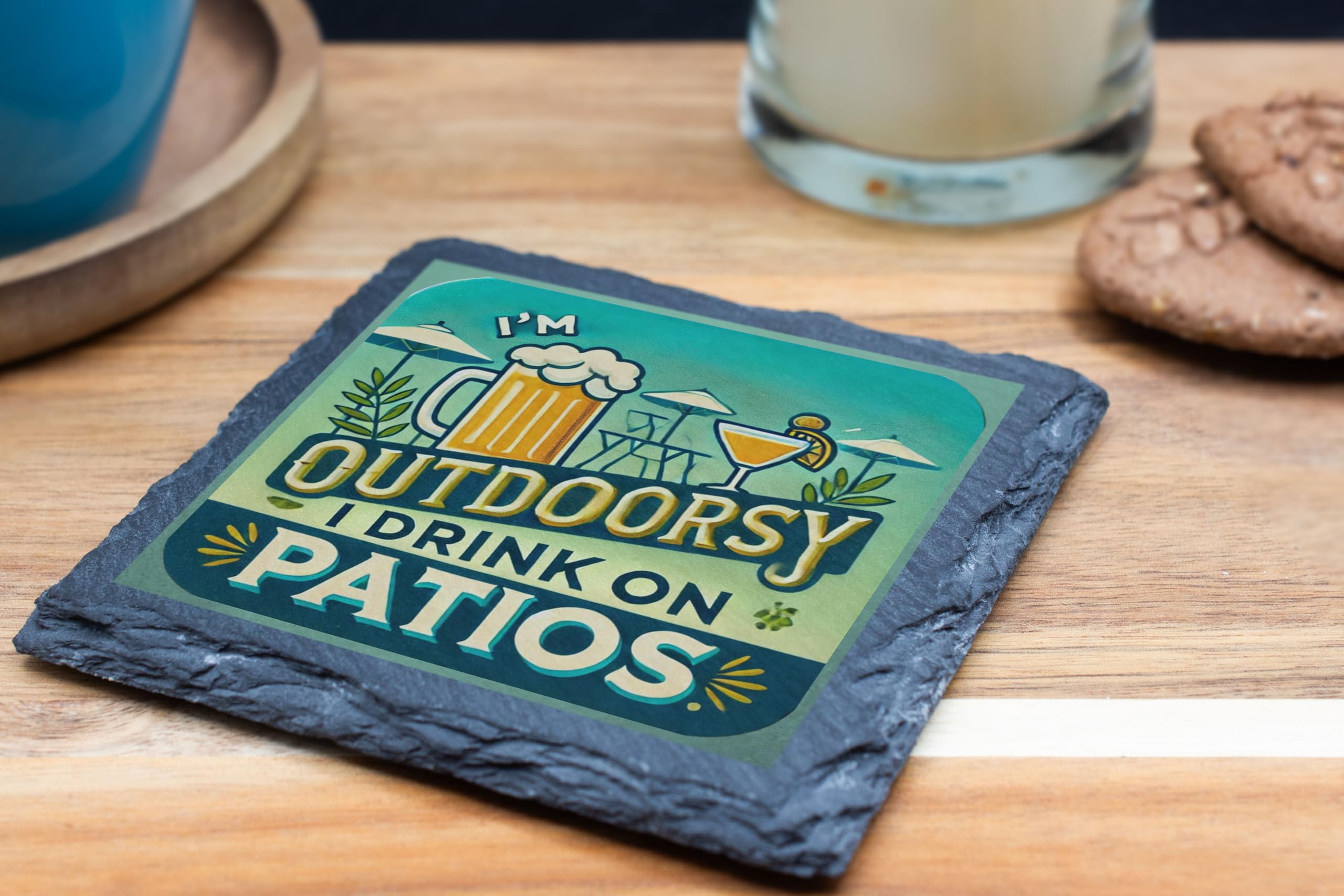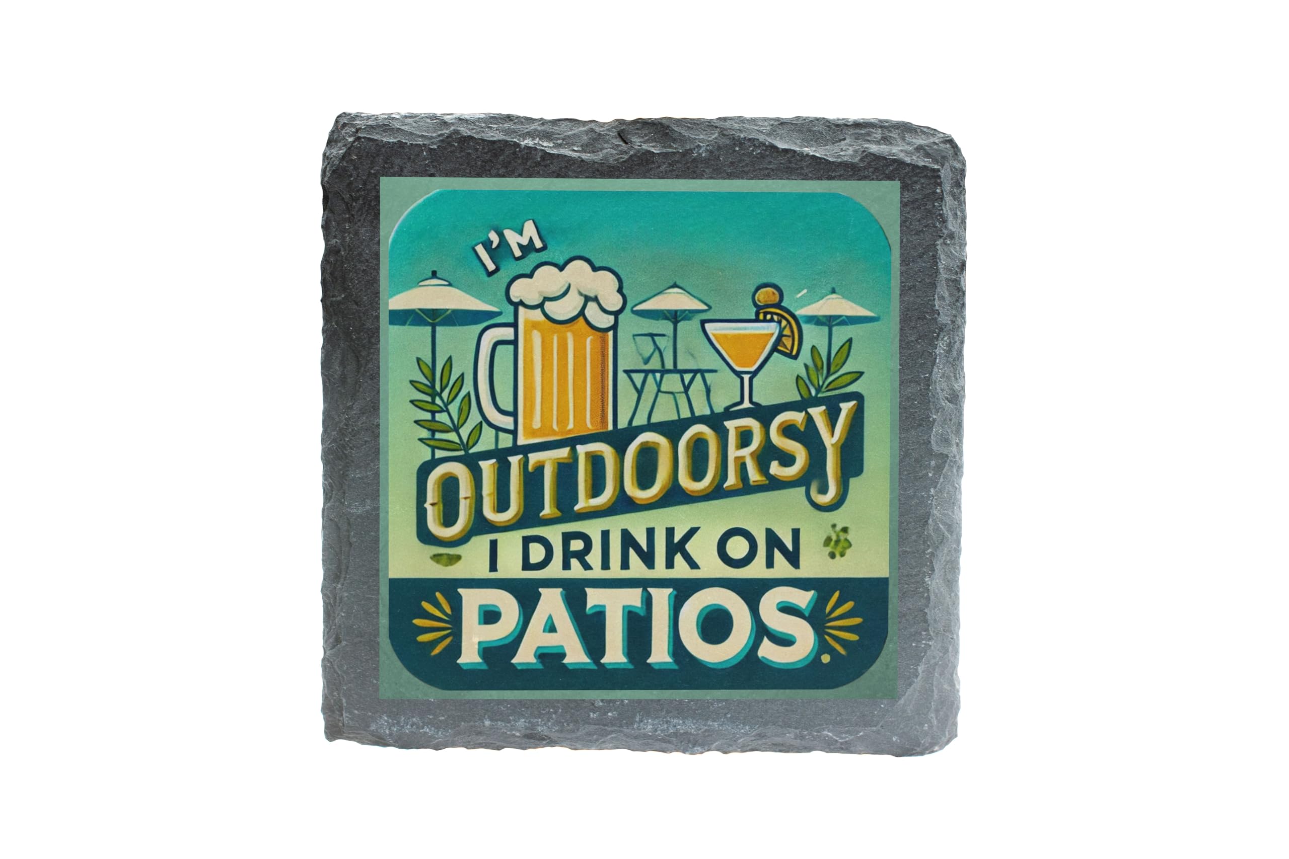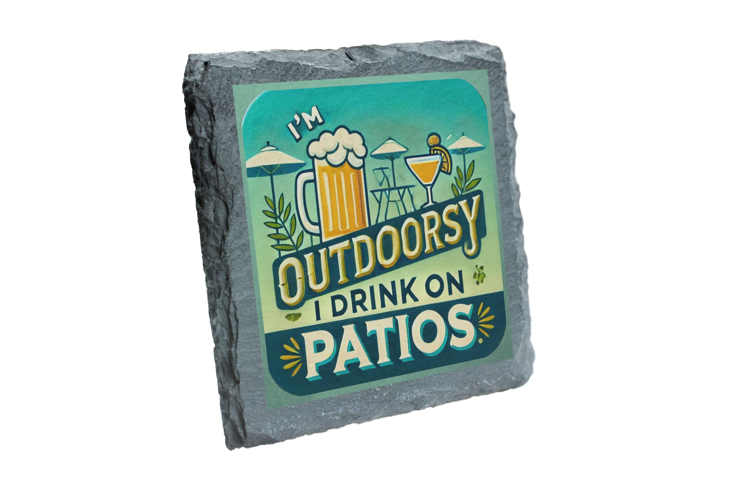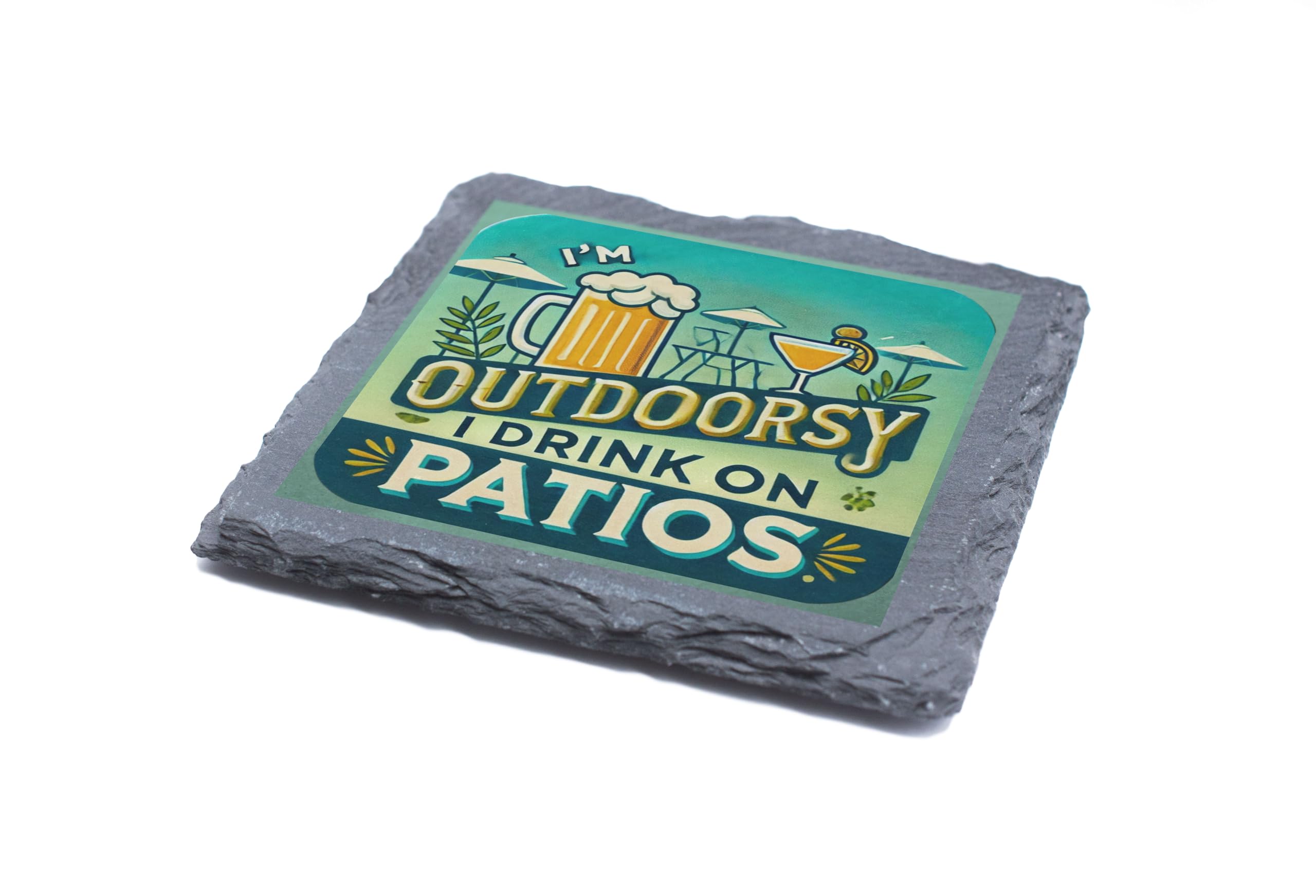 Celebrate your love for patios and good humor with this slate coaster, featuring the witty quote, "I'm Outdoorsy - I Drink on Patios." Perfect for drink enthusiasts who enjoy spending time outdoors (or close to it), this coaster combines laughter with functionality. Crafted from natural slate, its rugged edges and durable material make it both stylish and practical. Ideal for protecting surfaces from spills and condensation, it's a great conversation starter for gatherings and an excellent gift for friends who appreciate a good laugh. Add a dose of fun to your home bar or patio setup with this unique coaster!