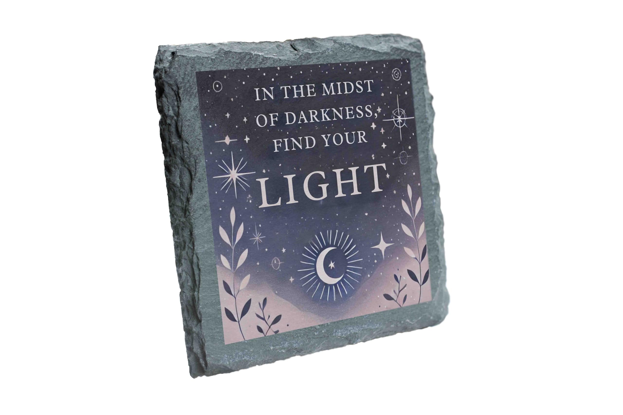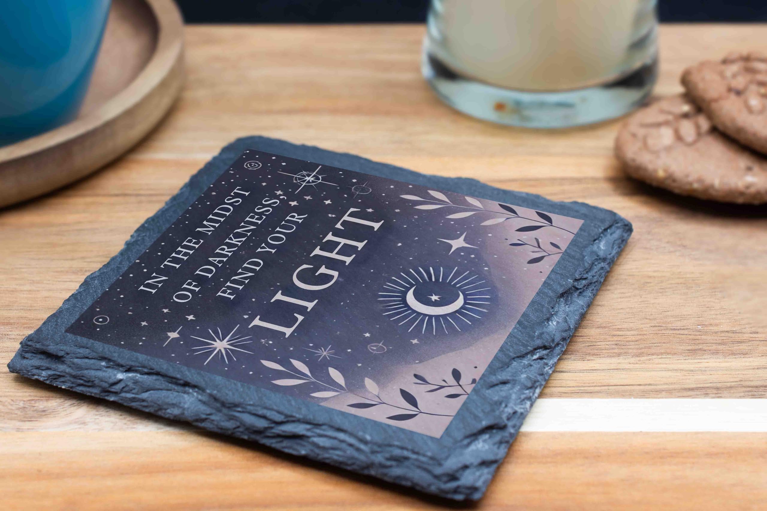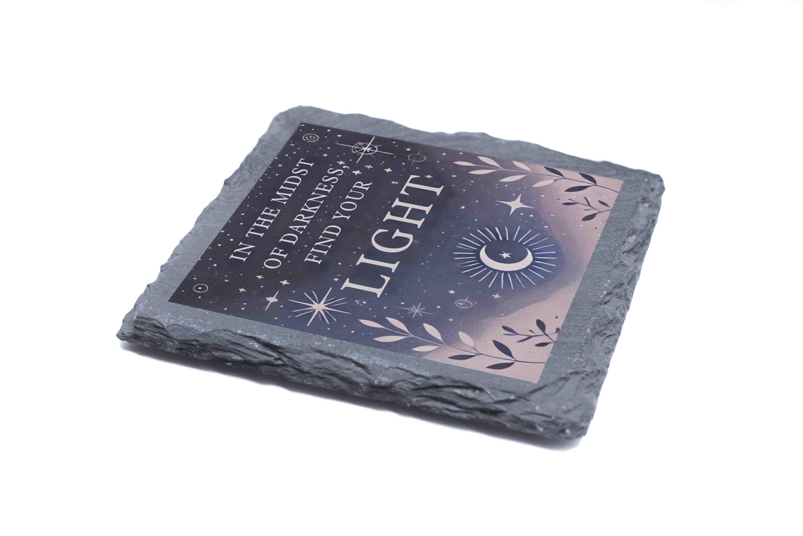 Illuminate any space with this beautiful slate coaster featuring an uplifting message to inspire strength and positivity. The celestial-themed design with stars, the moon, and botanical accents evokes a sense of calm and hope, making it a perfect addition to your home or office d?cor. Crafted from durable natural slate with a textured edge, this coaster is both functional and decorative. It's an ideal gift for loved ones going through tough times or for anyone who enjoys meaningful and motivational home accessories. Packaged sustainably, it?s ready to gift for birthdays, holidays, or just because.