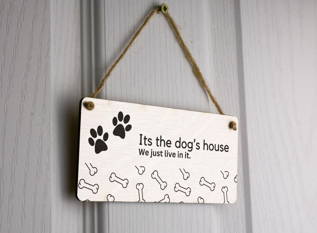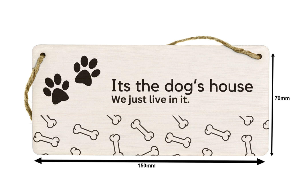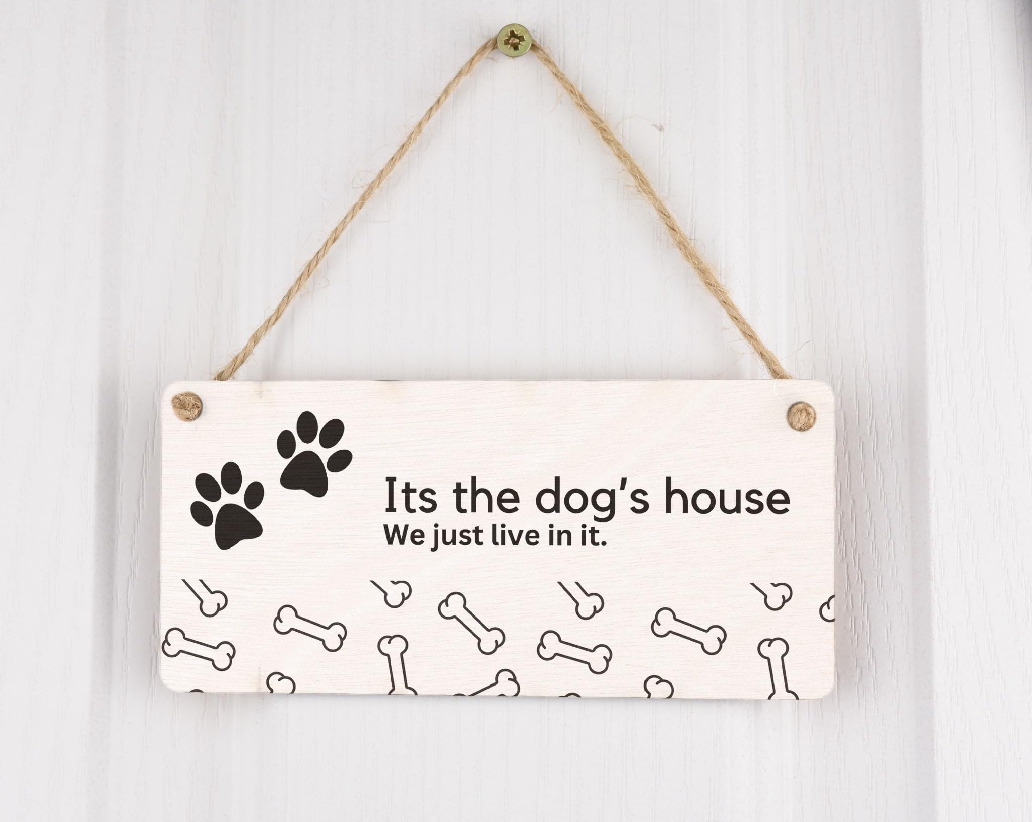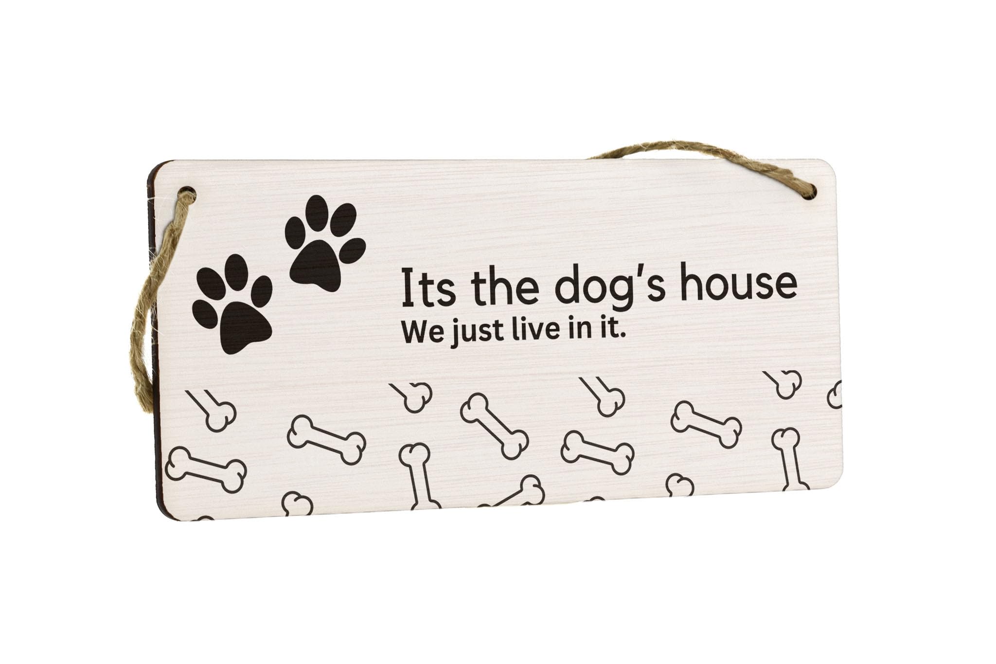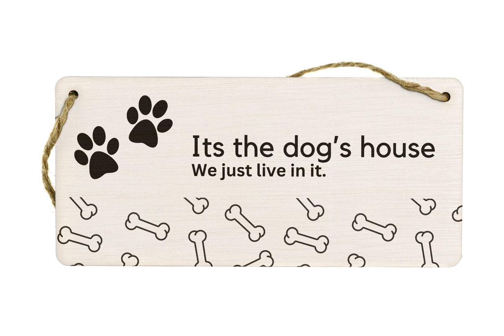 Introducing our Plywood Hanging Sign - Home Decor for Dog Lovers and Owners: 'It's the Dogs House, We Just Live in It'! This unique and charming sign is the perfect gift for family and friends who are passionate about their furry companions. Crafted from quality plywood, this sign features a sleek black and white design with adorable images of dog bones and pawprints. The white background beautifully contrasts with the bold black writing, adding a touch of elegance to any space. Whether placed on a door or in a room, this hanging sign is sure to make a statement and bring a smile to the faces of dog owners and lovers alike. Add a touch of warmth and love to your home with our Plywood Hanging Sign, a true gem for all dog enthusiasts.
