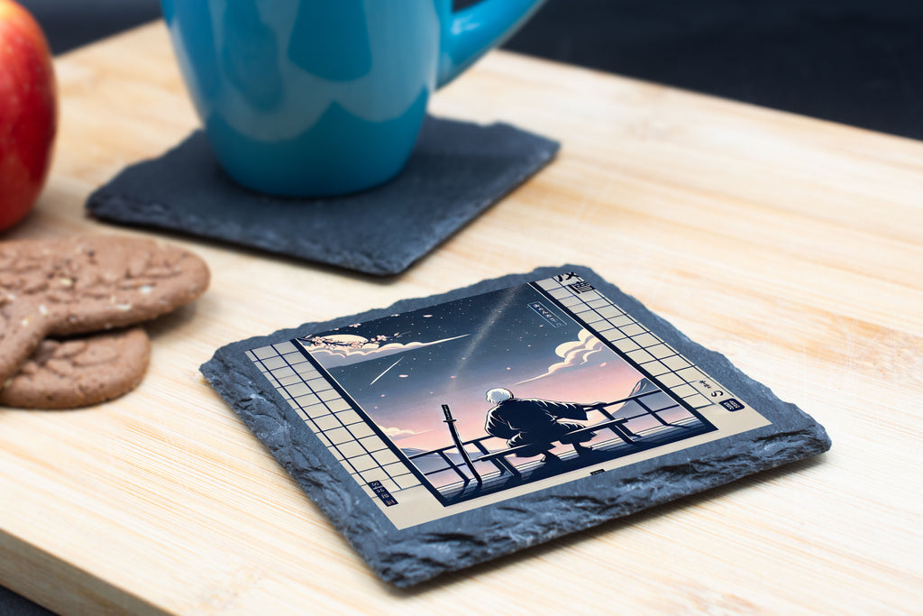 This beautifully crafted slate coaster features a serene Japanese-inspired design, showcasing a samurai contemplating a stunning moonlit landscape. The artwork is printed on a natural stone surface, adding an elegant touch to any space. Perfect for protecting surfaces while adding a unique and artistic element to your home or office, this coaster is both functional and visually appealing. Its high-quality material ensures durability, while the intricate design brings a sense of calm and tranquility to your environment. Ideal for any lover of art, nature, or Japanese culture.