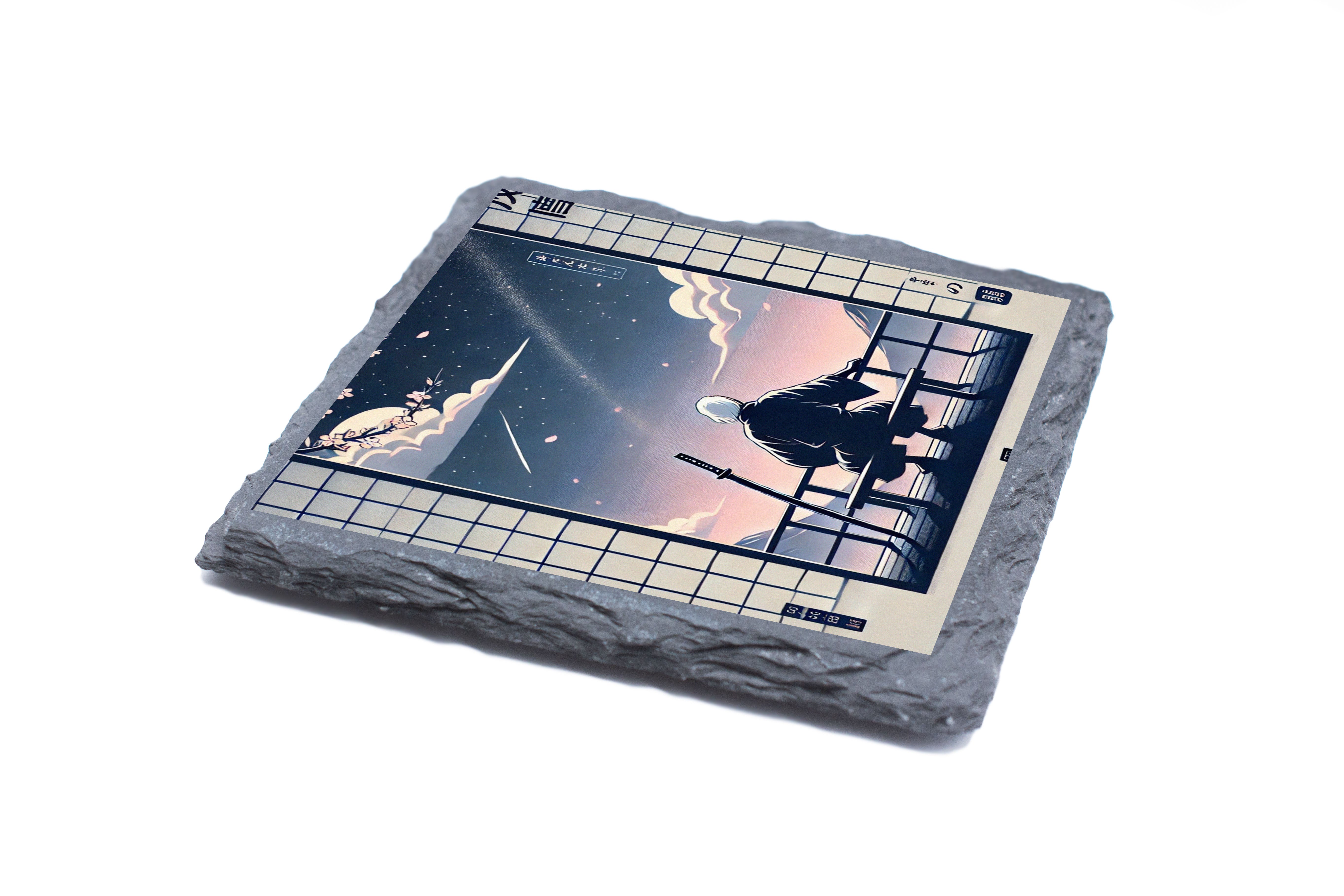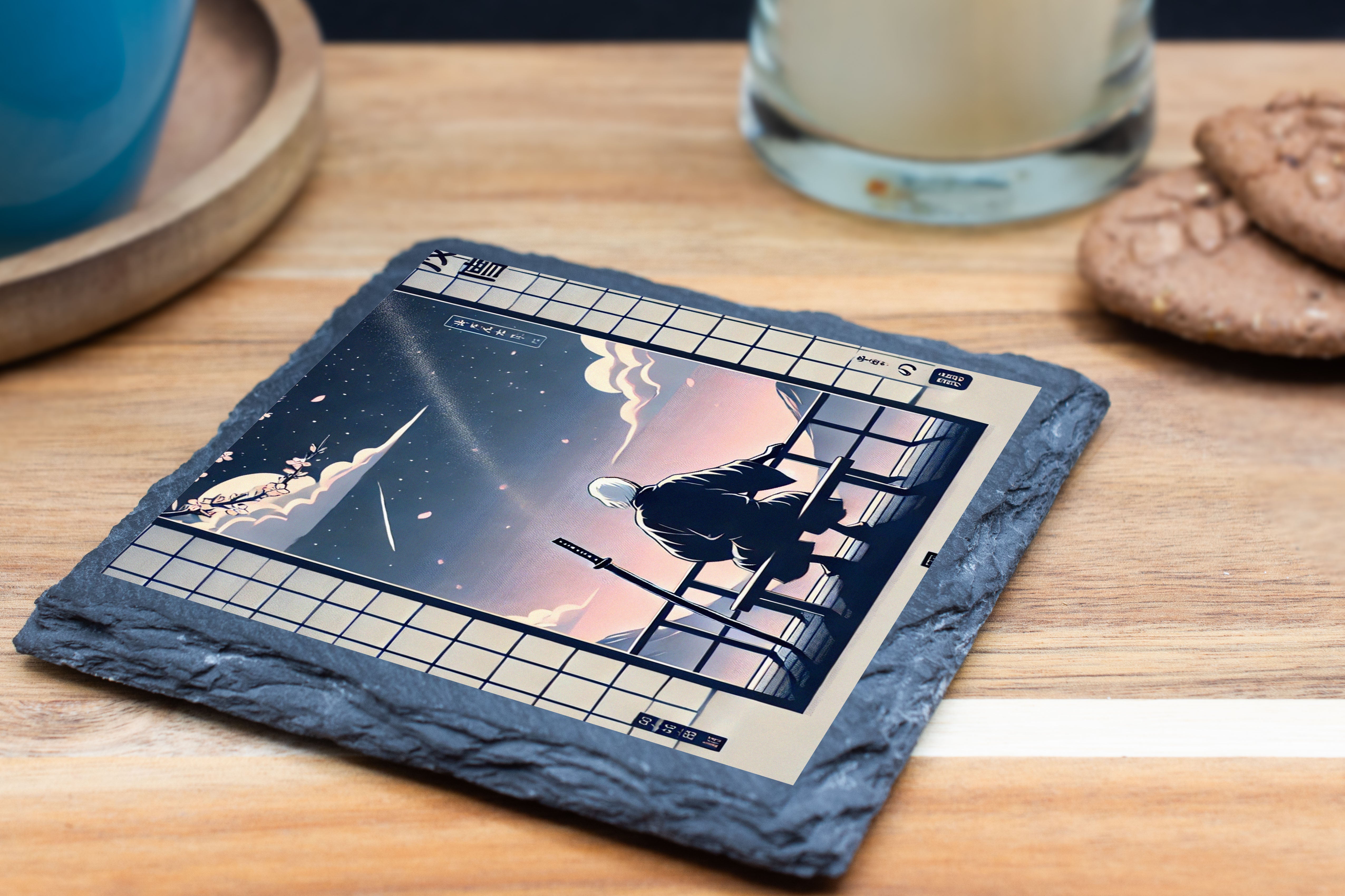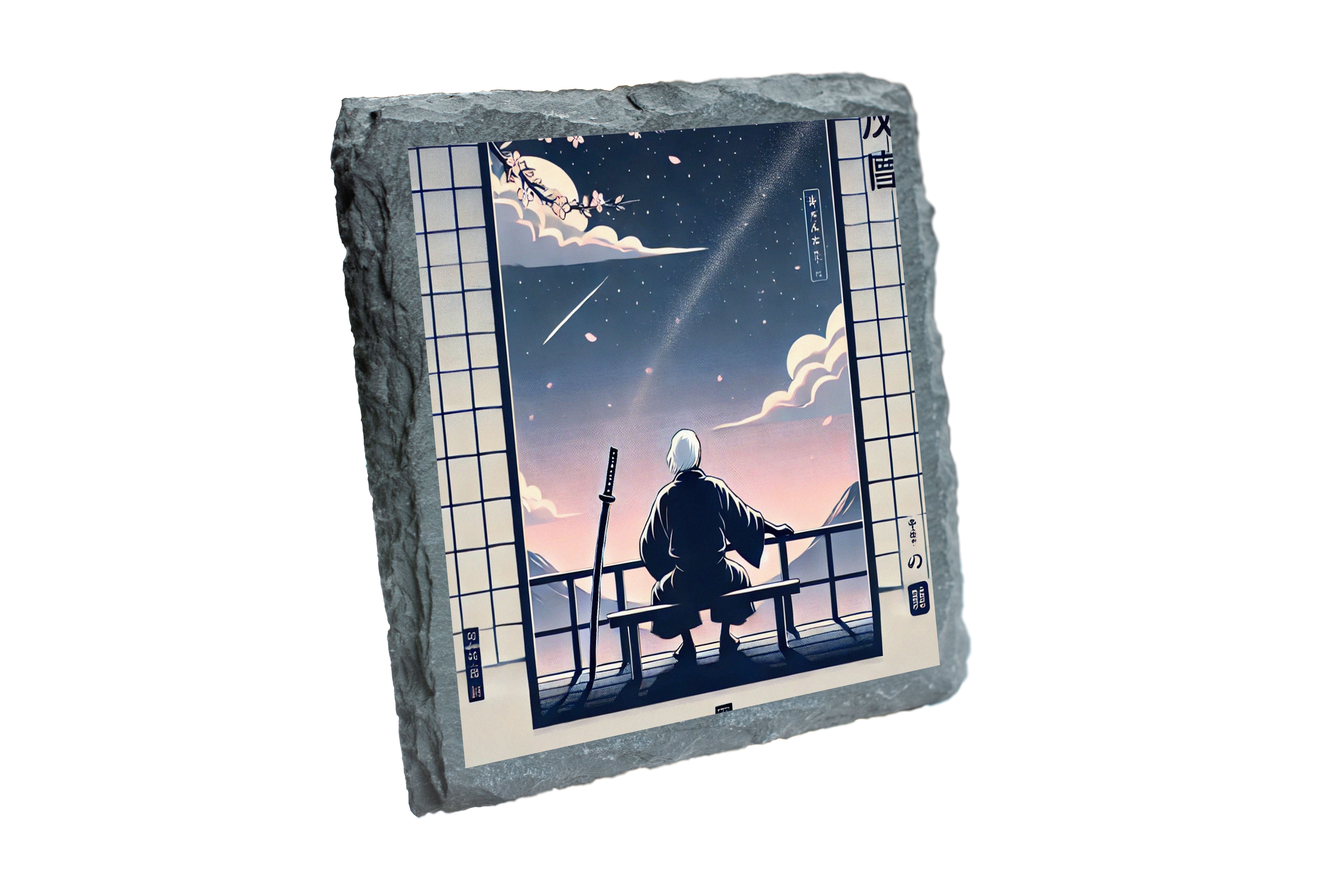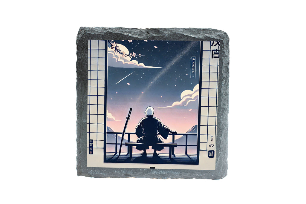This beautifully crafted slate coaster features a serene scene of a samurai contemplating the starry sky at sunset. The design combines traditional Japanese artistry with a peaceful, tranquil vibe, making it the perfect addition to any home or office. Made from durable slate, this coaster is both functional and stylish, providing a stable surface for your drinks while adding an elegant touch to your space. Ideal for those who appreciate minimalist and zen-inspired decor, it’s a unique way to protect your surfaces while showcasing a piece of calming art.