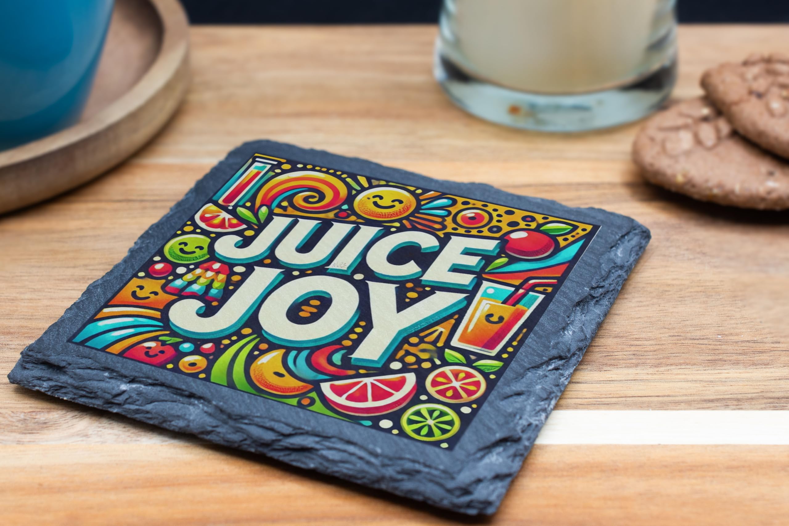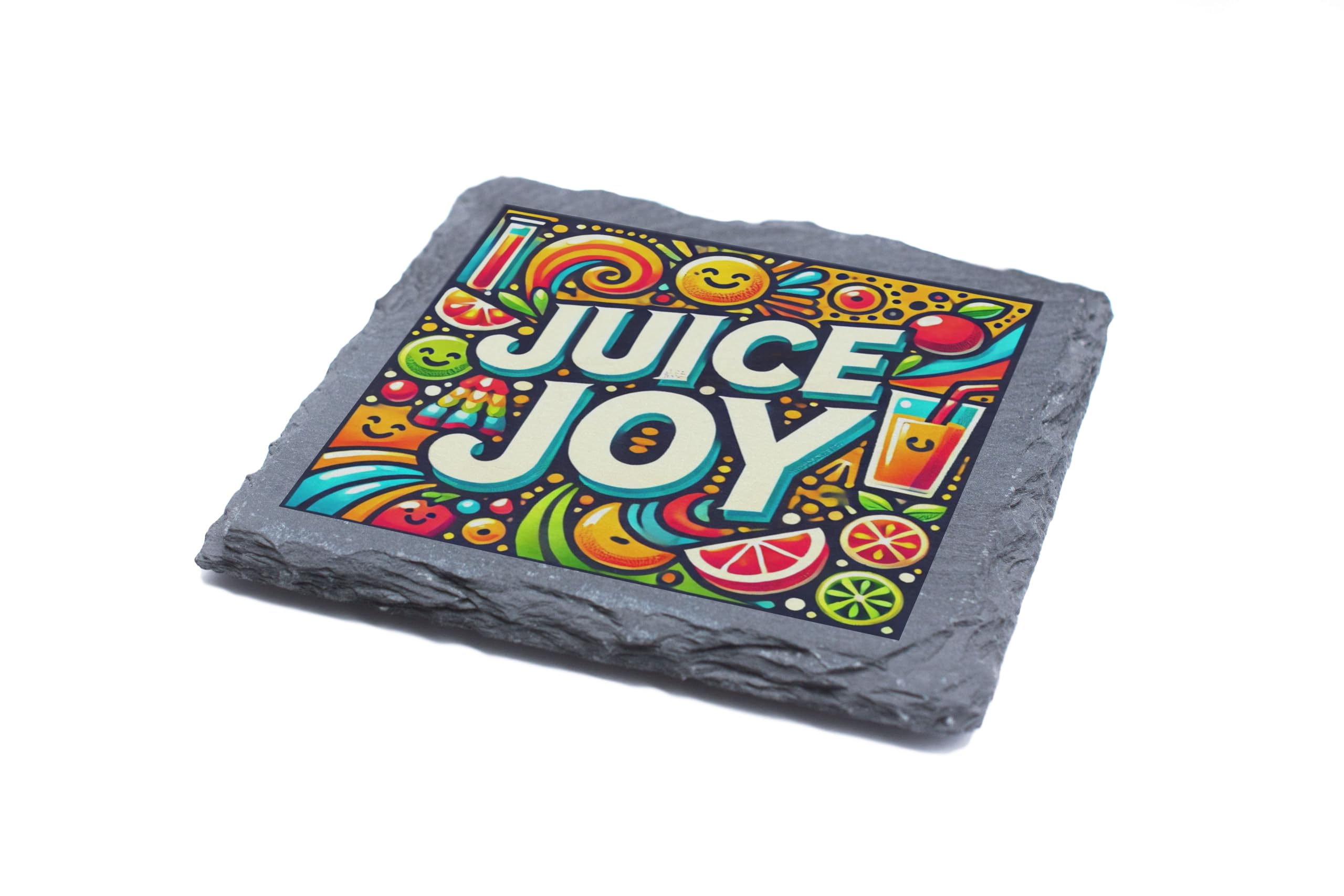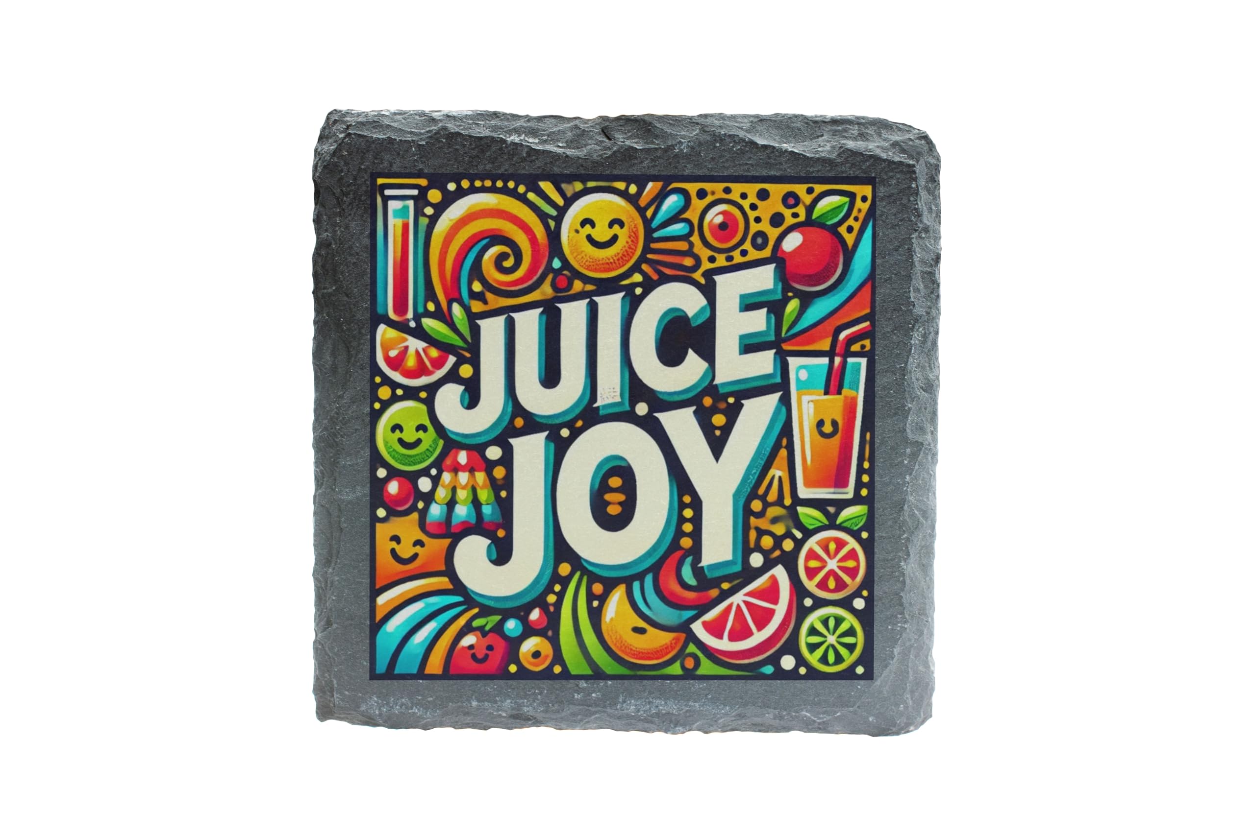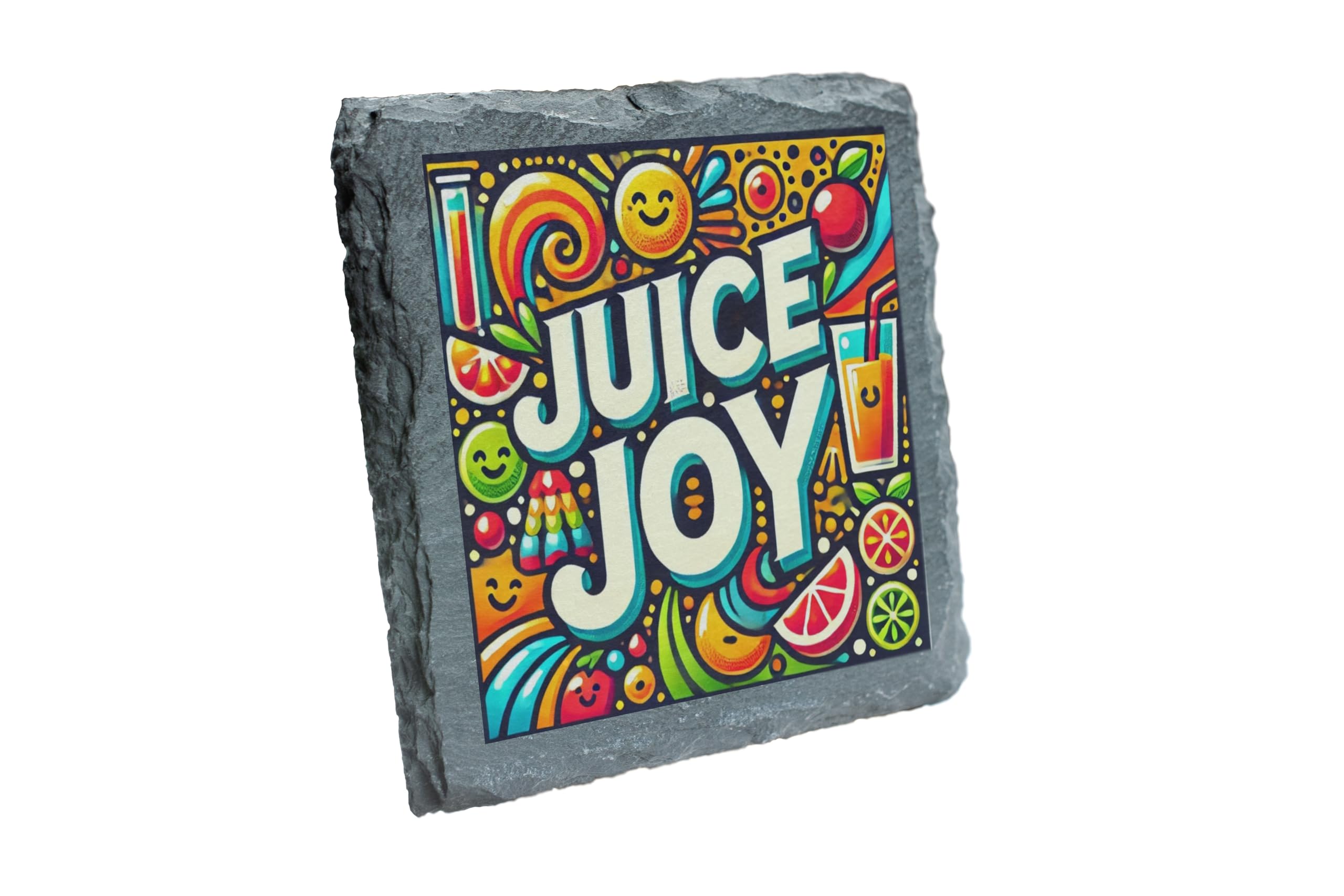 Bring a splash of color and joy to your home with the Juice Joy Slate Drinks Coaster. This beautifully designed coaster features a vibrant fruit and beverage-inspired print, making it the perfect accessory for your coffee table, dining area, or home bar. Crafted from premium natural slate, this coaster not only elevates your decor but also offers superior functionality. Its non-slip base ensures it stays firmly in place, while its sturdy surface protects your furniture from spills, stains, and scratches. Whether you're serving up a refreshing juice or your favorite cocktail, this coaster is a fun and practical way to keep your surfaces safe. Looking for the perfect gift? The Juice Joy Coaster makes a thoughtful present for juice enthusiasts, party hosts, or anyone who appreciates a mix of style and function. Easy to clean and built to last, it's the ideal blend of fun and practicality for any home.