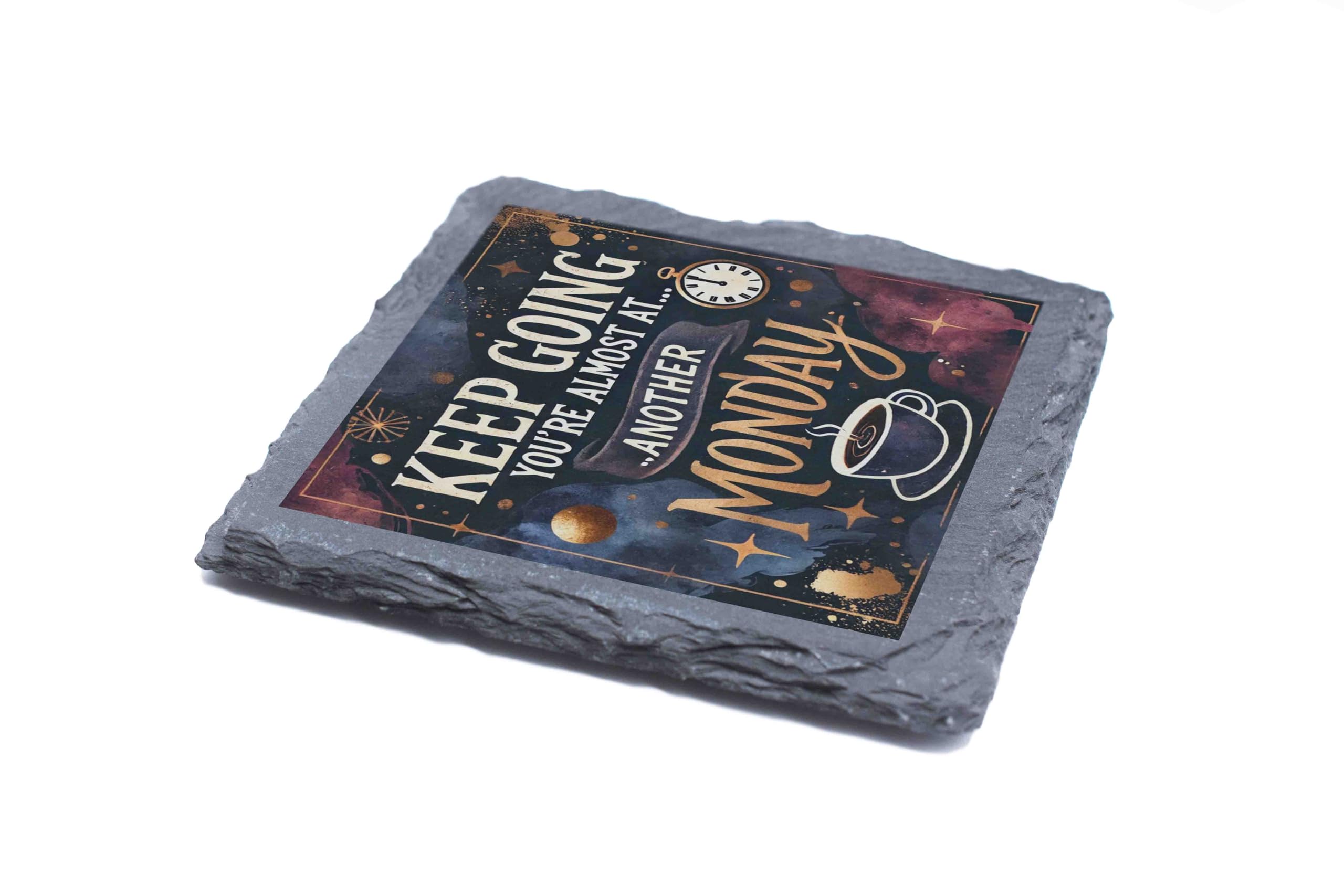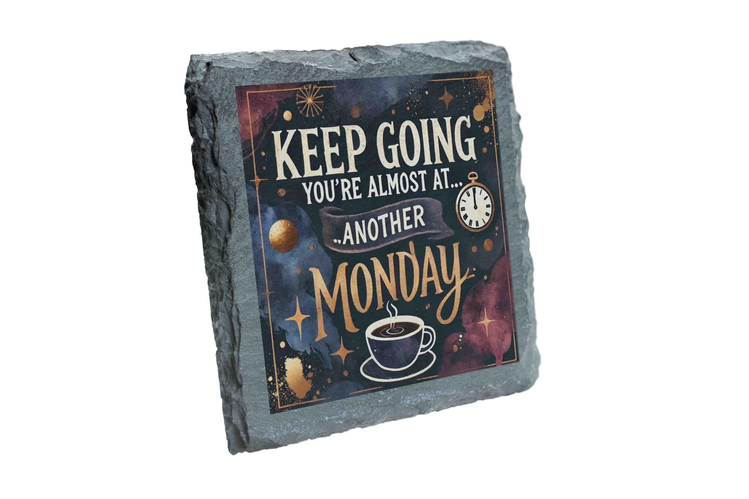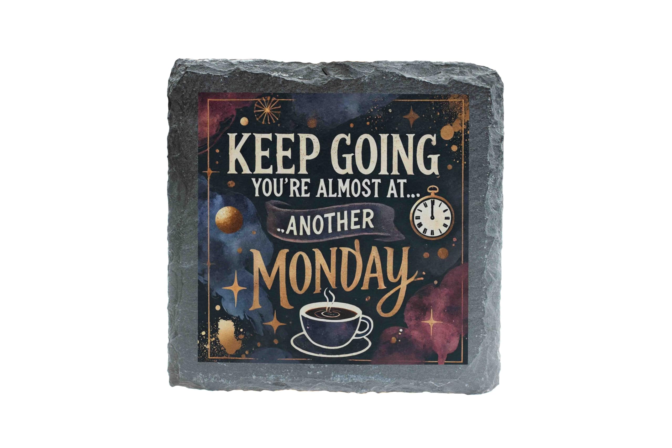 Add a touch of humor and style to your space with this "Keep Going, You?re Almost at? Another Monday" slate coaster. The celestial-themed design featuring stars, a clock, and a coffee cup is perfect for brightening up your desk, coffee table, or bar. Crafted from durable natural slate, this coaster not only protects your surfaces but also serves as a fun conversation starter. Ideal for gifting, it?s a lighthearted reminder that even Mondays can be tackled with a smile (and coffee). Stay inspired and amused all week long!