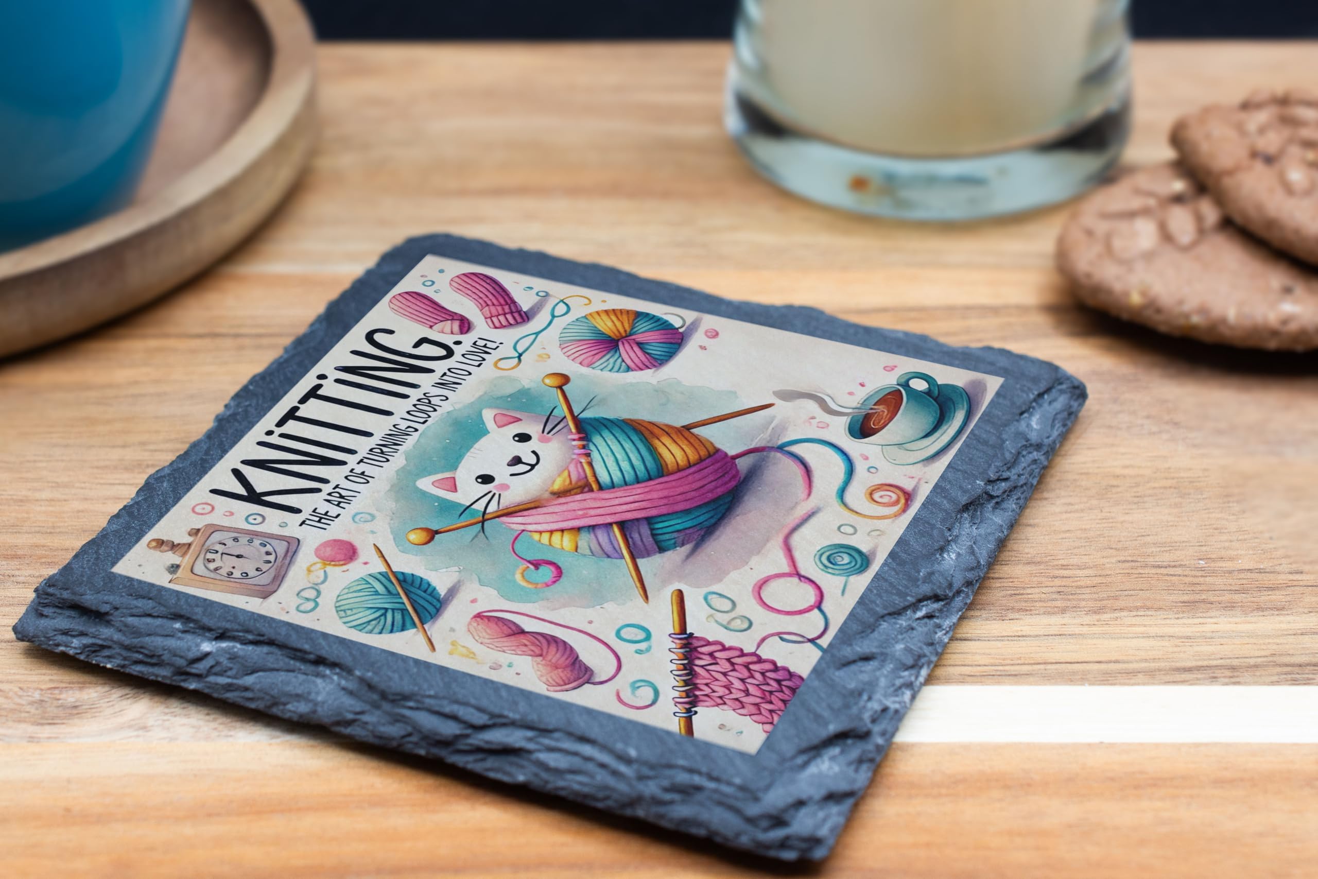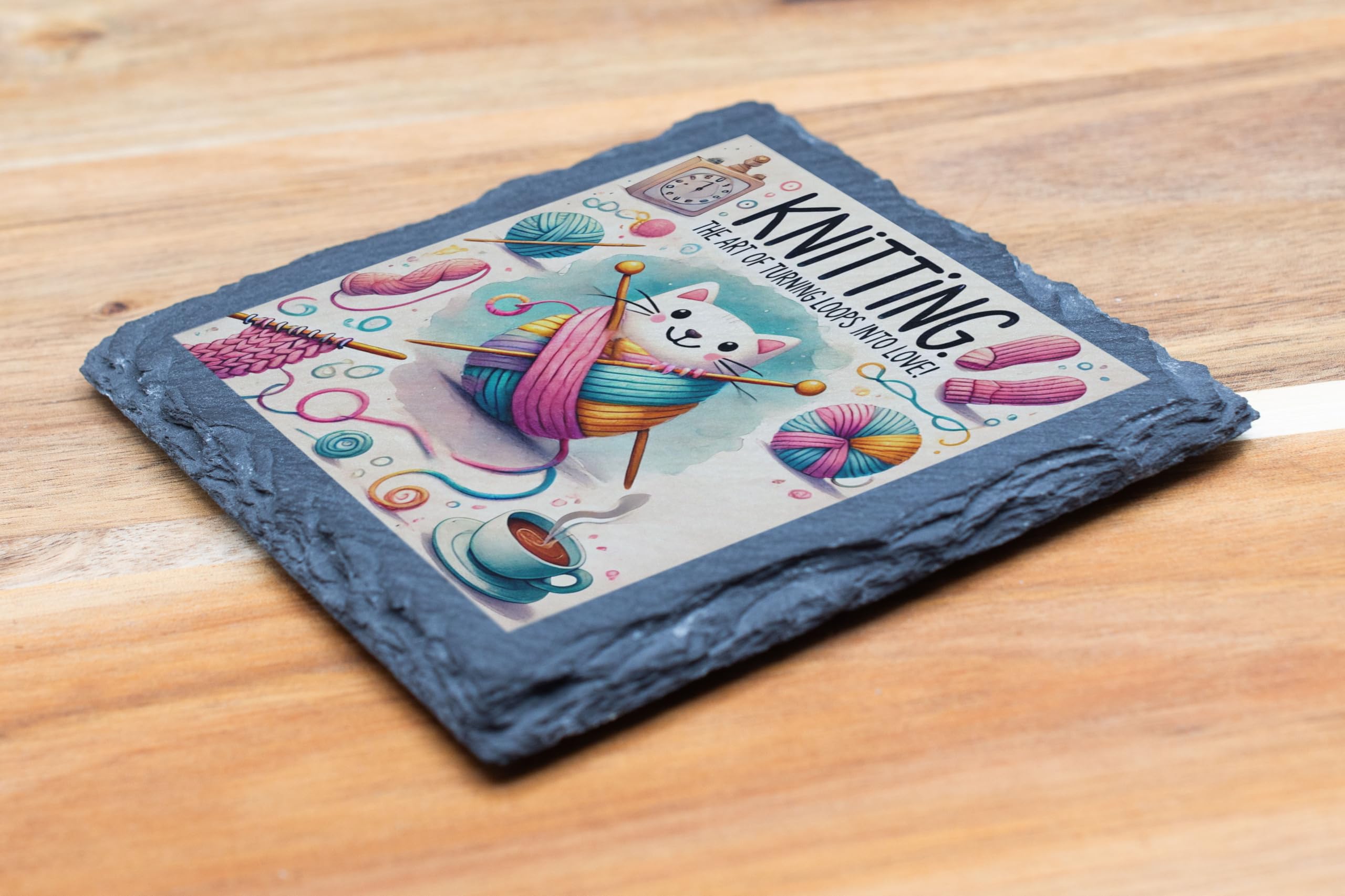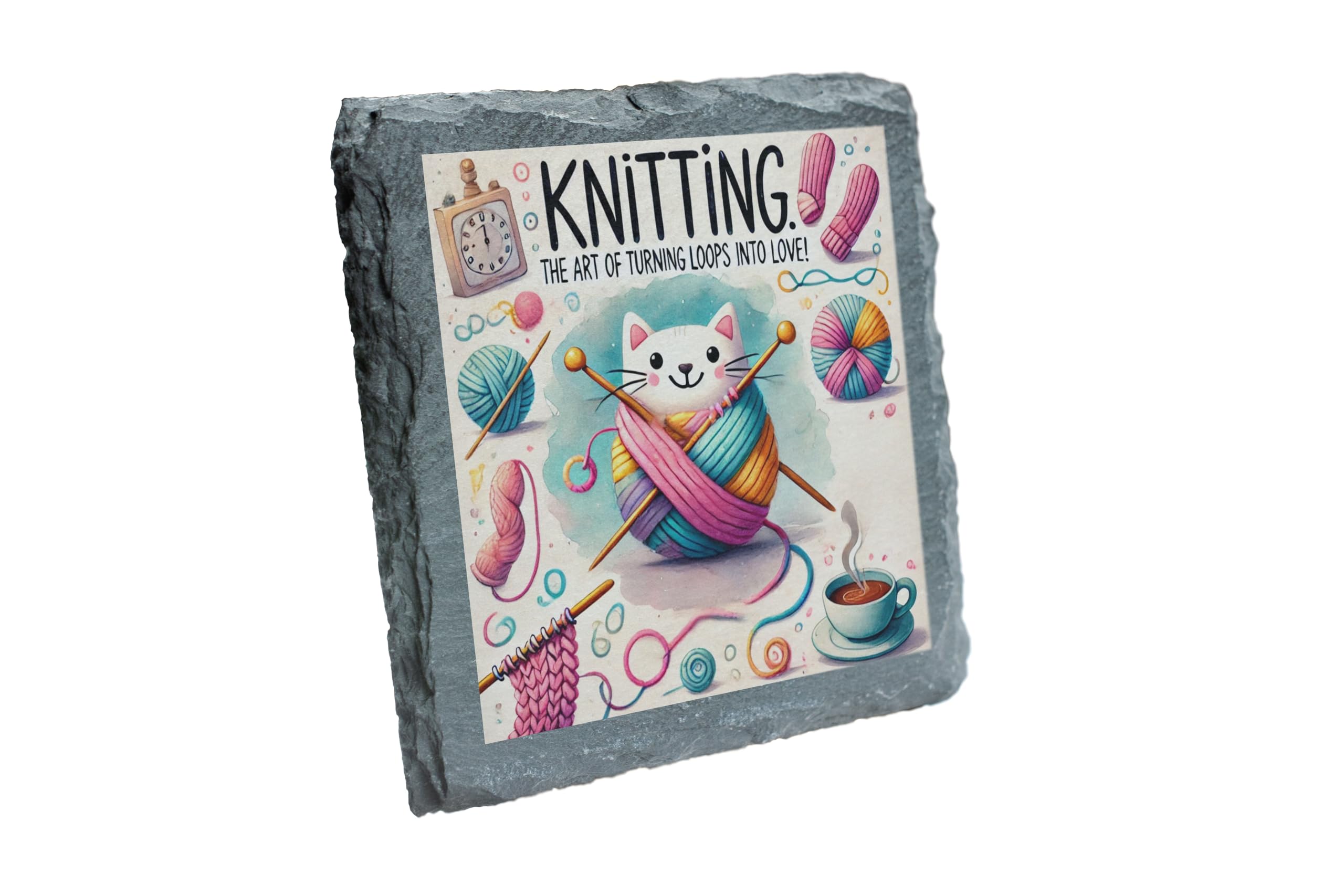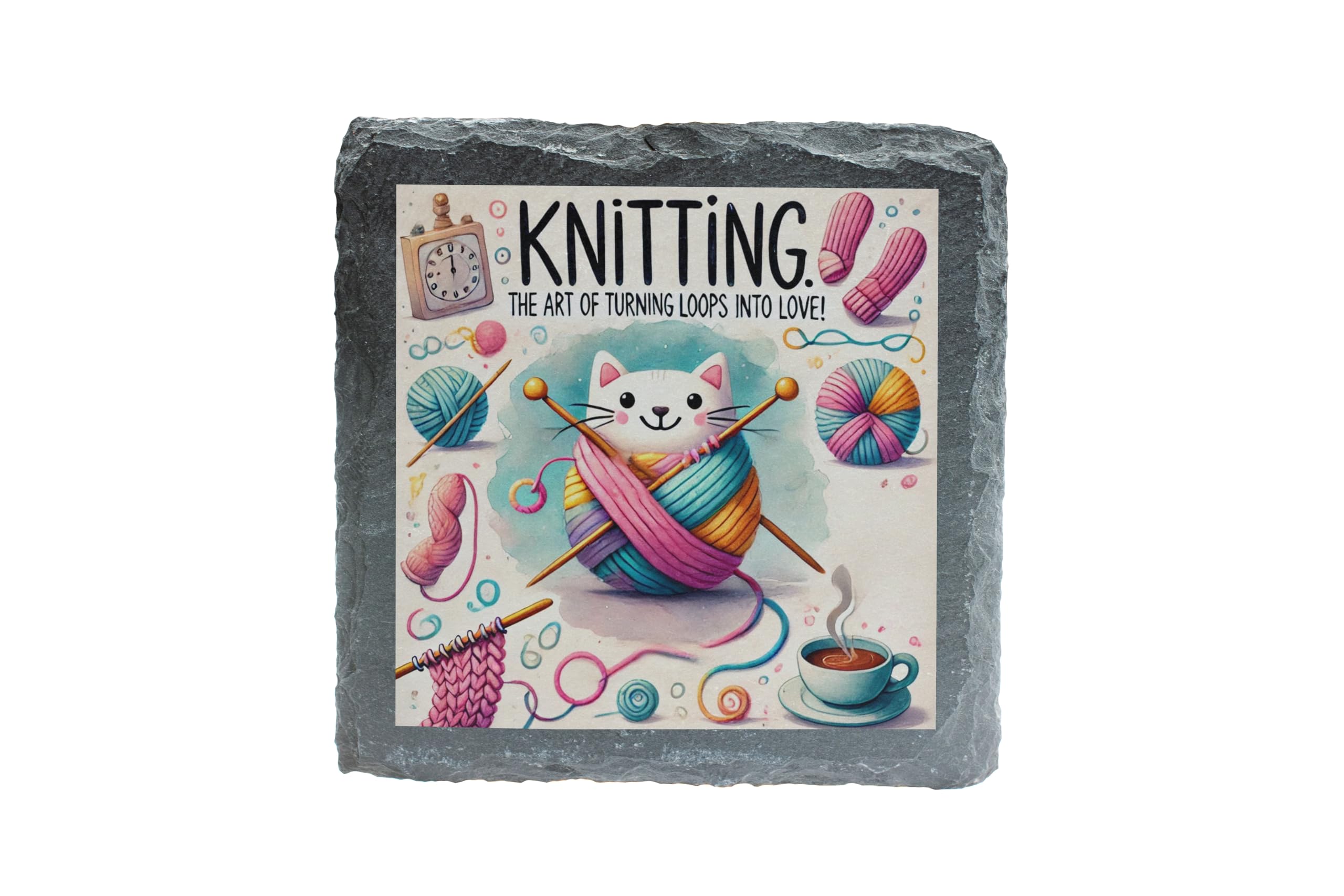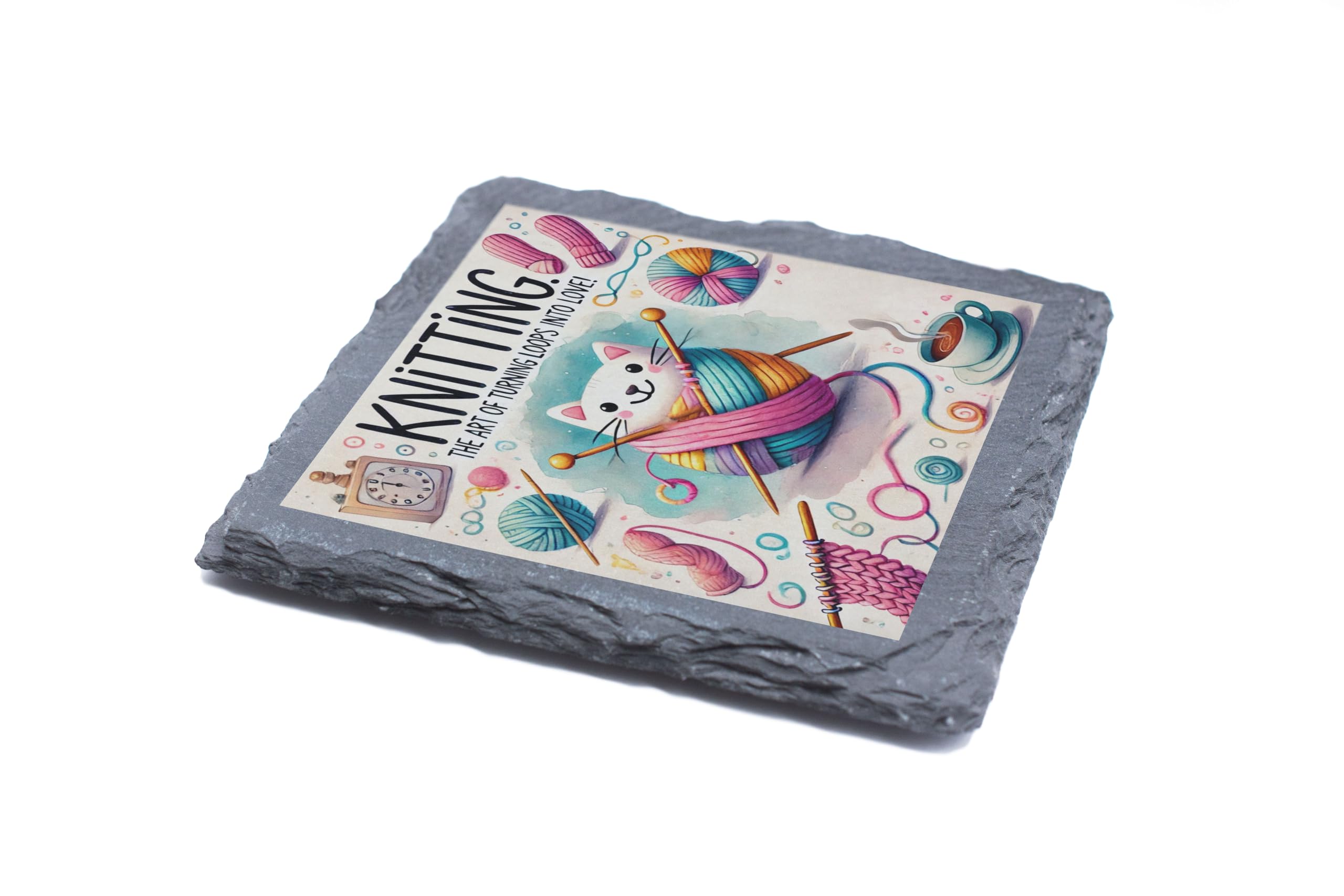 Celebrate the art of knitting with the "Knitting Cat" Artistic Slate Coaster. This whimsical design showcases a playful cat wrapped in colorful yarn, surrounded by knitting needles and craft-inspired elements. The perfect blend of functionality and charm, this coaster is a delightful addition to any tabletop, protecting surfaces while brightening up your space. Crafted from premium natural slate, it features a high-resolution, fade-resistant print that captures every detail of the design. Whether you're sipping coffee during a knitting session or looking for the ideal gift for the craft enthusiast in your life, this coaster is sure to delight. Add a touch of creativity and coziness to your home today!