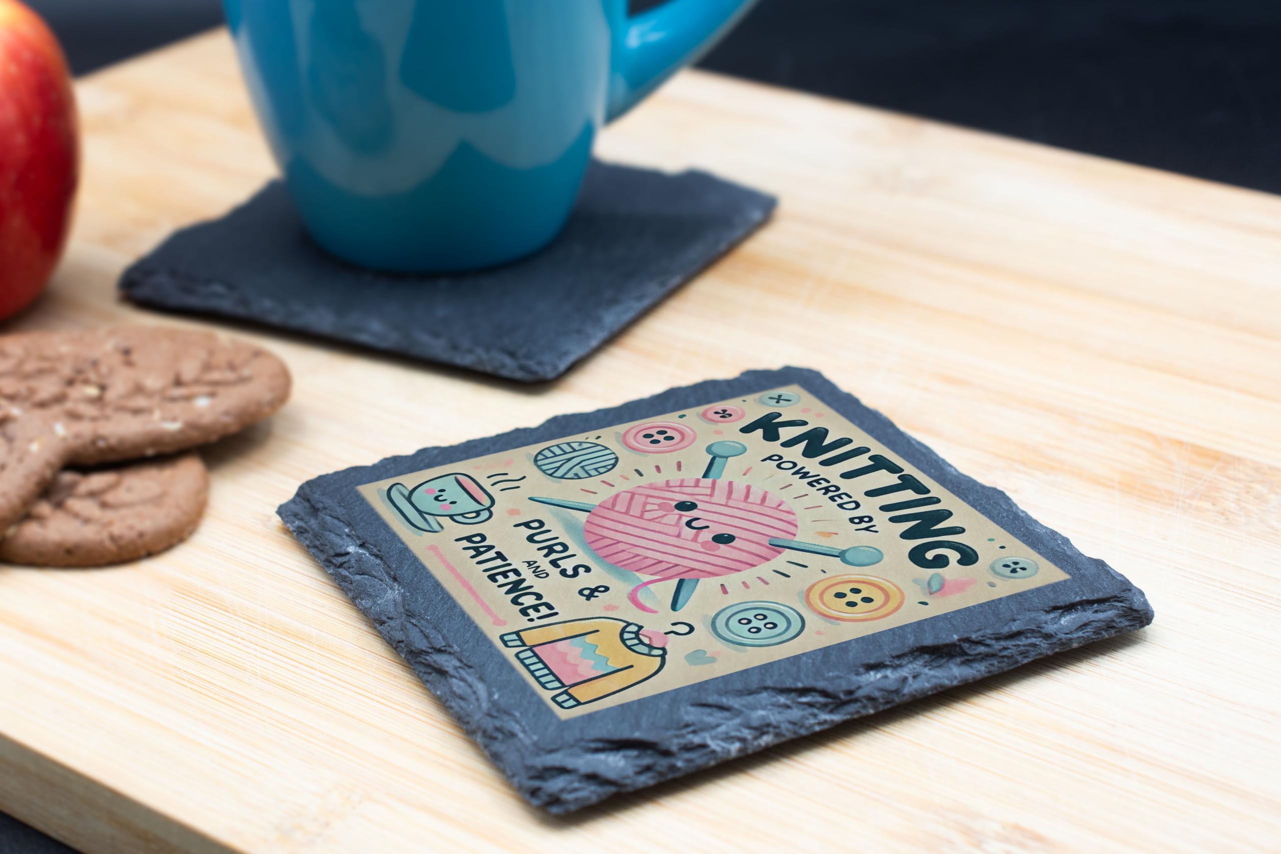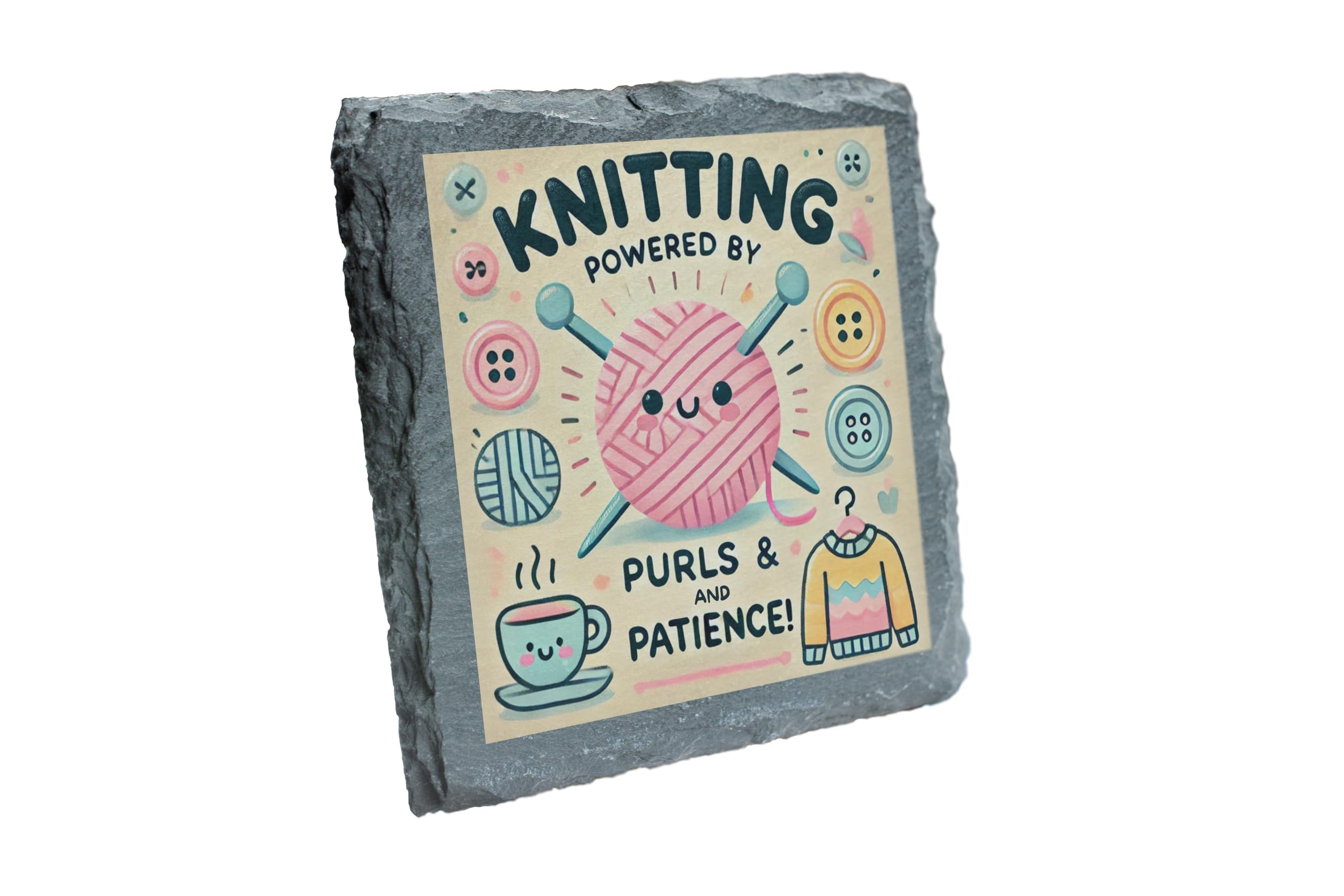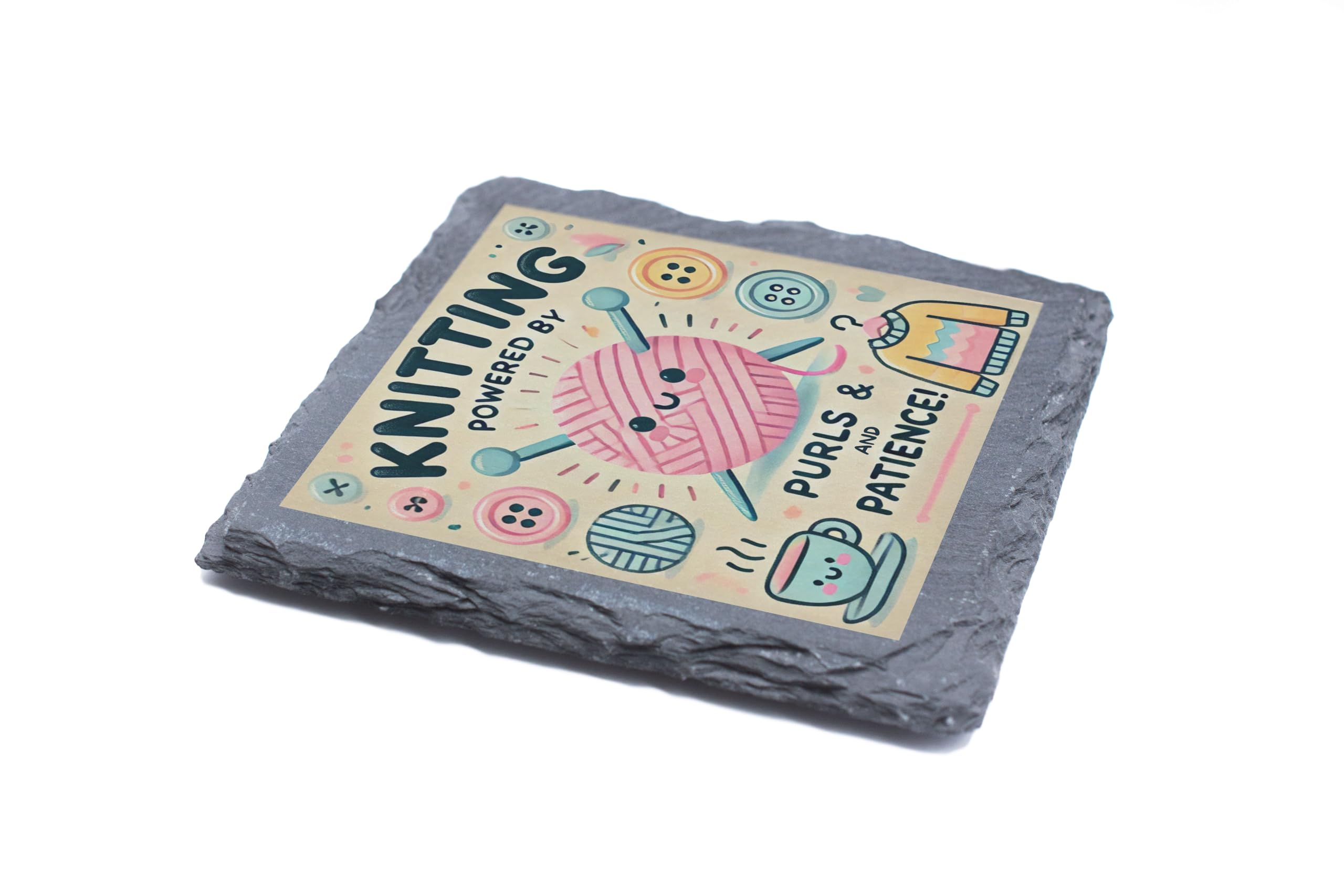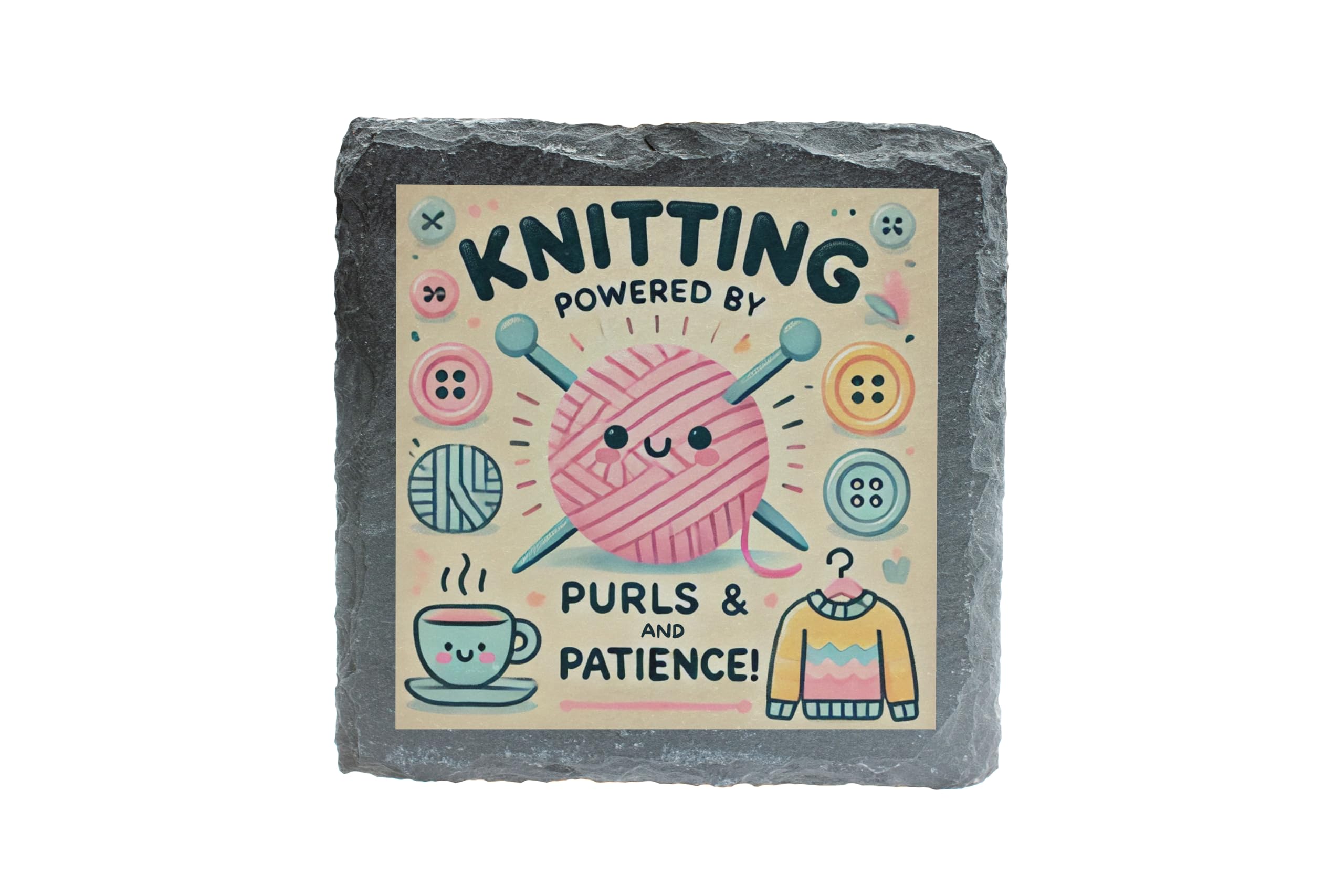 Knitting Slate Coaster - 'Powered by Purls and Patience' Design (slco-kf25-purlsknithg)