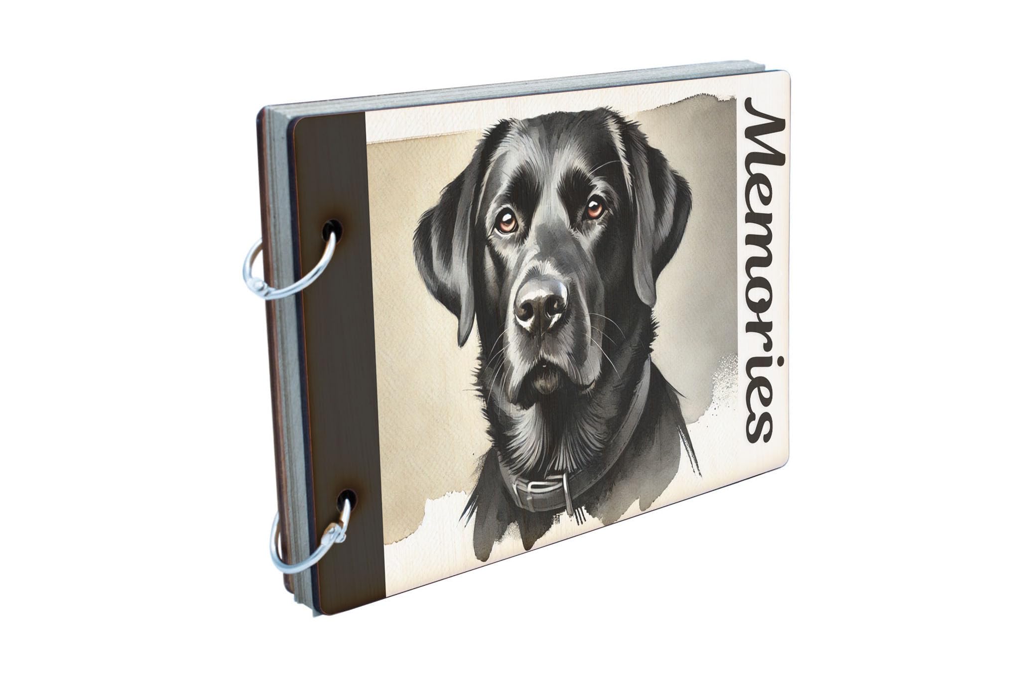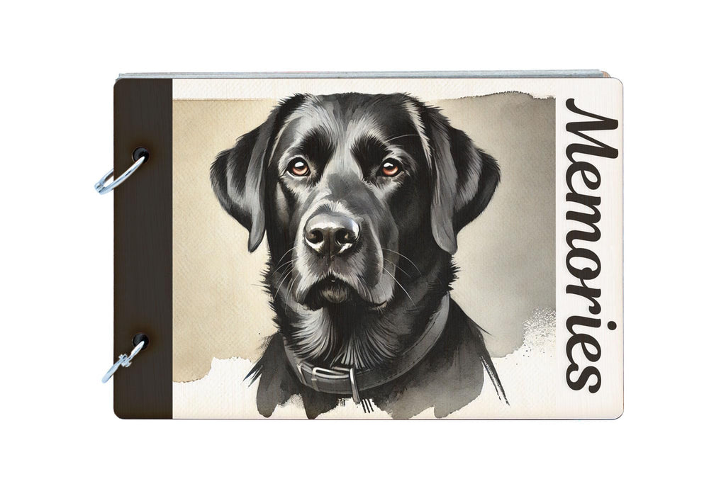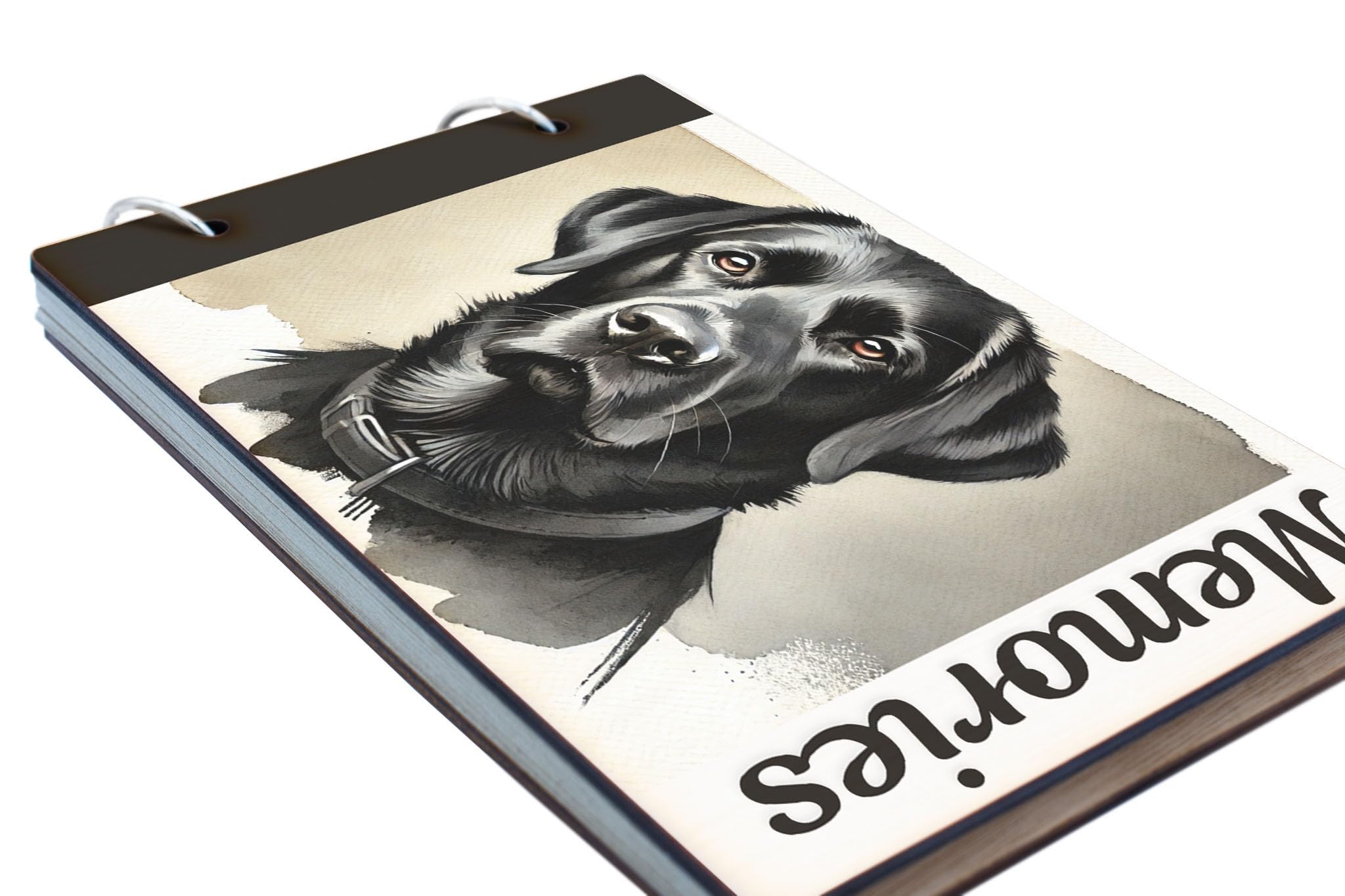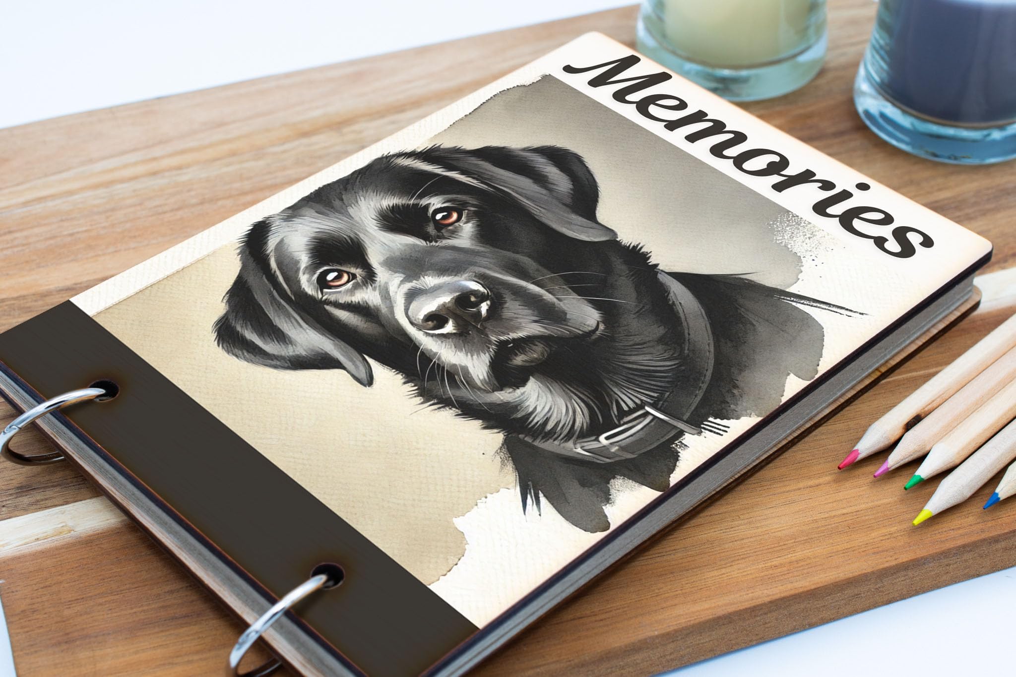 • Pet-themed memory album featuring a Black Labrador portrait and watercolor illustrations