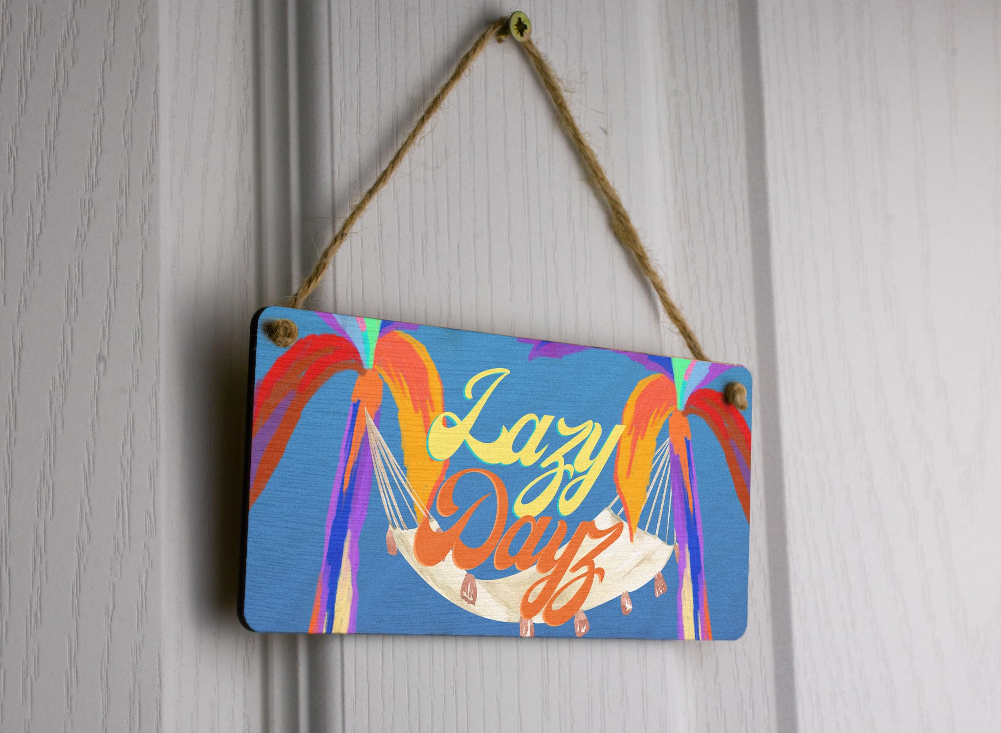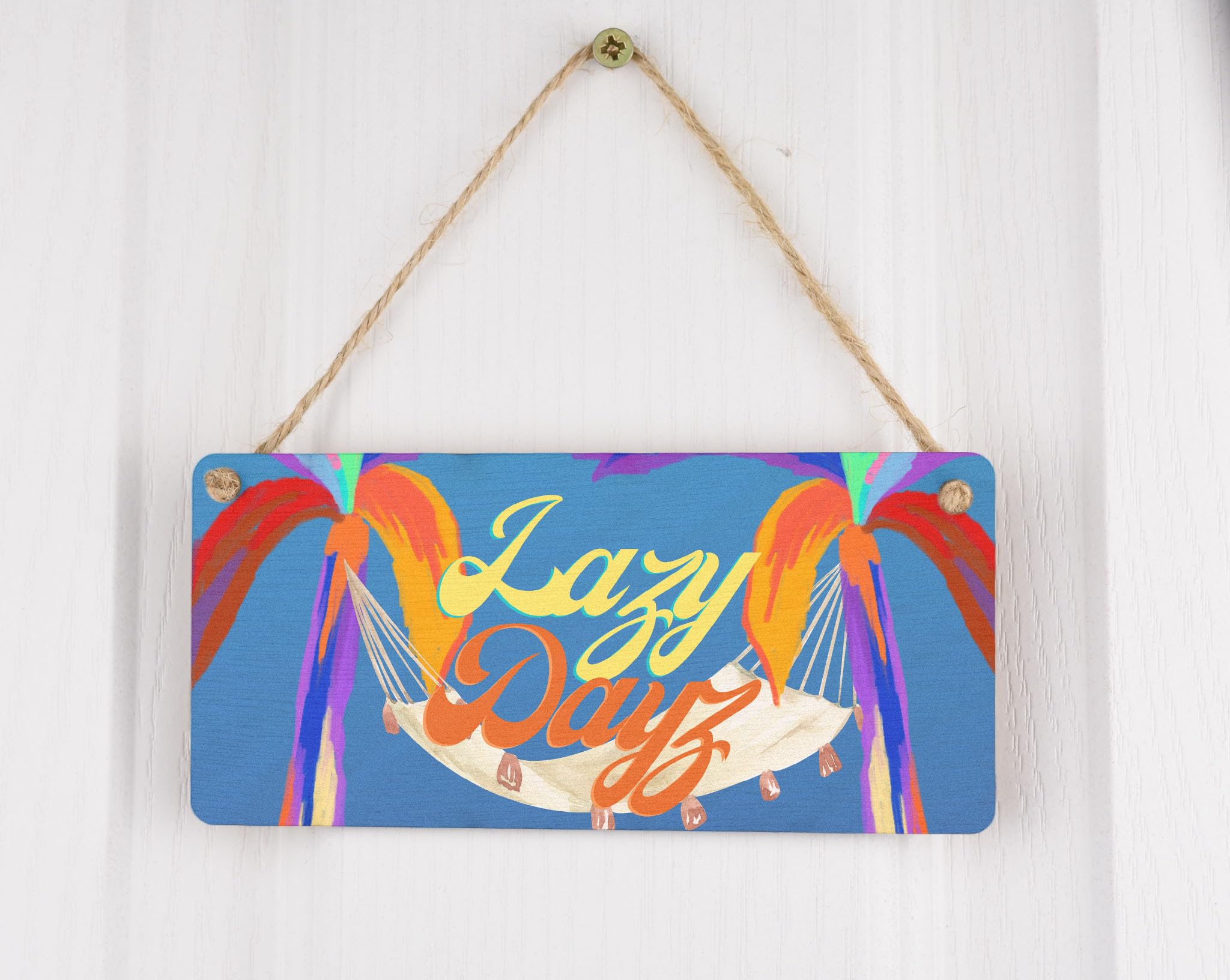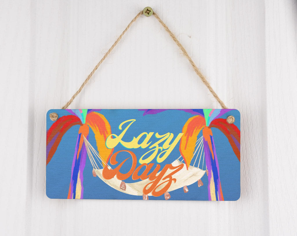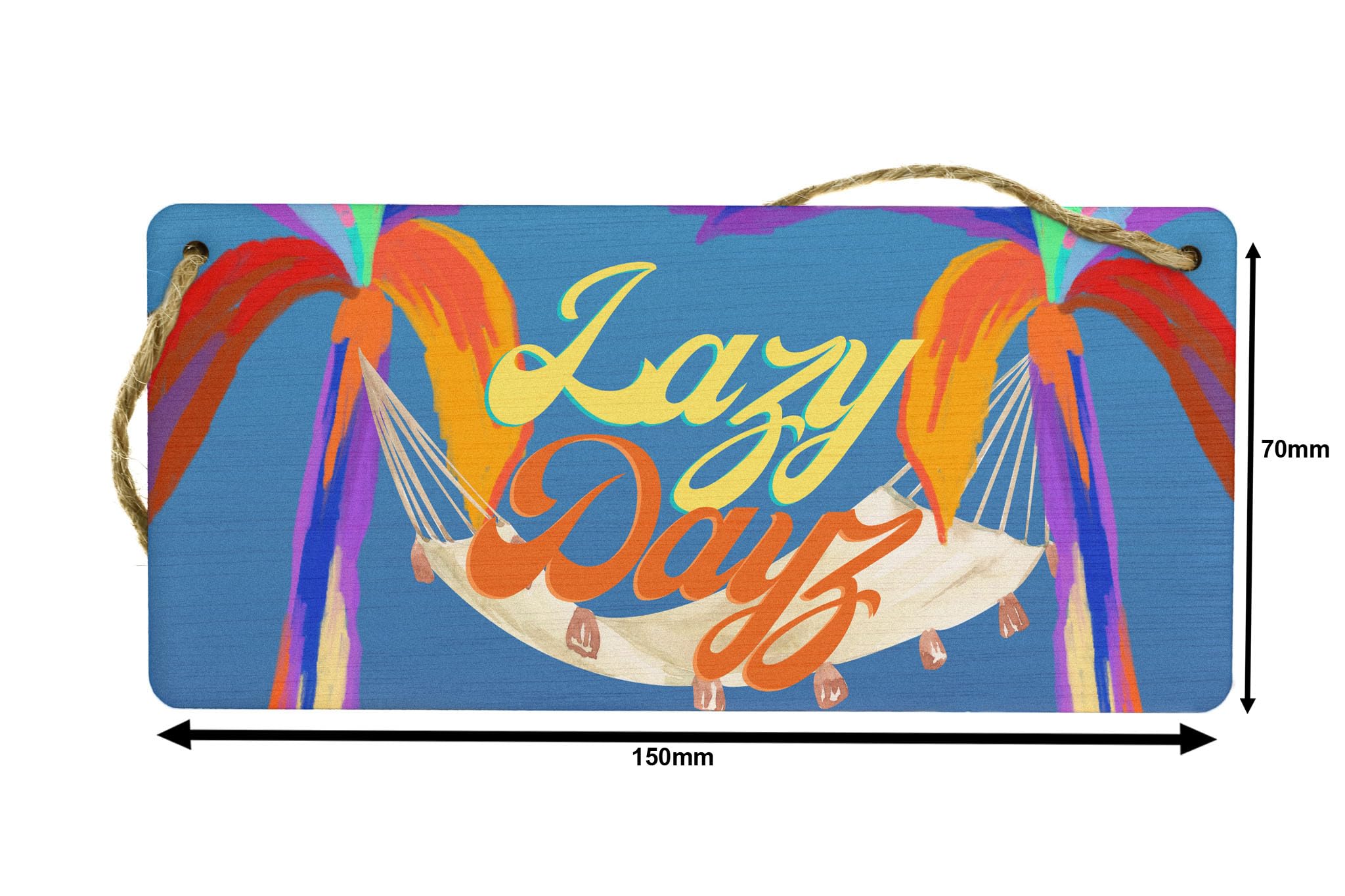 Introducing our Lazy Dayz - Hanging Plywood Sign, the perfect funny novelty gift for your loved ones! Made from quality plywood, this hanging sign is not only durable but also adds a touch of charm to any home decor. With its full-colour design, it portrays 'Lazy Dayz', featuring a hammock between two colourful palm trees. The sign is adorned with yellow and orange writing on a beautiful blue background. This unique and amusing sign is designed for wives, husbands, girlfriends, boyfriends, sons, daughters, and siblings, making it a great gift for any occasion. Whether you are looking for a present for a housewarming party or simply want to add some fun to your home, our Lazy Dayz - Hanging Plywood Sign is the perfect choice!