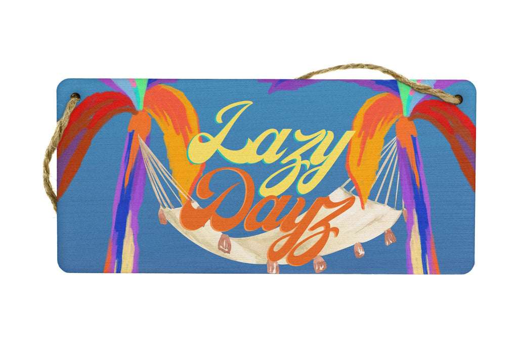 - Full-colour design portraying Lazy Dayz - hammock between two colourful palm trees