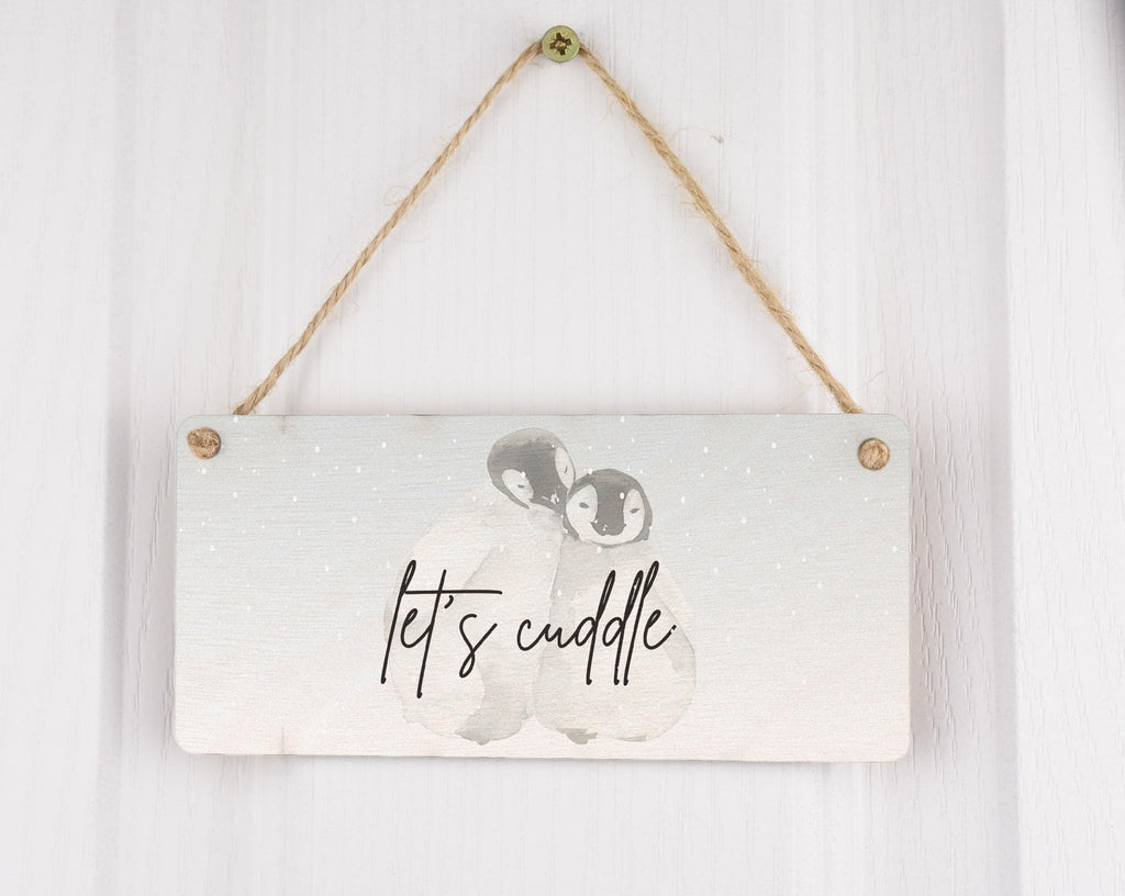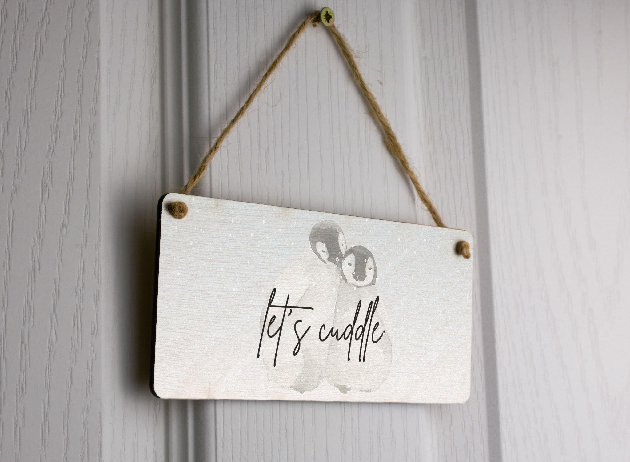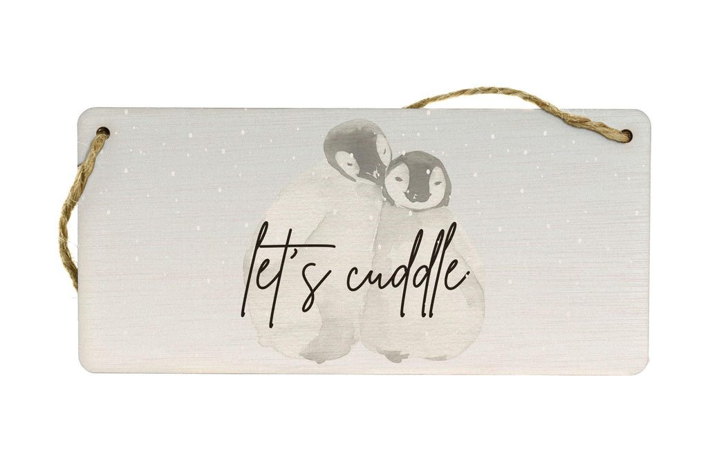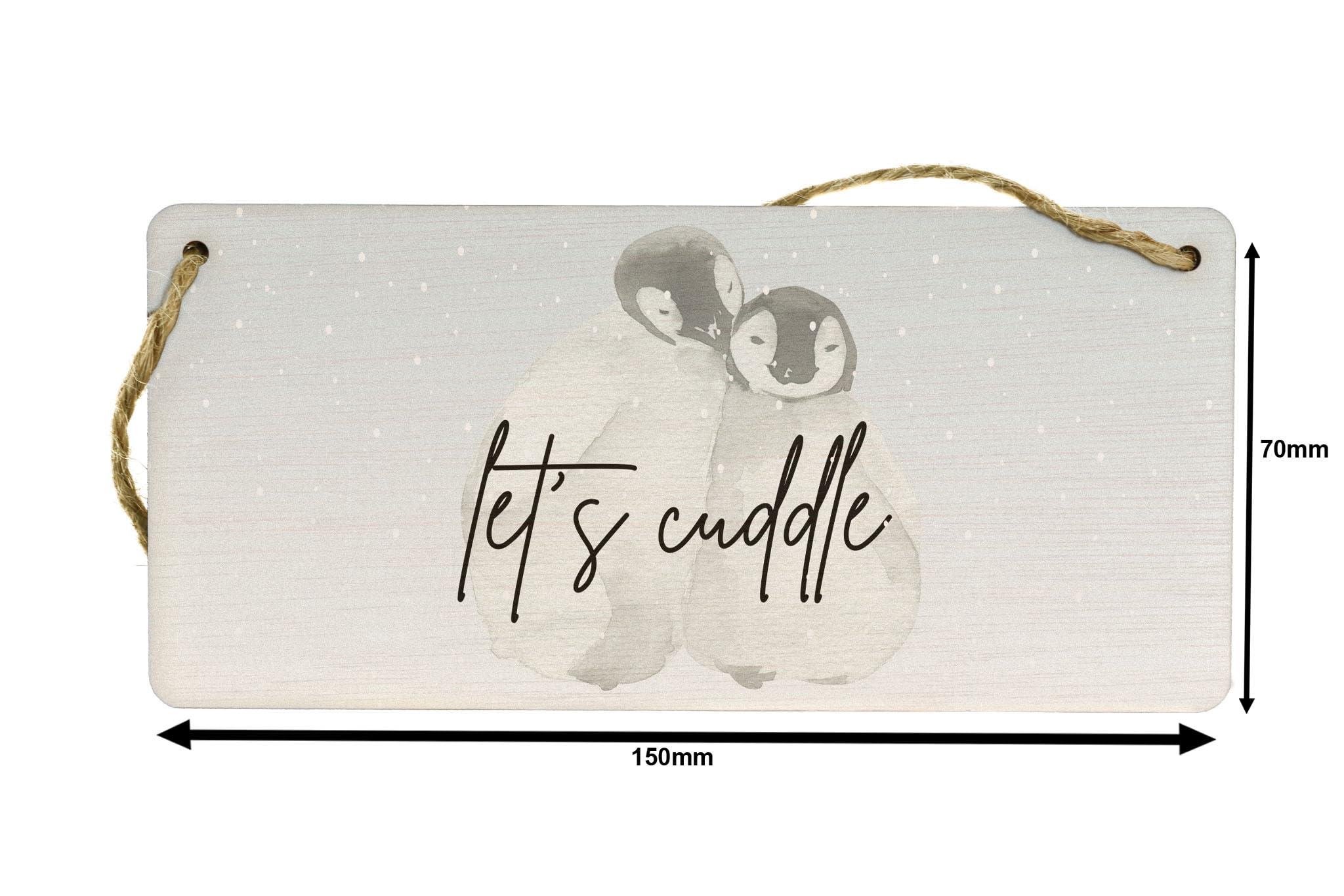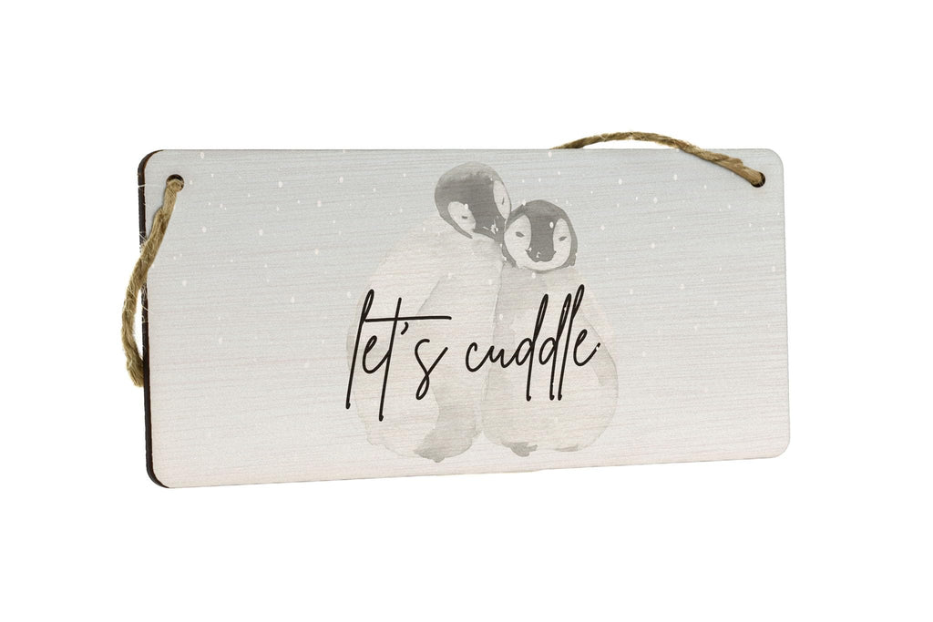 Let's Cuddle - Plywood Hanging Sign - Penguin Themed Romantic Idea for Couples (smlsgn-ds23-cudpeng)