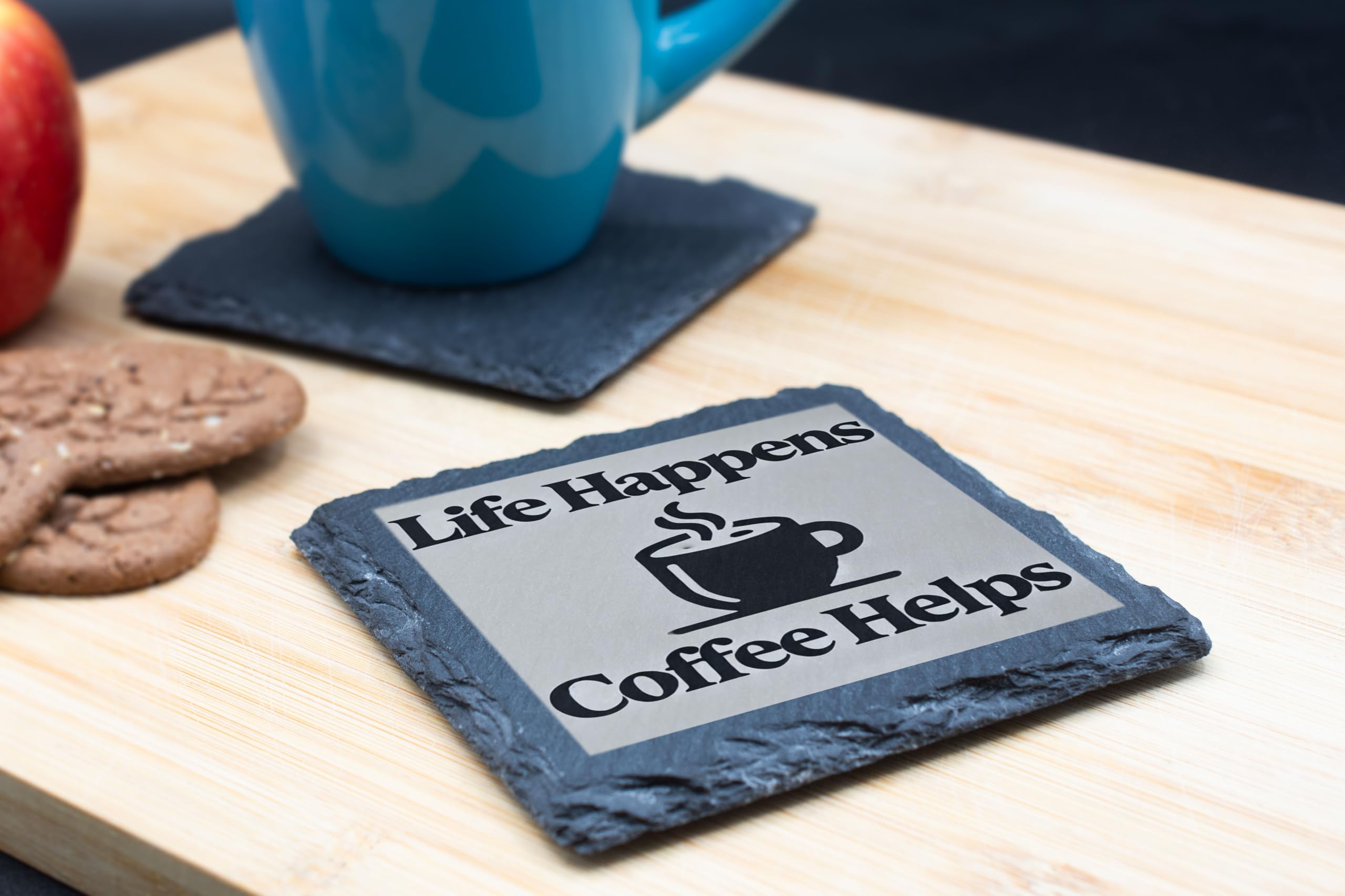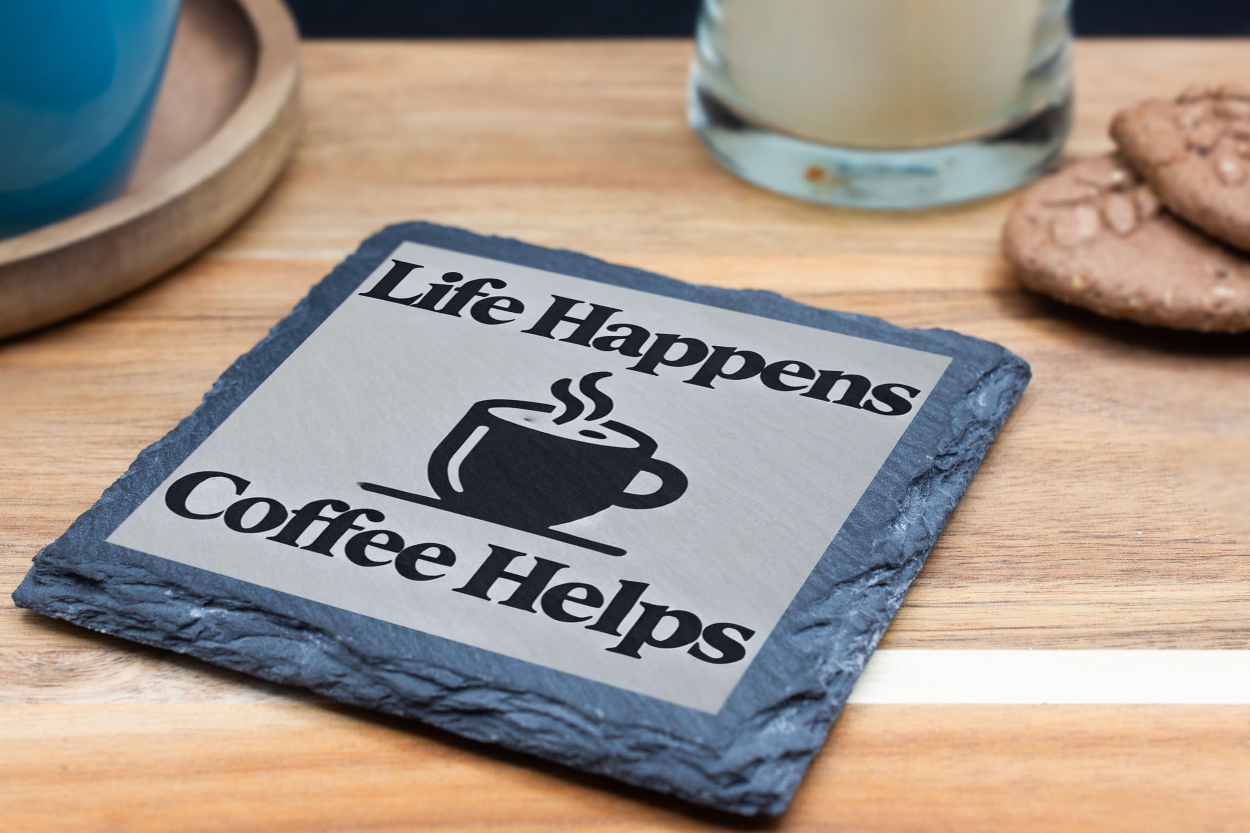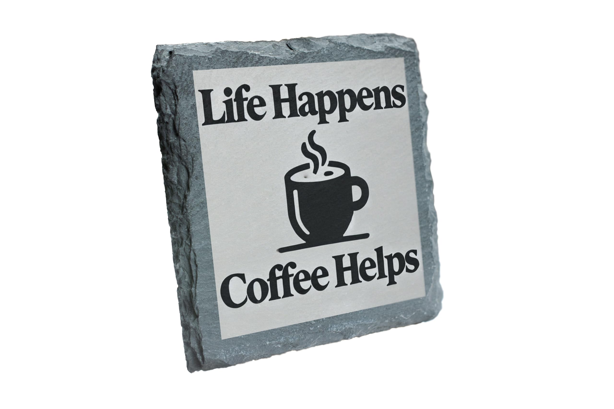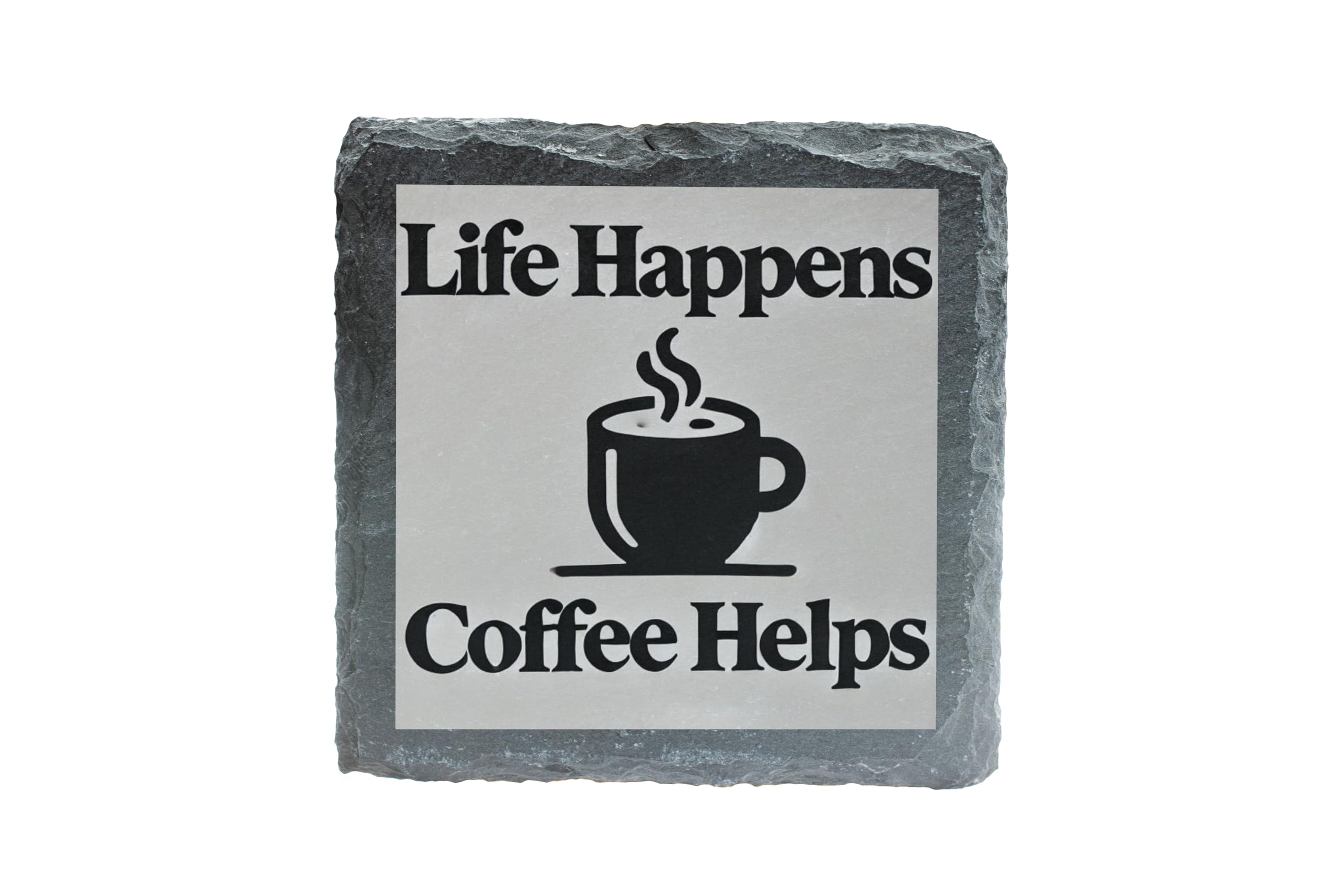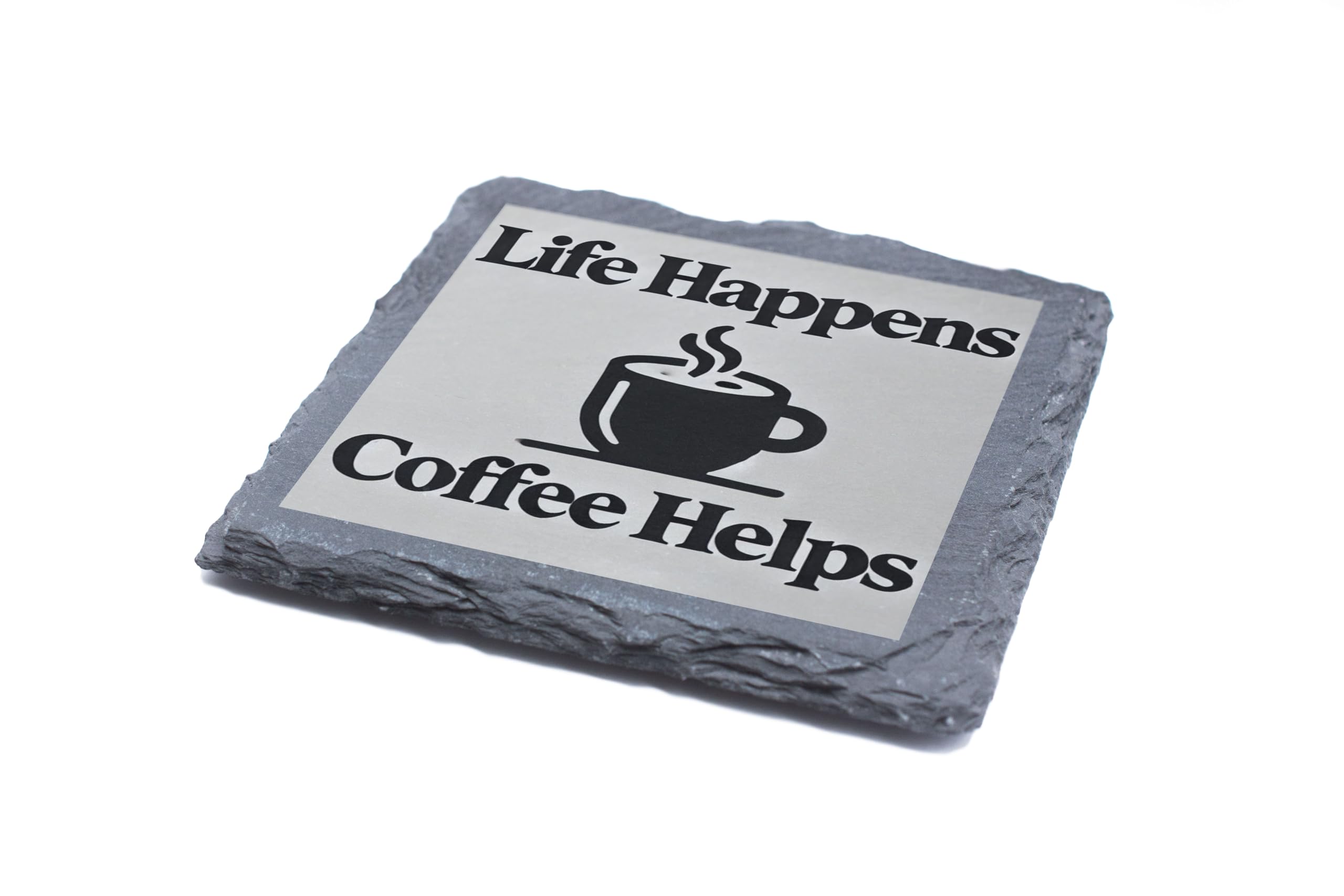 Celebrate the magic of coffee with this "Life Happens, Coffee Helps" Slate Coaster, a perfect companion for your morning cup of joe. Featuring a motivational design and made from natural slate, this coaster combines functionality with a touch of elegance. Its durable construction ensures long-lasting use, while its witty message brings a smile to your face. Whether you're a coffee enthusiast yourself or looking for a thoughtful gift for a friend, this coaster is an excellent choice. Protect your surfaces from heat and spills while enjoying the daily comfort of your favorite brew. Elevate your coffee moments with this stylish and meaningful accessory!