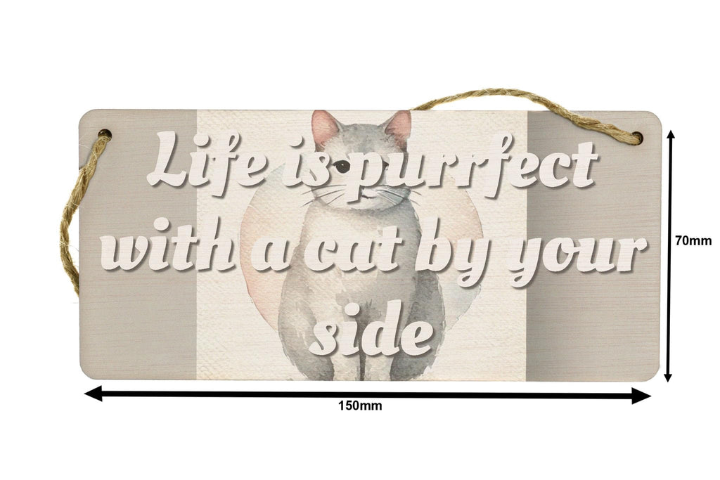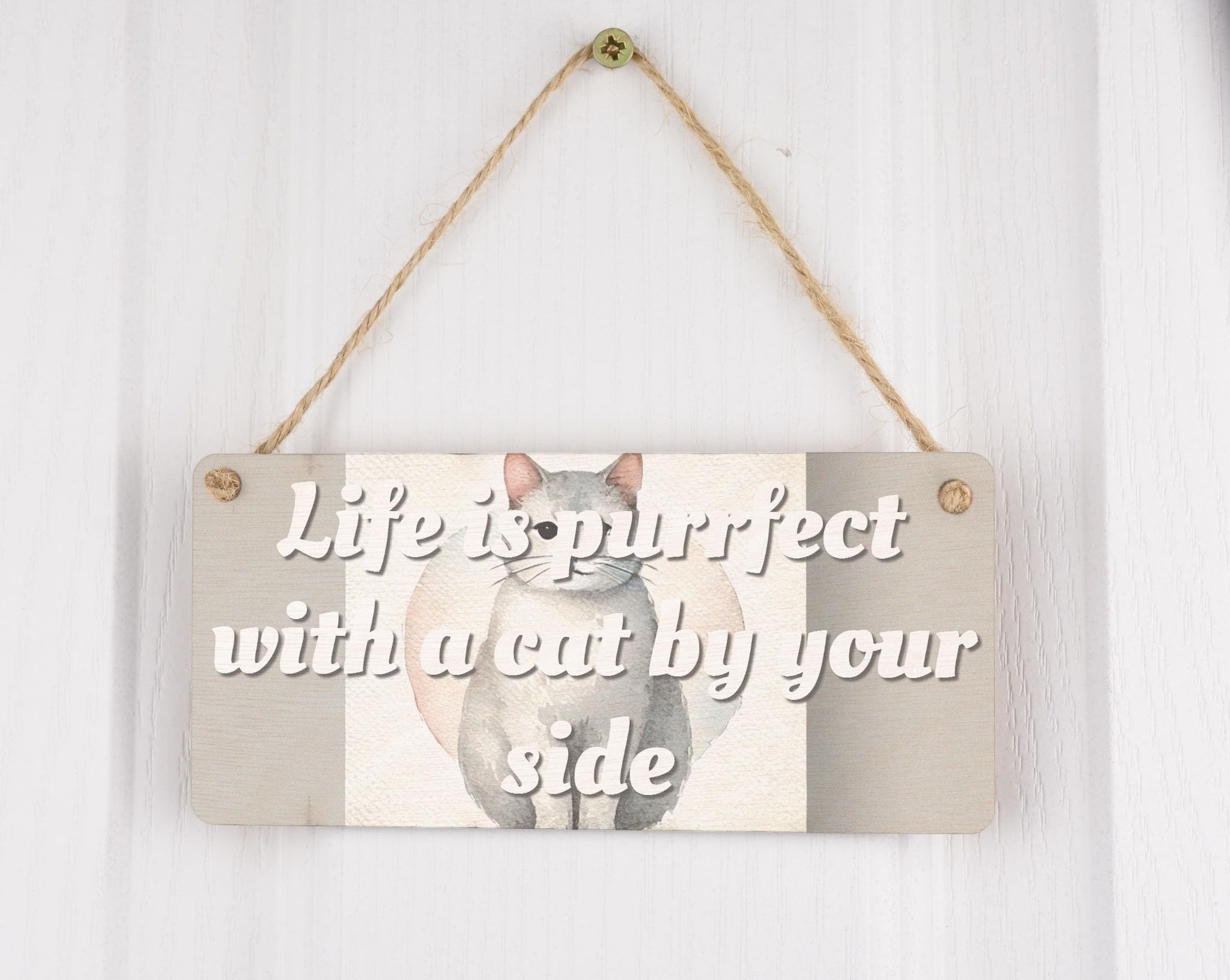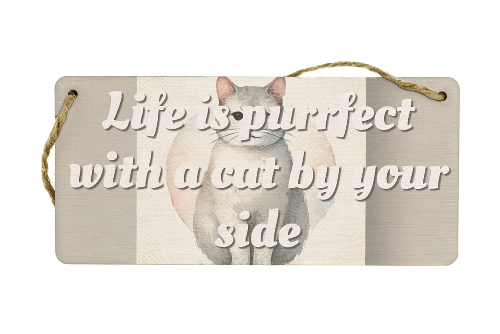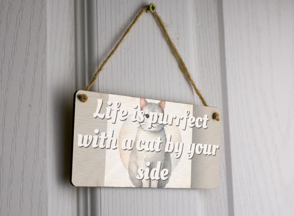 Add a touch of whimsy and warmth to your home with our 'Life is Purrfect with a Cat by Your Side' wooden cat themed wall hanging sign. This charming piece of cat themed decor features a beautiful watercolour art style illustration of a cute cat, perfect for animal lovers and pet owners alike. The rustic style of this handcrafted laser cut plywood sign adds a cosy and minimalist design to any room. The sentimental message 'Life is Purrfect with a Cat by Your Side' is displayed in full colour, showcasing the stunning AI generated art in a UV printed design. Whether you're looking for a thoughtful gift for a pet lover or simply want to add some light hearted humour to your home decoration, this hanging sign is sure to bring a smile to your face. Twine is included for easy hanging, making it a breeze to display this adorable piece of art in any room.