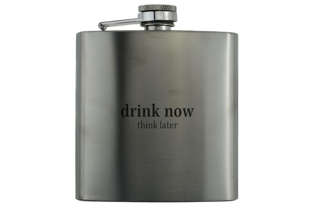• Stainless steel flask with a UV printed design featuring the lighthearted quote 'Drink Now - Think Later'