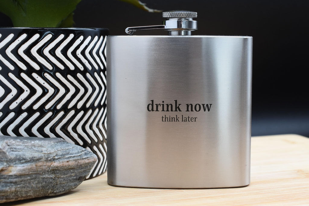 Lighthearted Quote Stainless Steel Flask: 'Drink Now - Think Later' (hip-ds23-drinkthinkrg)