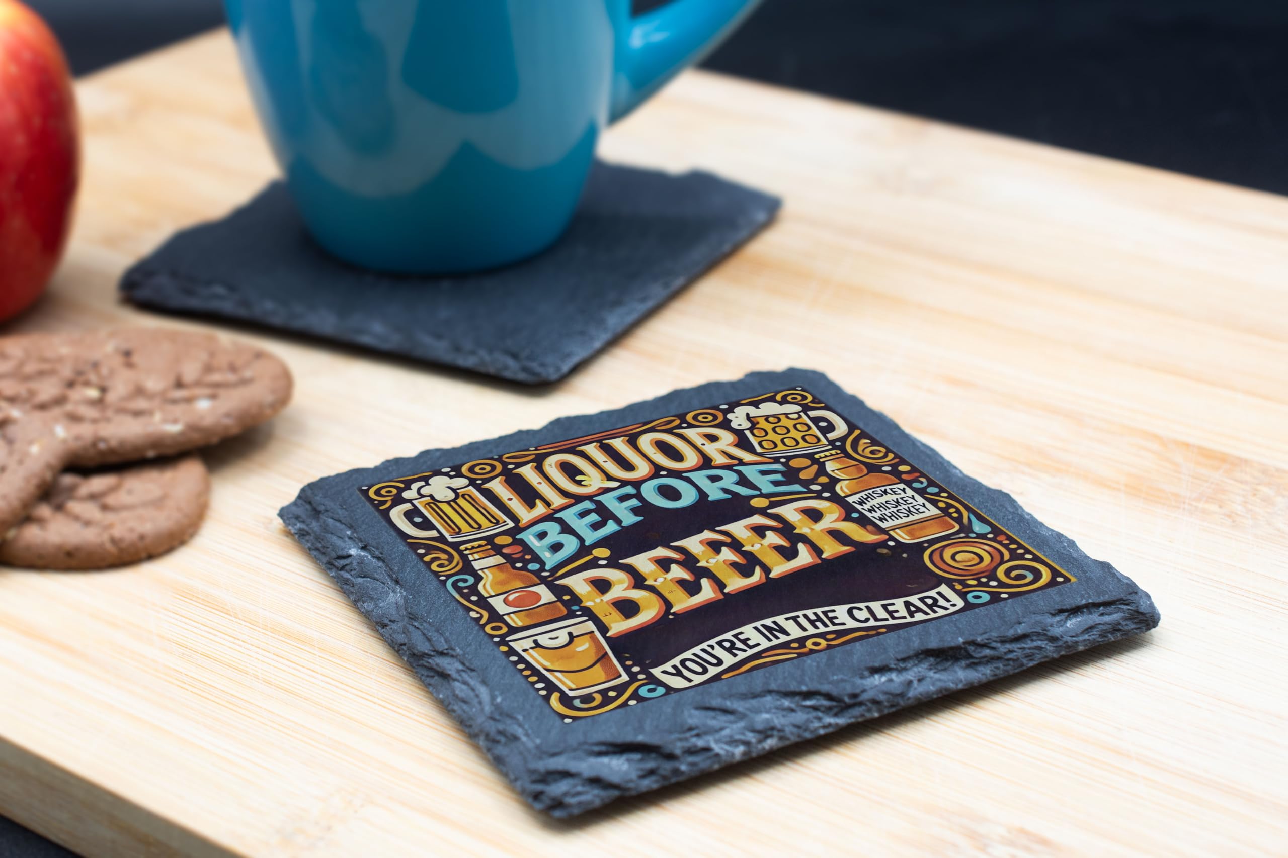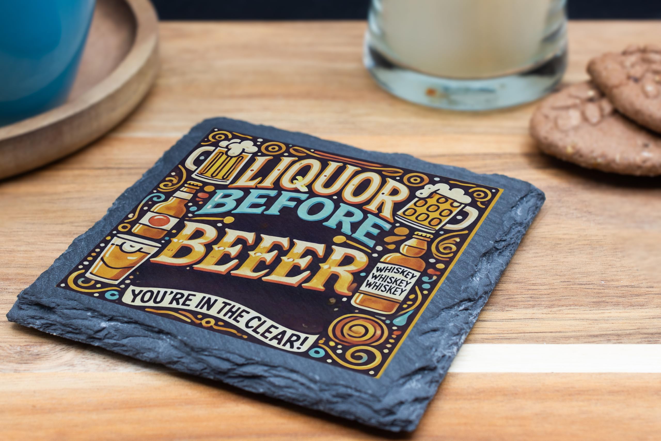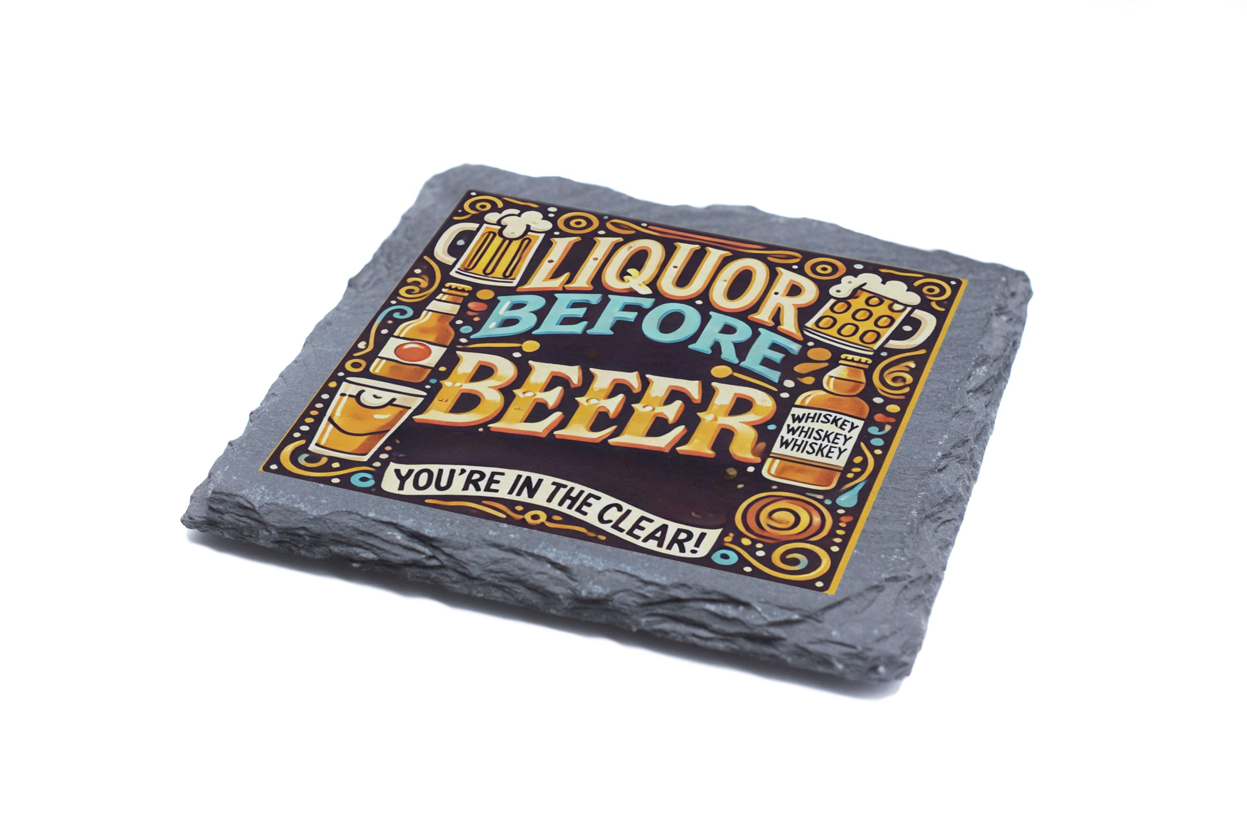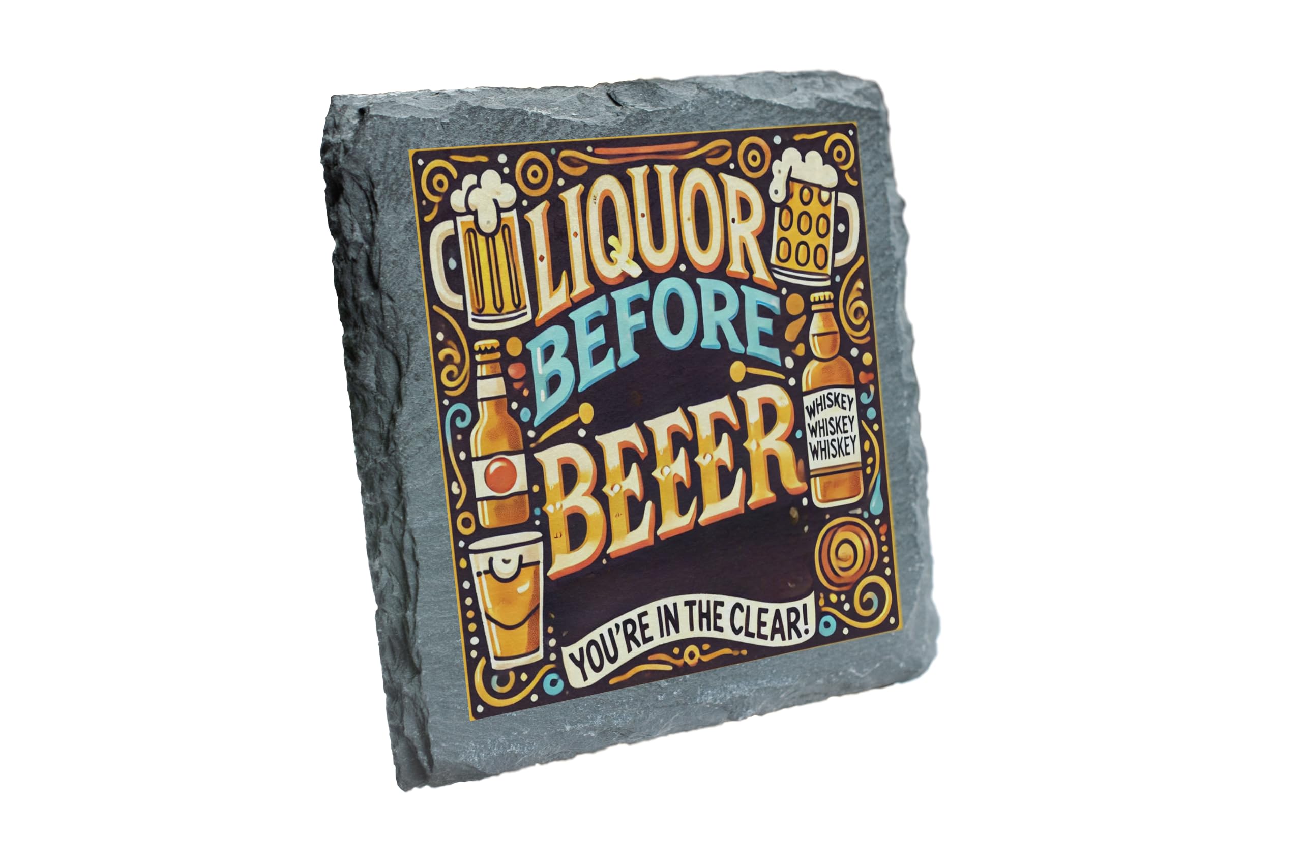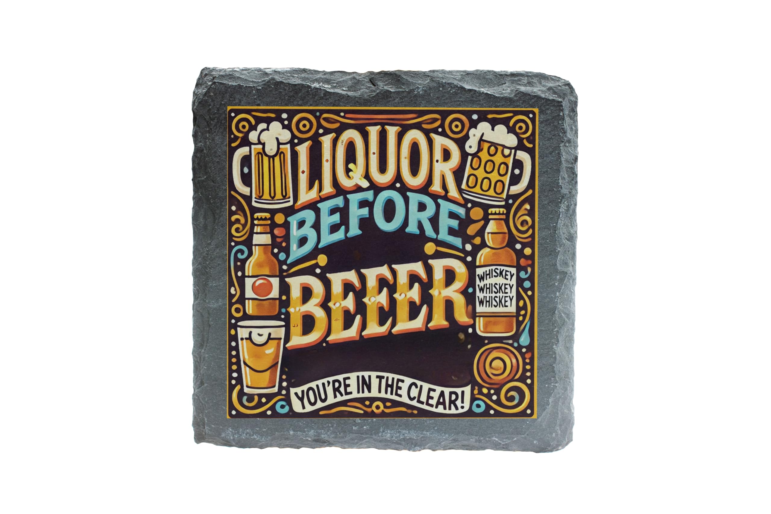 Add a dose of humor and charm to your home bar or table with the "Liquor Before Beer" slate coaster. Featuring a playful design with bold lettering and colorful depictions of beer and whiskey, this coaster is as functional as it is fun. Crafted from premium slate, it not only protects your surfaces from spills and stains but also makes a statement. The non-slip backing ensures it stays in place, even during the liveliest of gatherings. Whether for your own bar setup or as a gift for a friend, this coaster is sure to be a conversation starter at any occasion. Cheers to good times!