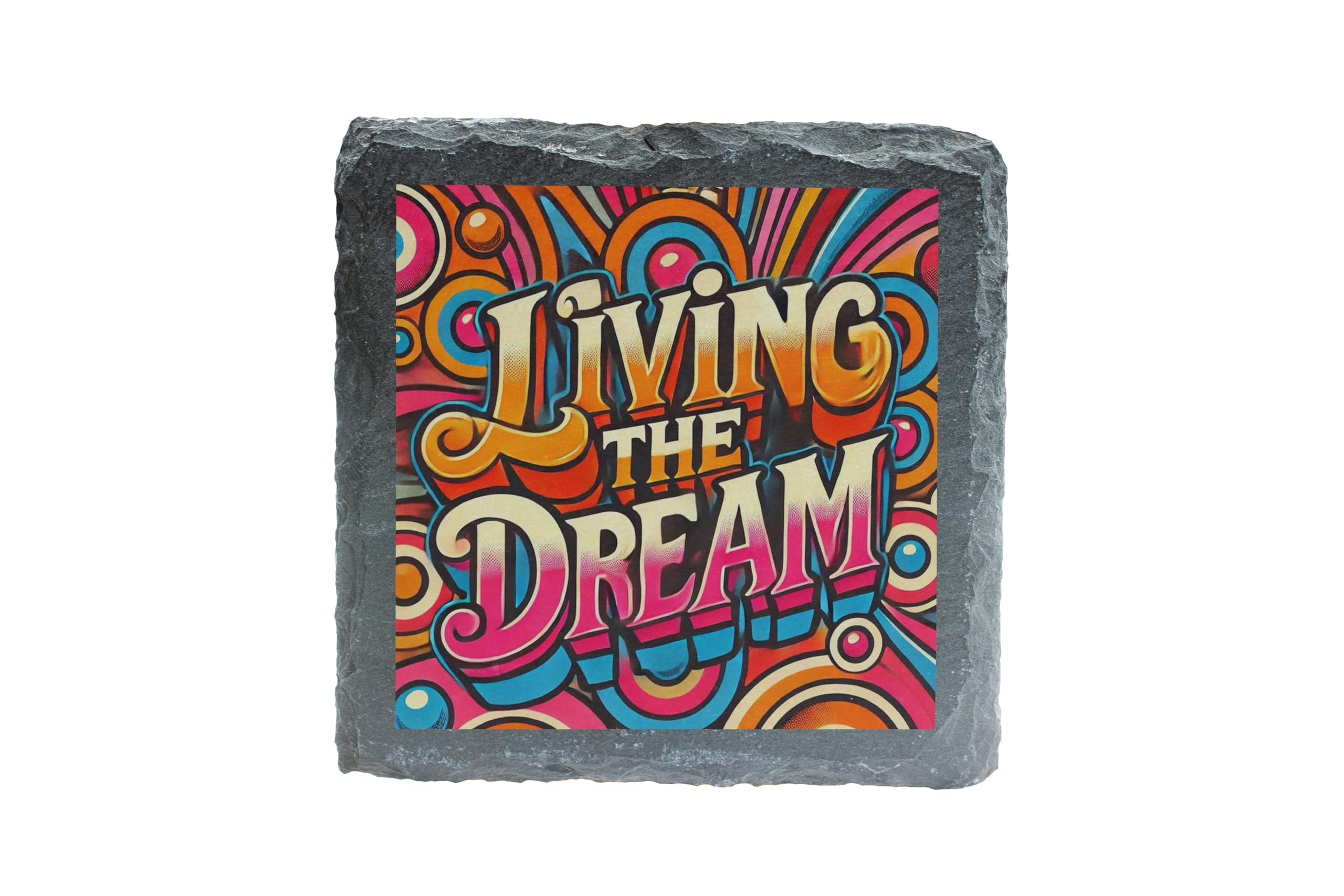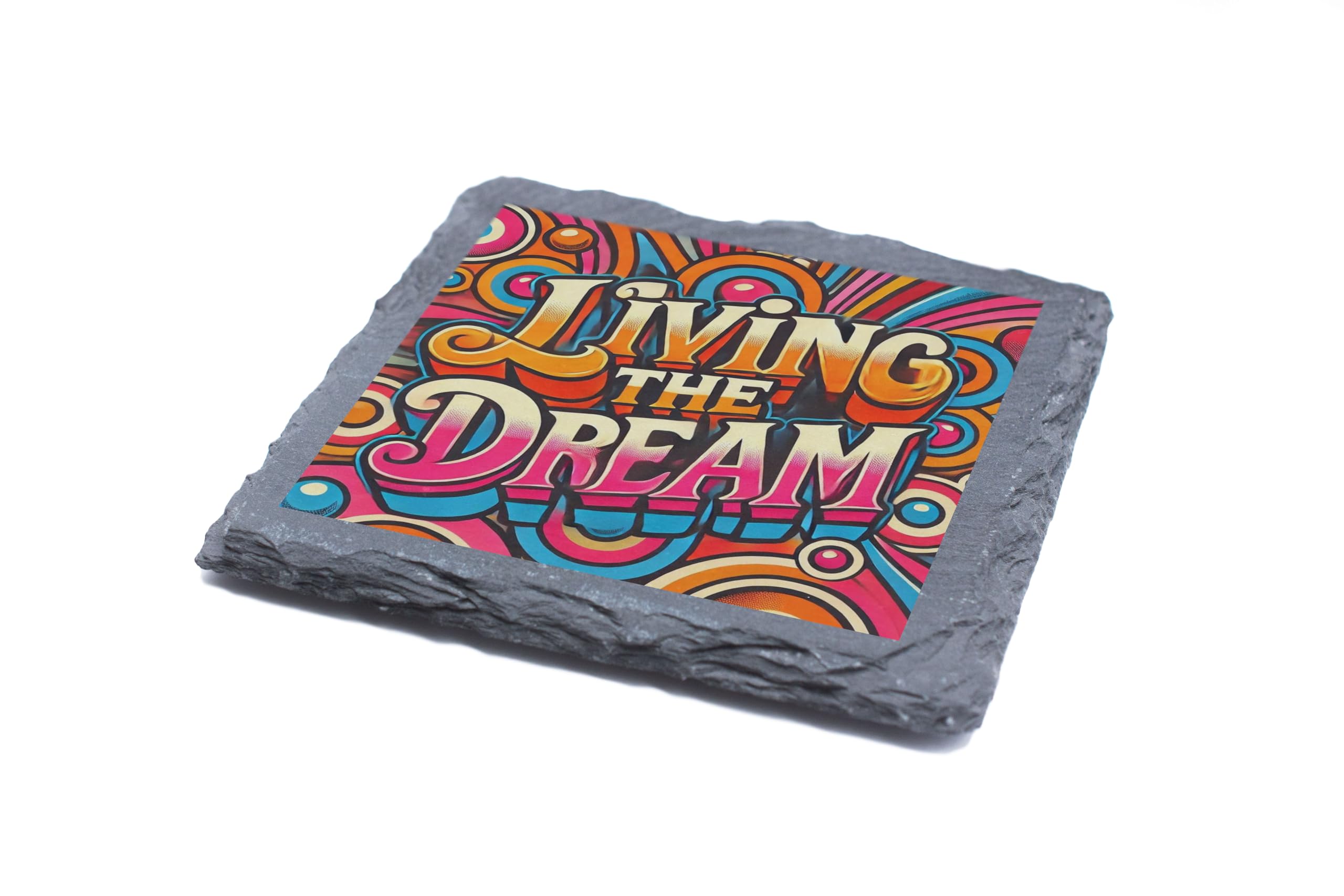 Bring inspiration to your space with the "Living the Dream" slate coaster. Showcasing a striking, multicolored design with bold typography, this coaster is a stylish way to protect your surfaces while staying motivated. Crafted from high-quality natural slate with a cork backing, it combines durability and functionality with a vibrant, artistic touch. Whether for your morning coffee or an evening drink, this coaster is perfect for adding a splash of color and positivity. It makes a thoughtful gift for anyone living their dream or aspiring to!