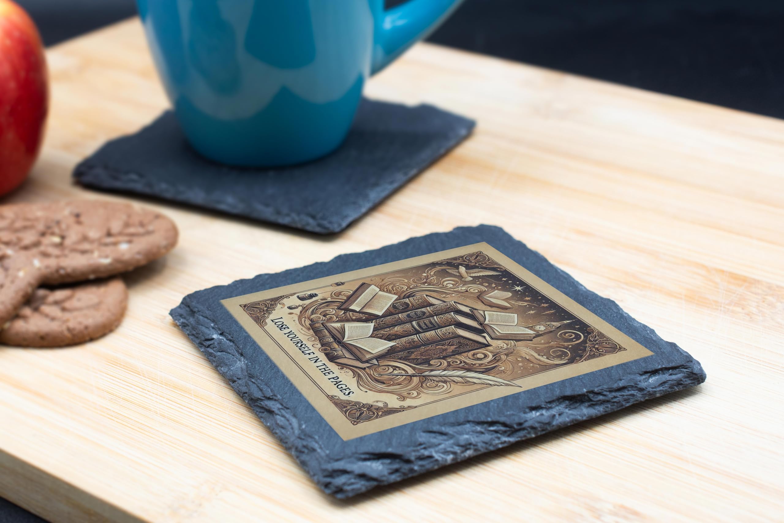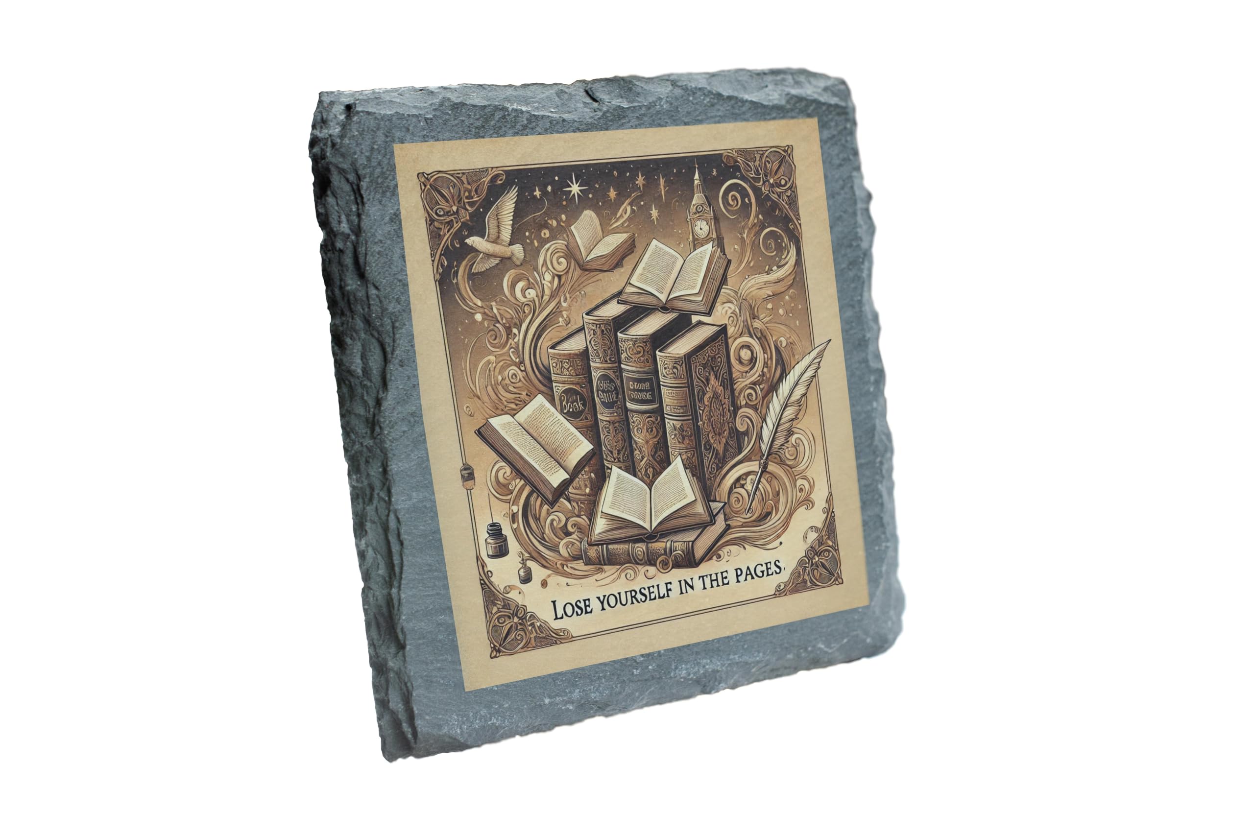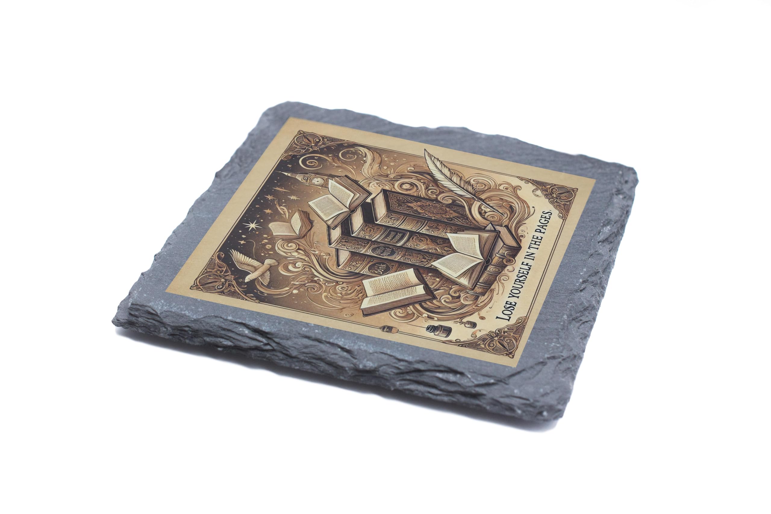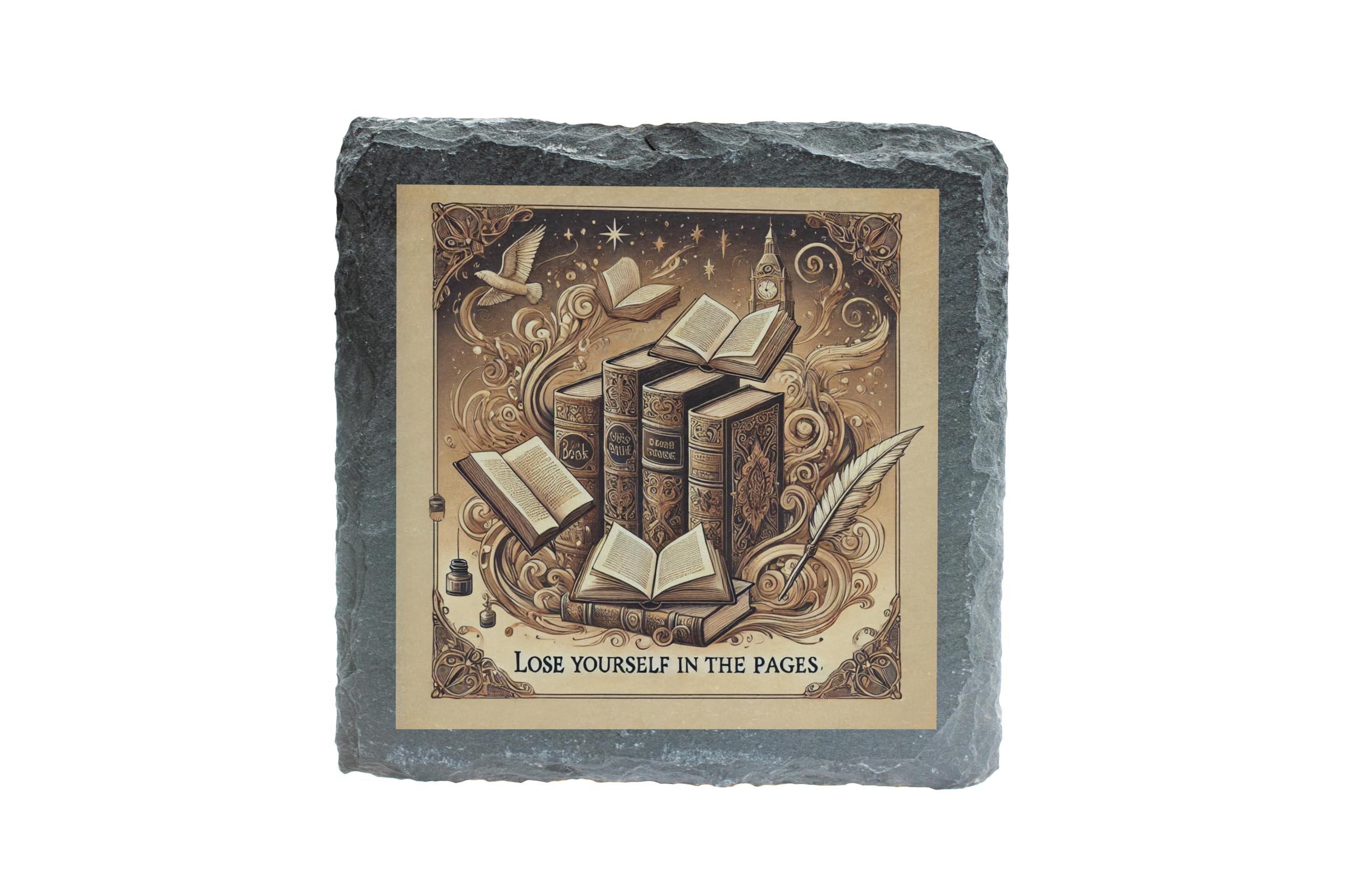 Celebrate the magic of storytelling with this beautifully crafted "Lose Yourself in the Pages" Slate Coaster. Featuring a vintage-inspired design of flying books and ornate details, this coaster is a nod to the timeless allure of literature. The natural slate material offers durability and a sophisticated aesthetic, while the non-slip backing ensures your furniture remains scratch-free. Whether you're sipping tea while reading your favorite novel or hosting a literary-themed gathering, this coaster adds charm and functionality to your space. This unique coaster is a thoughtful gift for book lovers, writers, or anyone who finds solace in the written word. Add it to your home, office, or reading nook for a touch of literary inspiration.