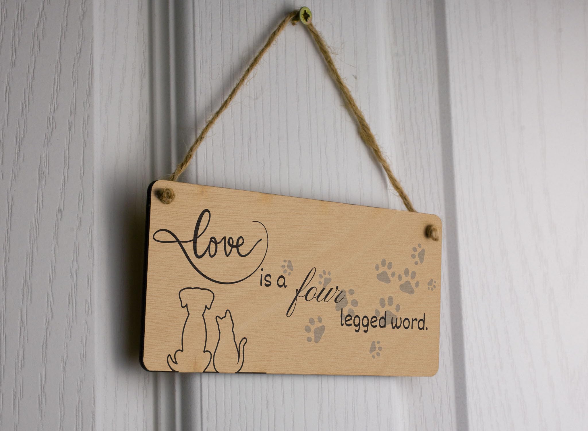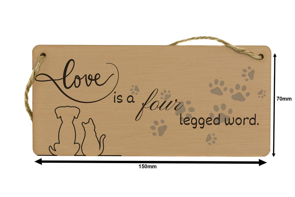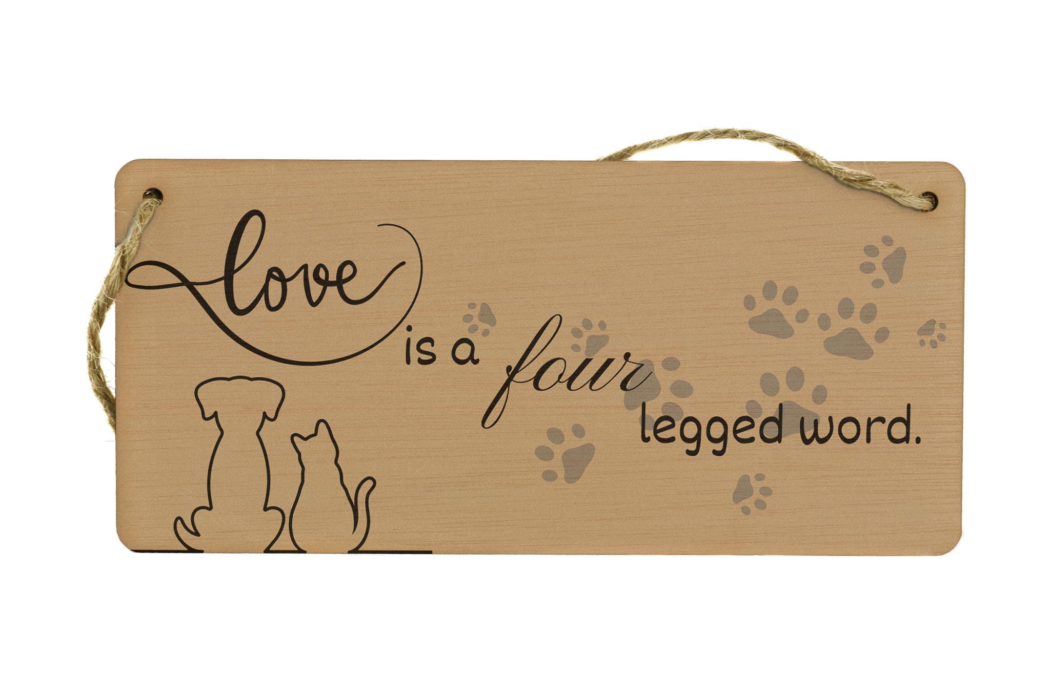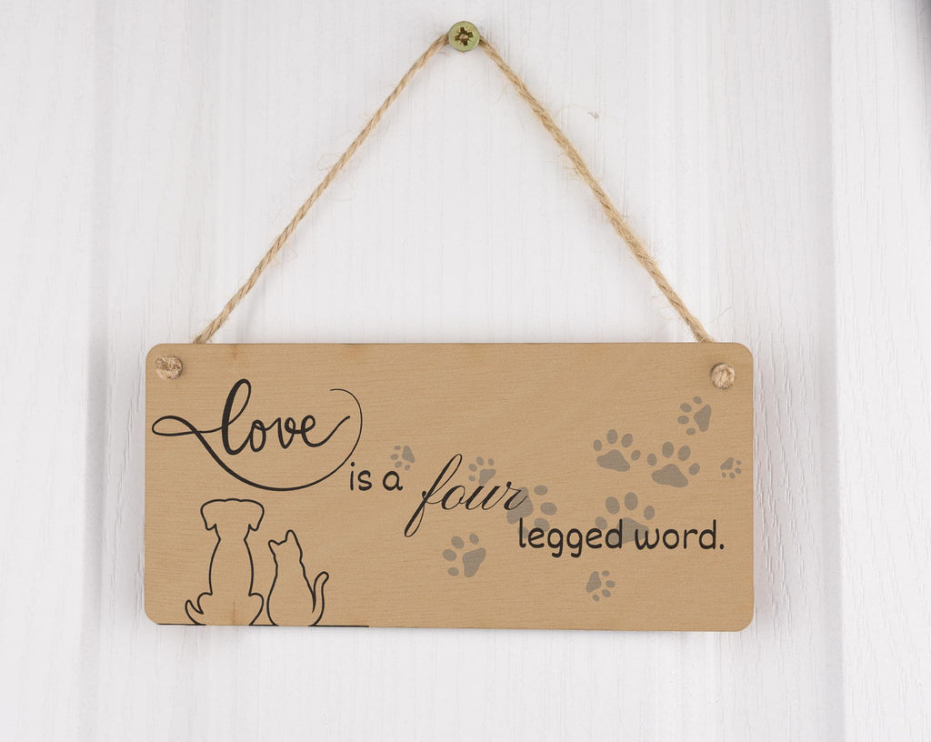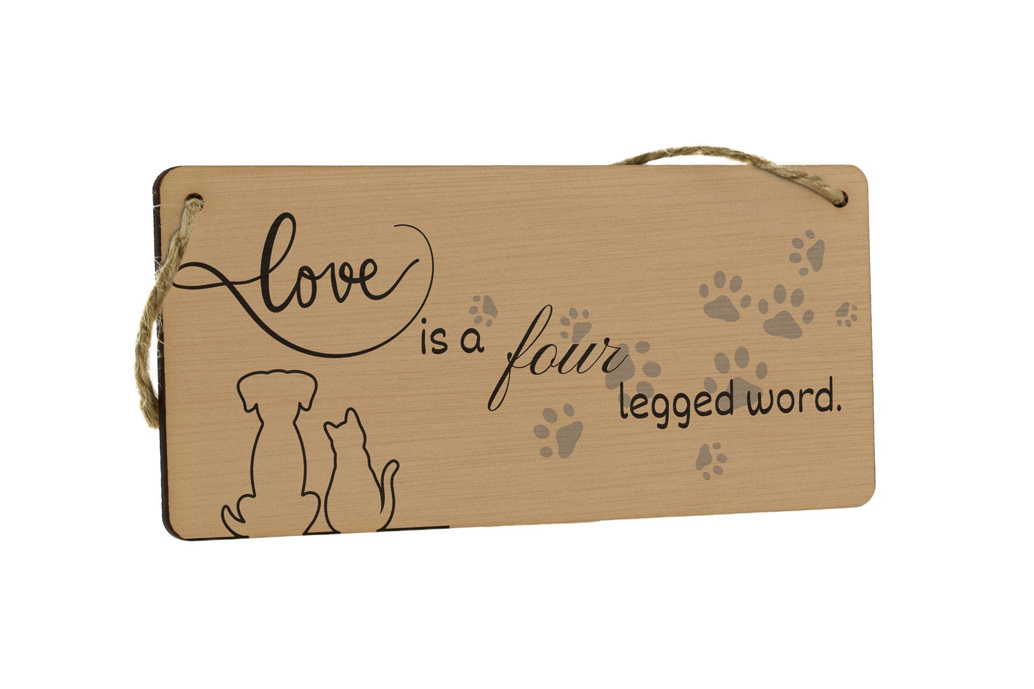 Add a touch of warmth and love to your home with our Love is a Four Legged Word - Plywood Hanging Sign. This beautiful room sign is the perfect gift for animal lovers, featuring the heart-warming message 'Love is a Four Legged Word' accompanied by an outline image of a dog and cat. Made from quality plywood, this sign is durable and lightweight, making it easy to hang on any door or wall. The brown background with black writing and pawprints adds a charming touch to any room, making it ideal for family and friends. Whether you're looking for a gift for your wife, husband, girlfriend, boyfriend, son, daughter, or siblings, this hanging sign is sure to be cherished by all. Perfect for pet owners, dog lovers, and cat enthusiasts, this room sign will bring a smile to their faces every time they see it.