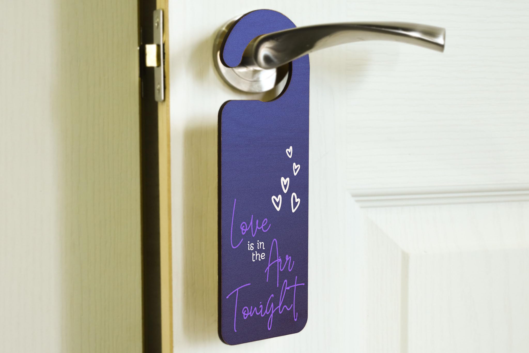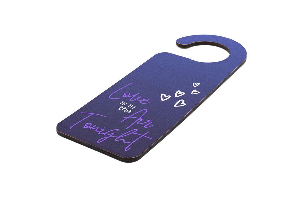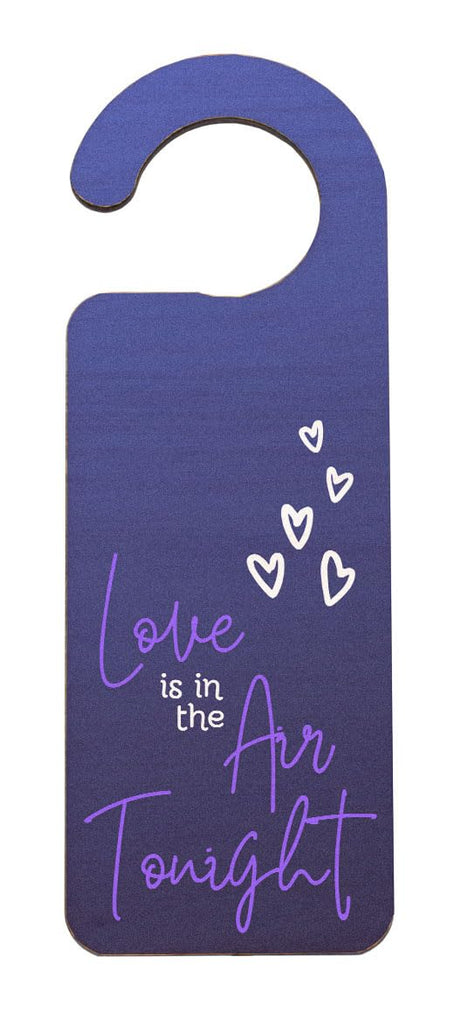 Create the perfect romantic ambiance with our 'Love is in the Air Tonight - Romantic Purple Door Hanger'. This handcrafted laser cut plywood product features a full colour door hanger showing a romantic purple calligraphic design, perfect for those intimate nights spent with your loved one. The sweet message 'Love is in the air tonight' creates a heartwarming and sentimental atmosphere, making it the ideal decoration for couples looking to declare their love and affection. Hang this sign on your door for a cozy night in and set the mood for a passionate and tender evening together.