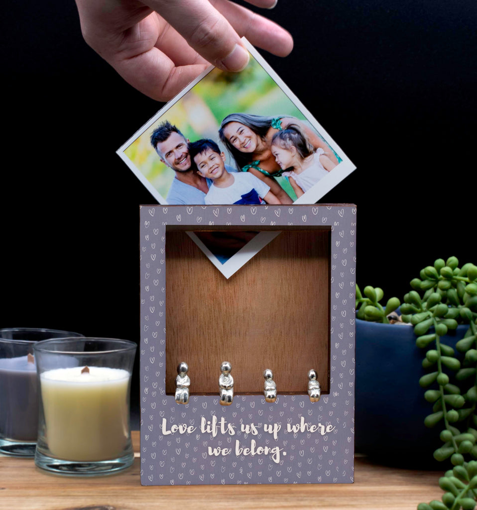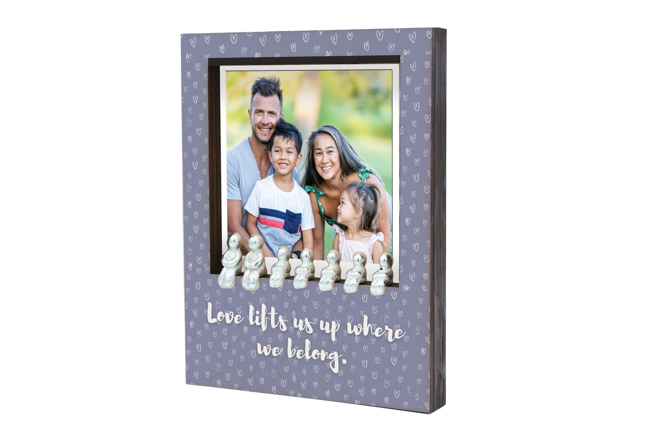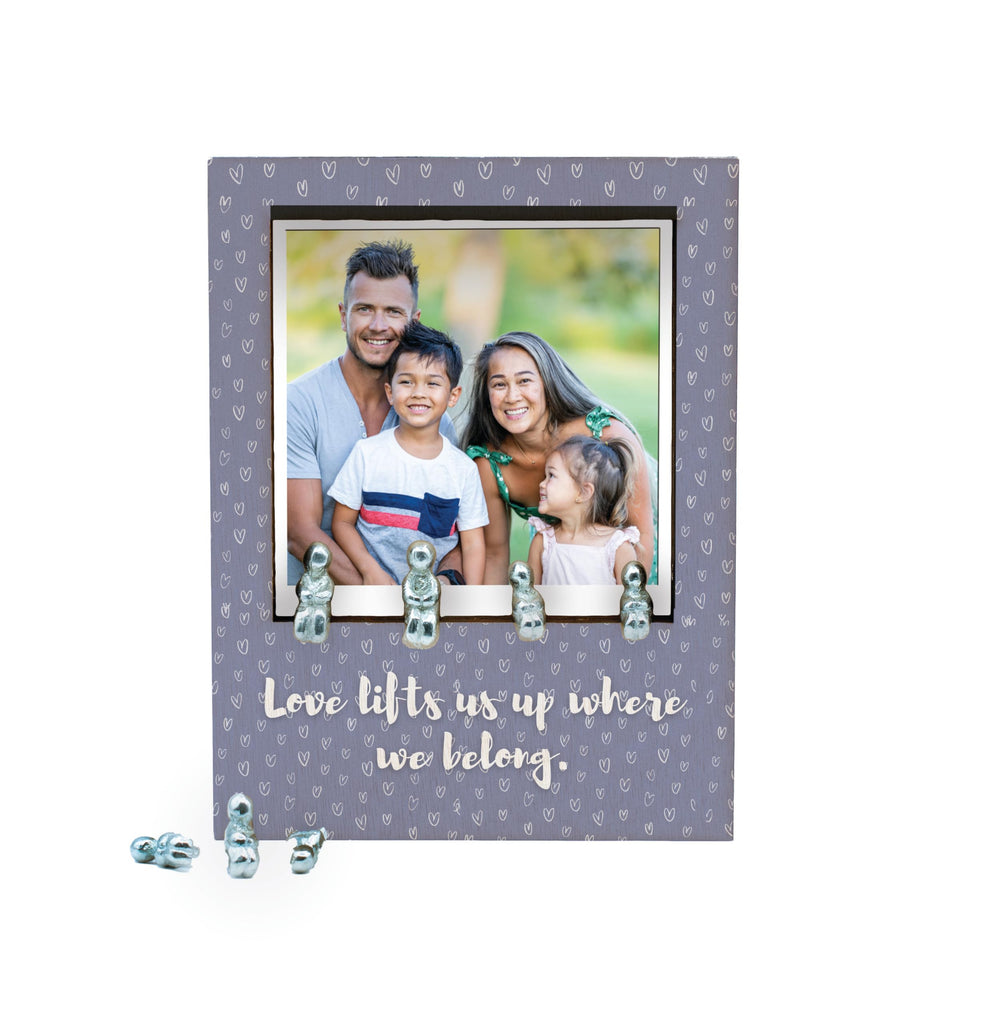 Add a touch of love and warmth to your home with our 'Love Lifts Us Up Family Frame'. This sentimental decor piece is the perfect novelty item to display in your family room. Crafted with heart patterned laser cut plywood, this elegant tabletop frame features a romantic sentiment that reads 'love lifts us up where we belong'. The frame is in gray tones, adding a rustic charm to your decor. It comes with tin figurines included to complete the look. The UV printed design showcases a full color pattern, making it an ideal family display for your treasured portraits. This unique home decor piece is a decorative gift that will bring joy and love to any space. Let this love-themed frame be a cozy accent piece in your home, reminding you of the power of love each day.