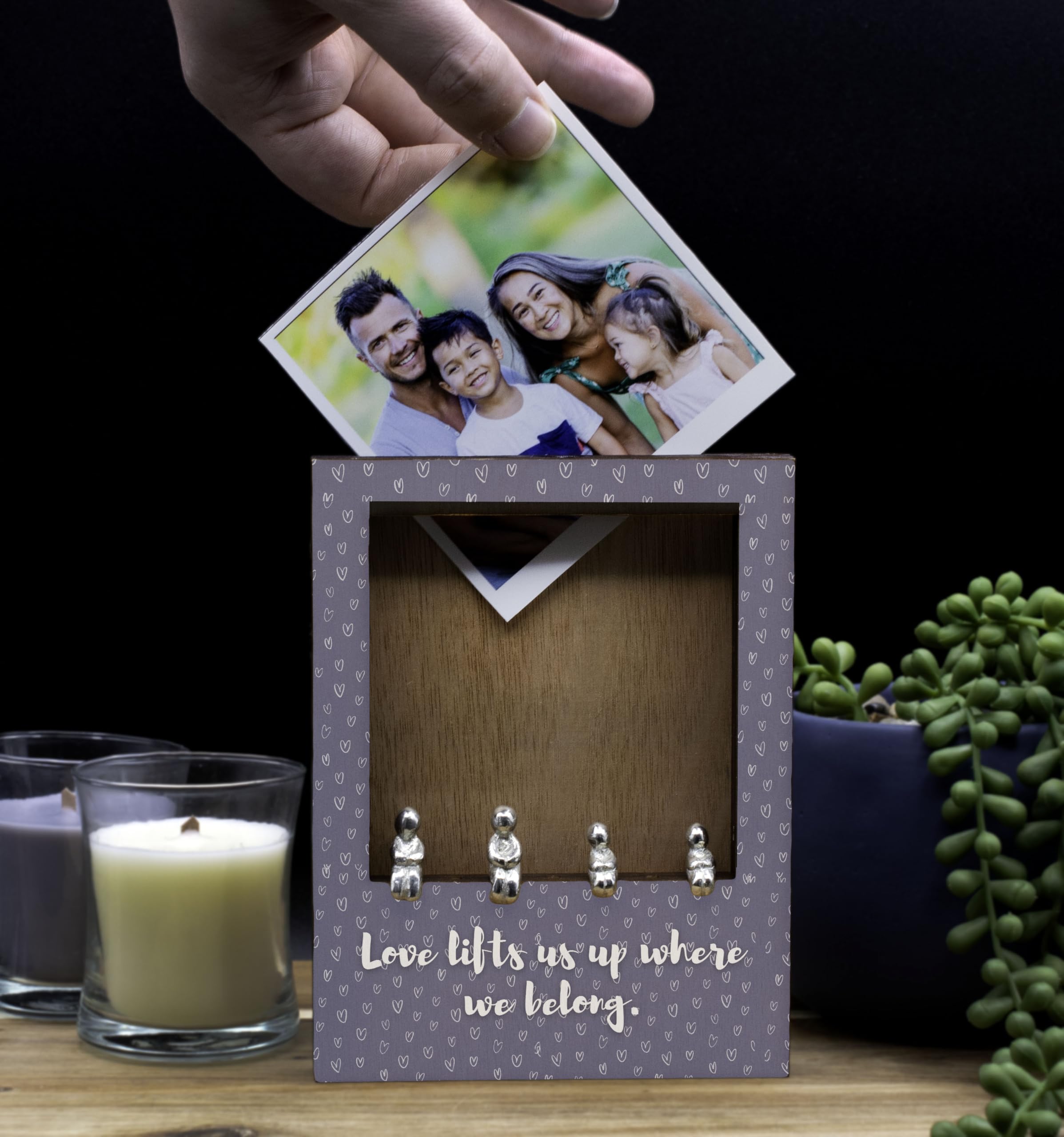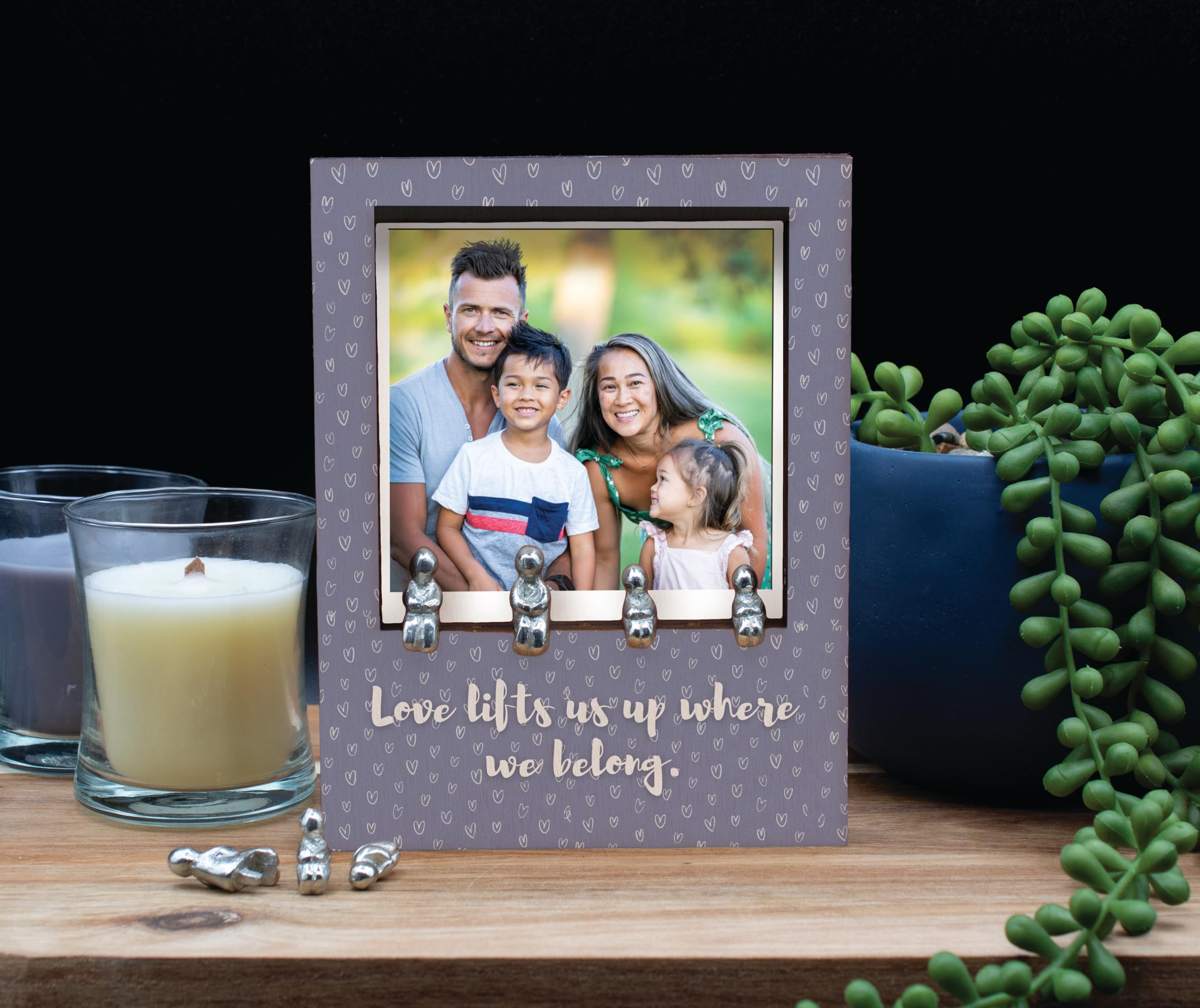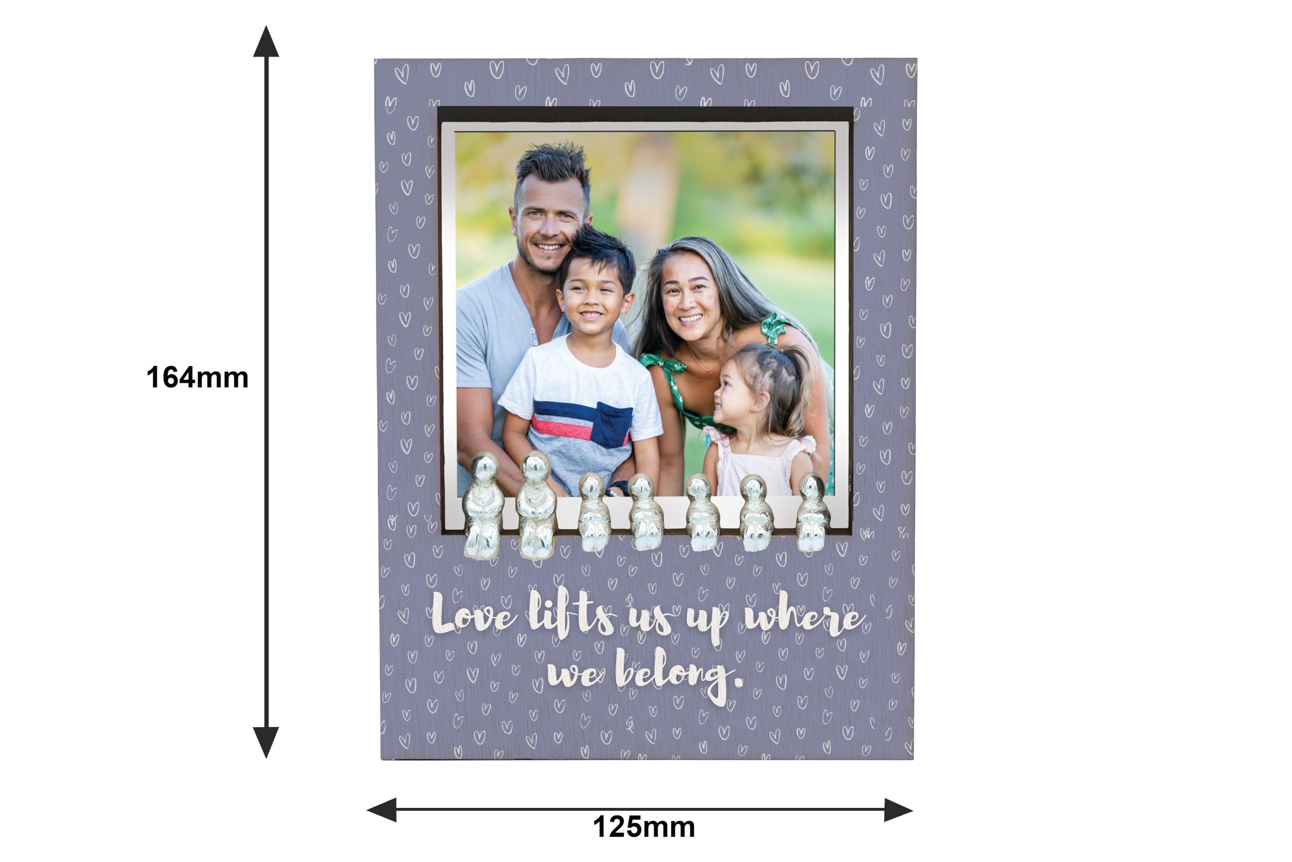 Add a touch of love and warmth to your home with our 'Love Lifts Us Up Family Frame'. This sentimental decor piece is the perfect novelty item to display in your family room. Crafted with heart patterned laser cut plywood, this elegant tabletop frame features a romantic sentiment that reads 'love lifts us up where we belong'. The frame is in gray tones, adding a rustic charm to your decor. It comes with tin figurines included to complete the look. The UV printed design showcases a full color pattern, making it an ideal family display for your treasured portraits. This unique home decor piece is a decorative gift that will bring joy and love to any space. Let this love-themed frame be a cozy accent piece in your home, reminding you of the power of love each day.