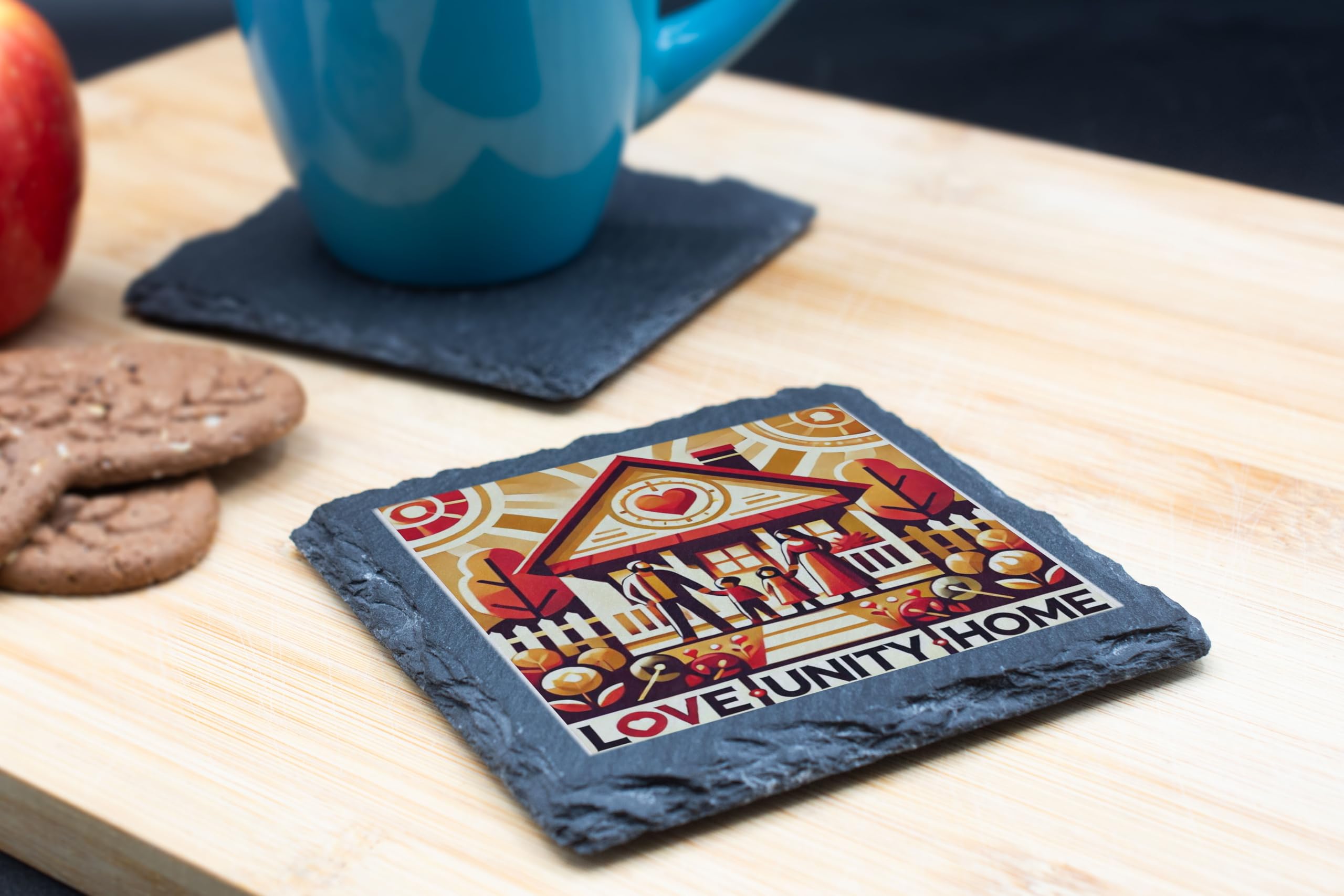 Celebrate the essence of family and togetherness with this beautifully designed "Love, Unity, Home" slate coaster. Featuring a warm and vibrant illustration of a family and their home, this coaster is a perfect addition to any household. Made from high-quality slate, it?s not just functional but also a stylish piece of decor that protects your furniture from spills and scratches. Whether you're looking for a thoughtful housewarming gift, a token of appreciation for loved ones, or a charming addition to your own home, this coaster is sure to make an impression. Its durable and eco-friendly material ensures it will be cherished for years to come.