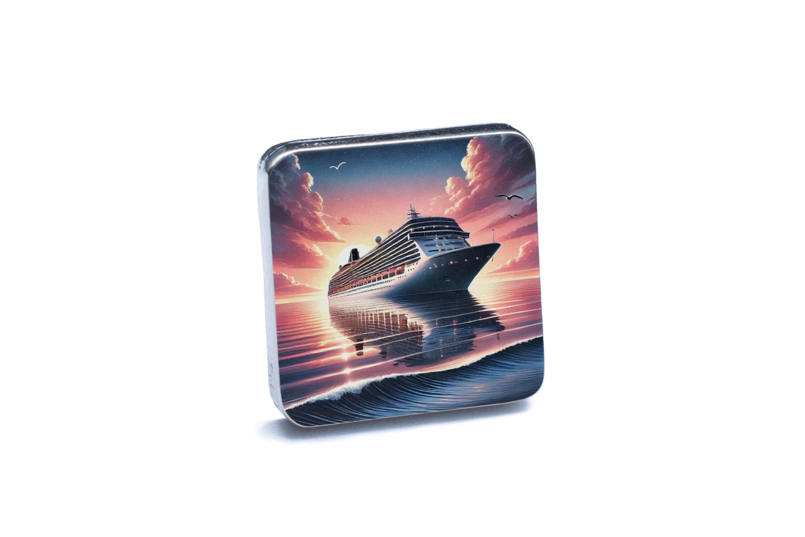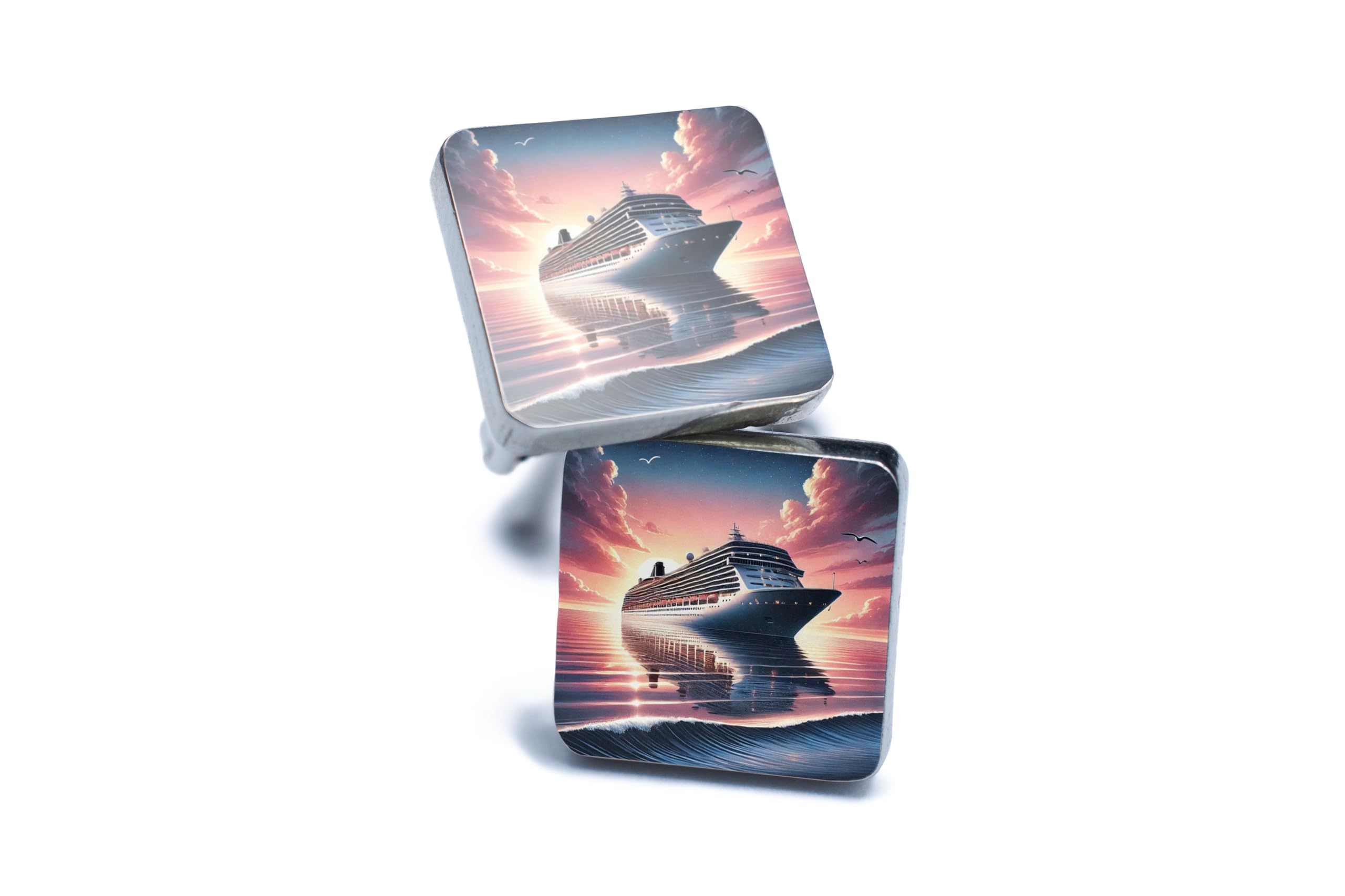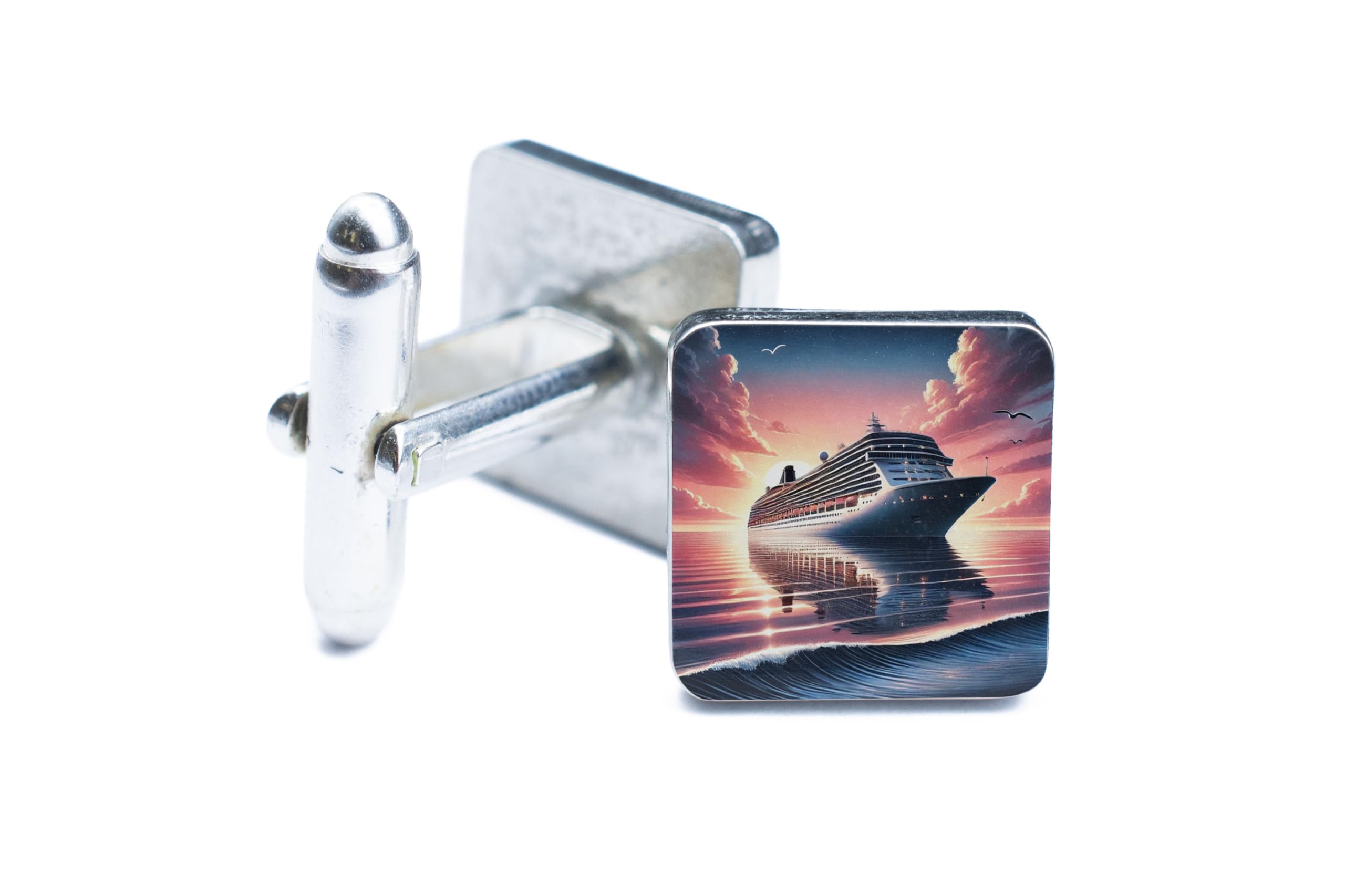 Set sail in style with these elegant cruise ship cufflinks! Showcasing a picturesque ocean liner gliding through calm waters under a radiant sunset, these cufflinks are a tribute to the beauty and allure of the sea. Crafted with precision and finished with a glossy polish, they capture every detail with striking clarity and vibrancy. Whether you're attending a formal event or just want to express your love for travel and adventure, these cufflinks make a perfect statement. An excellent gift idea for cruise enthusiasts, sailors, or anyone who dreams of the open sea, these cufflinks are as timeless as the ocean itself.
