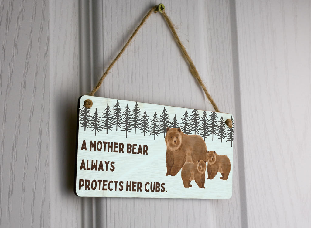 Introducing Mama Bear's Protection, the perfect addition to your Farm & Home D?cor! This charming wooden wall sign is made from high-quality plywood, ensuring durability and longevity. It is an ideal size for hanging in any room. The sign features an endearing message that reads, 'A mother bear always protects her cubs,' reminding everyone of a mother's unconditional love. This Mama Bear sign is not only a delightful decoration but also makes a thoughtful gift for mums on any occasion. Its rustic design adds a warm touch to any space and complements various d?cor styles, making it a versatile choice. Add a touch of love and cosiness to your home with this adorable wooden wall sign from Mama Bear's Protection!