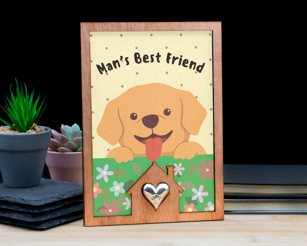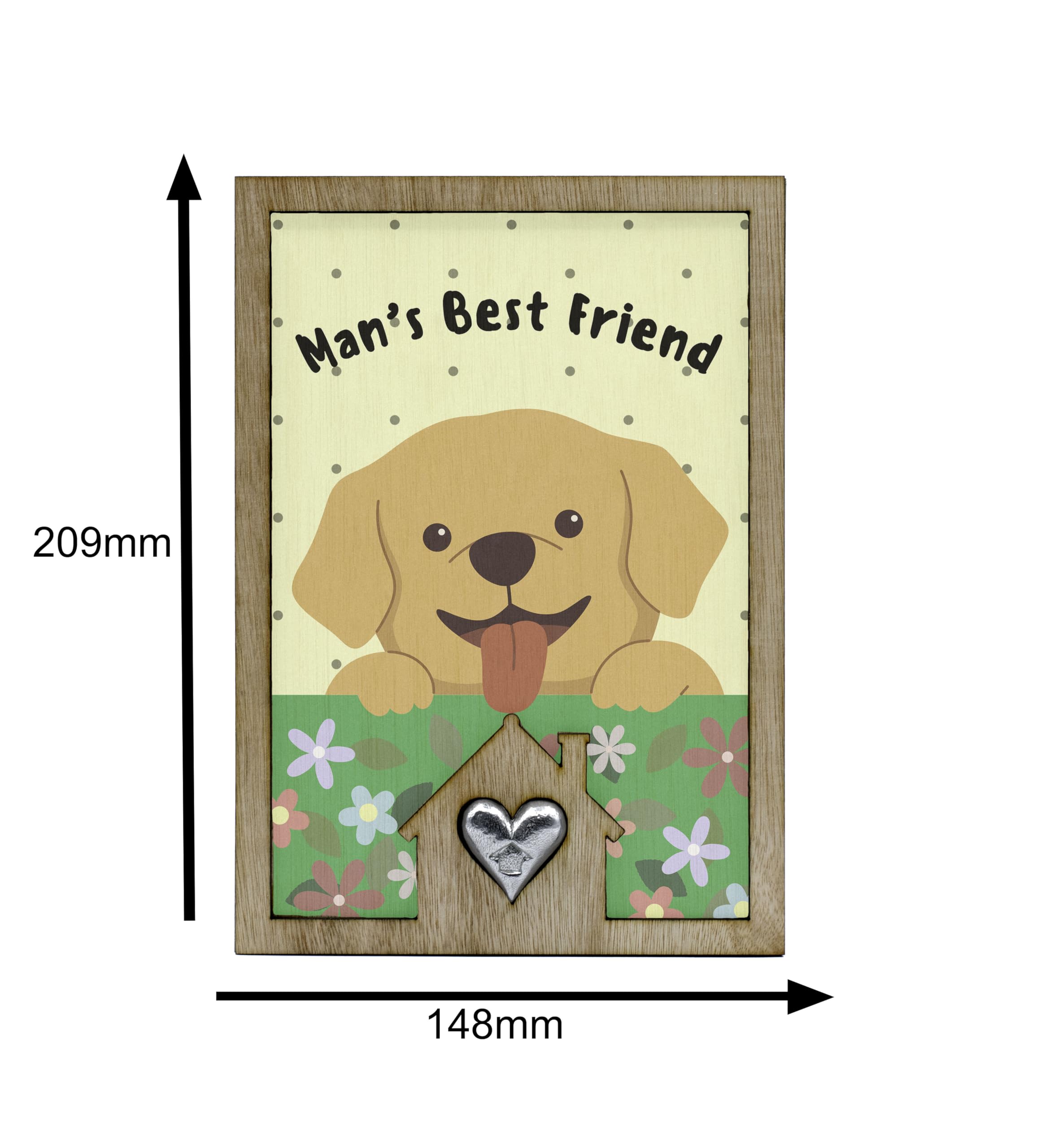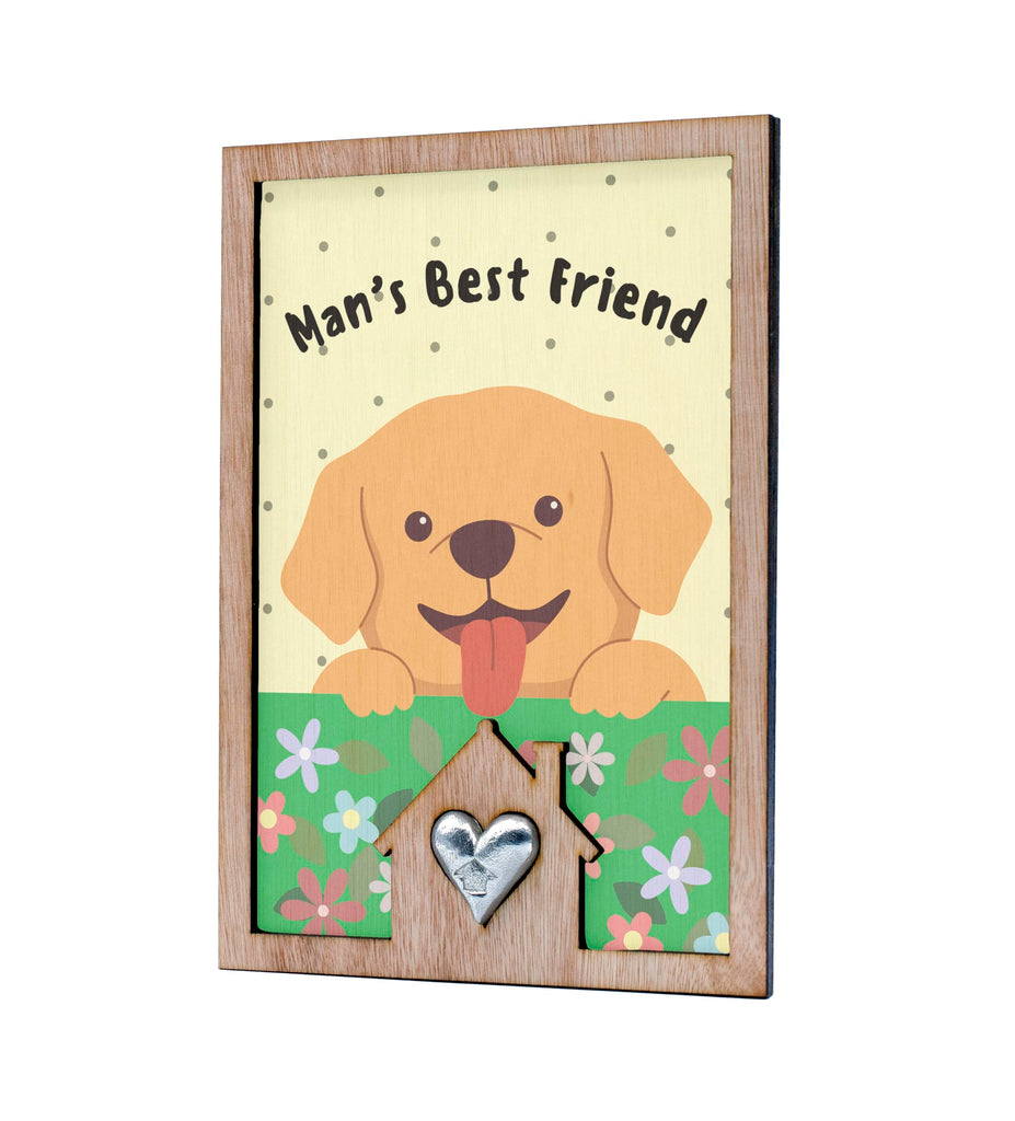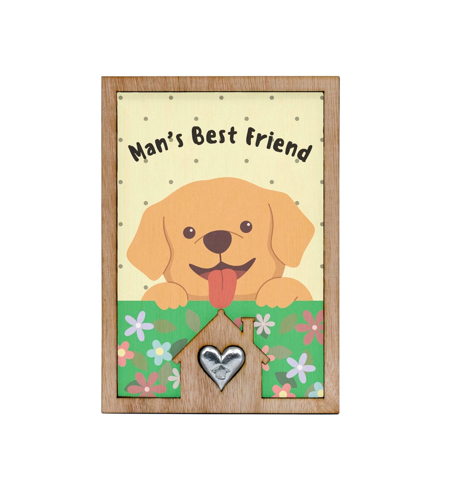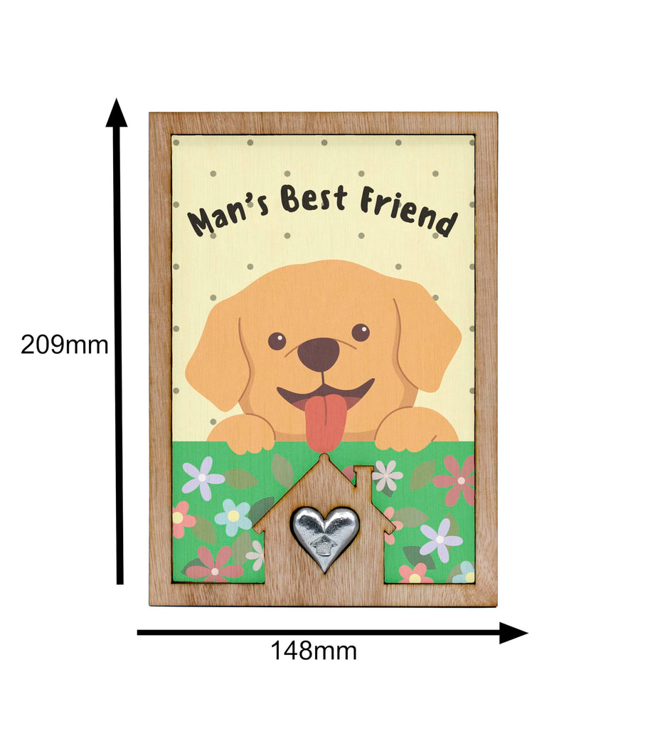 Introducing our Man's Best Friend Dog Lover's Sign with Cute Puppy Design! This adorable dog lover's sign is the perfect addition to any pet-themed decor. Crafted from handcrafted laser cut plywood, this full colour ornament features a cute cartoon style design that will bring a cheerful accent to your home. The playful art and heartwarming message make it a heartwarming gift for any animal lover. The colourful flowers and happy dog illustration add a whimsical touch to this canine decoration. Whether you're a pet owner or simply love dogs, this tin and pewter gift is sure to delight. Show your love for man's best friend with this fun and whimsical sign that reads 'Man's Best Friend'.