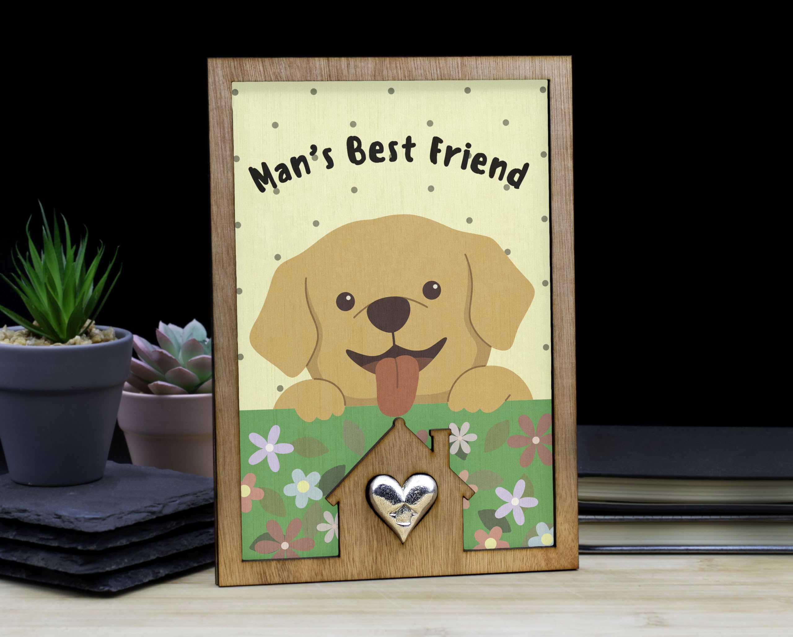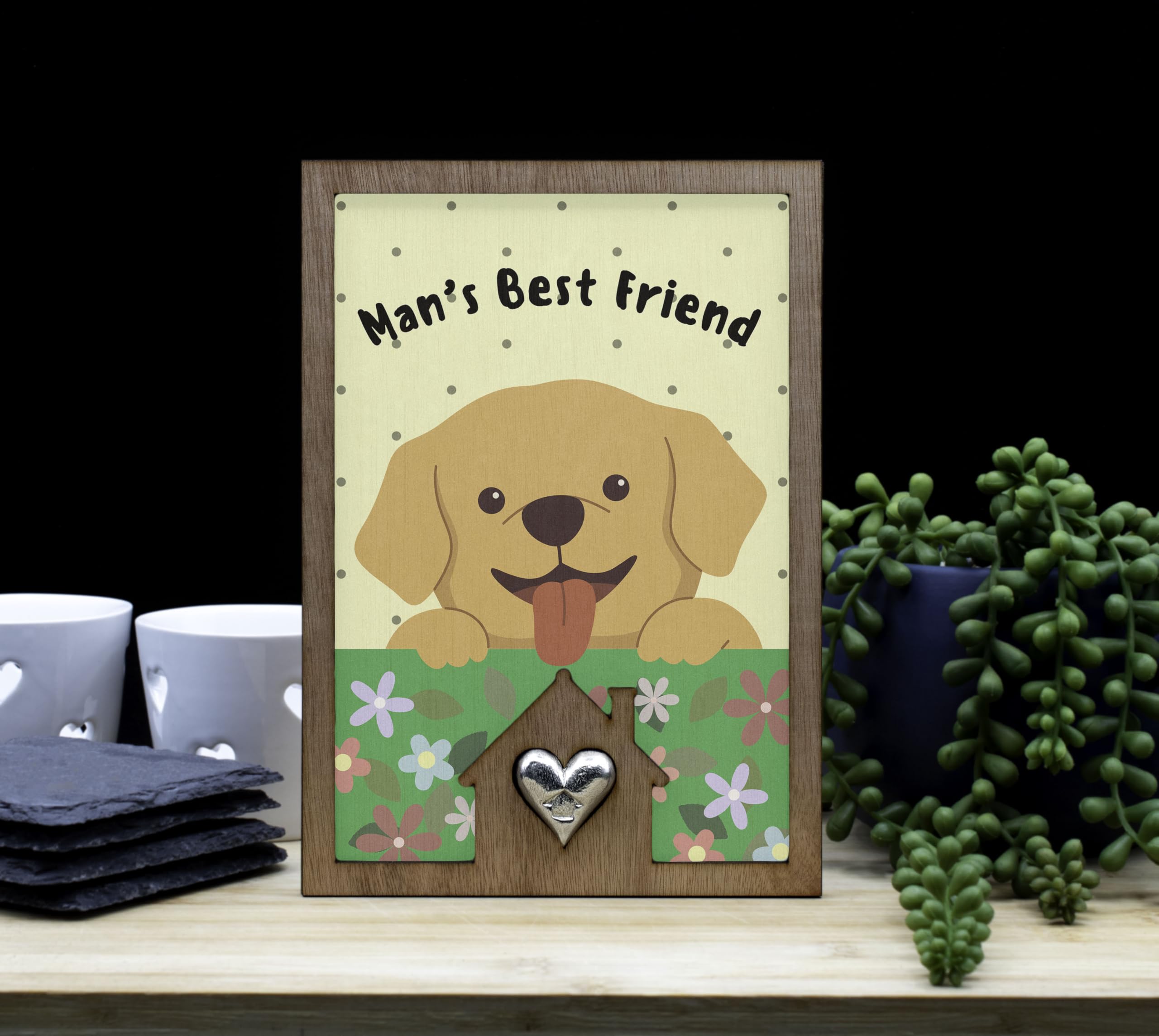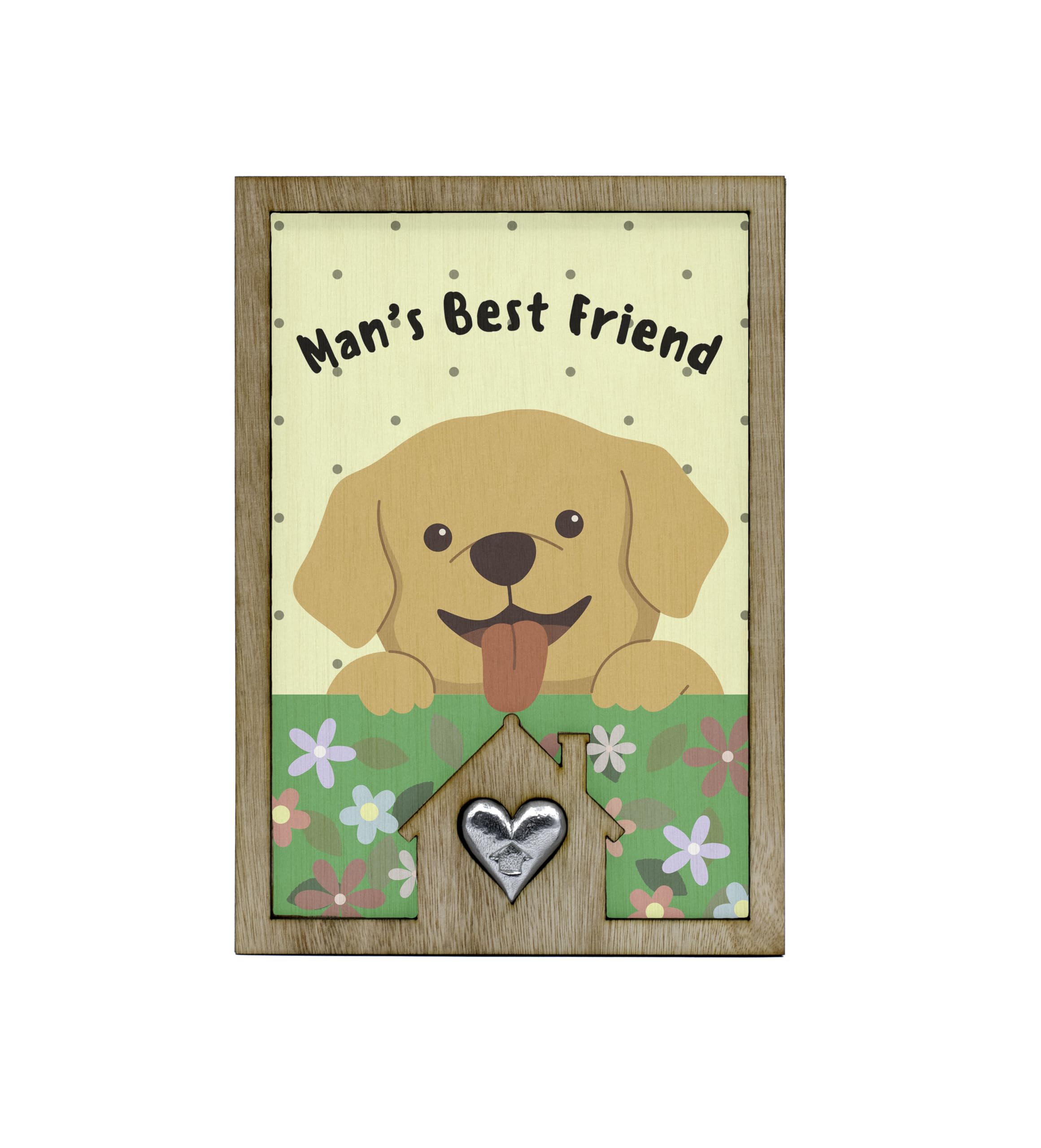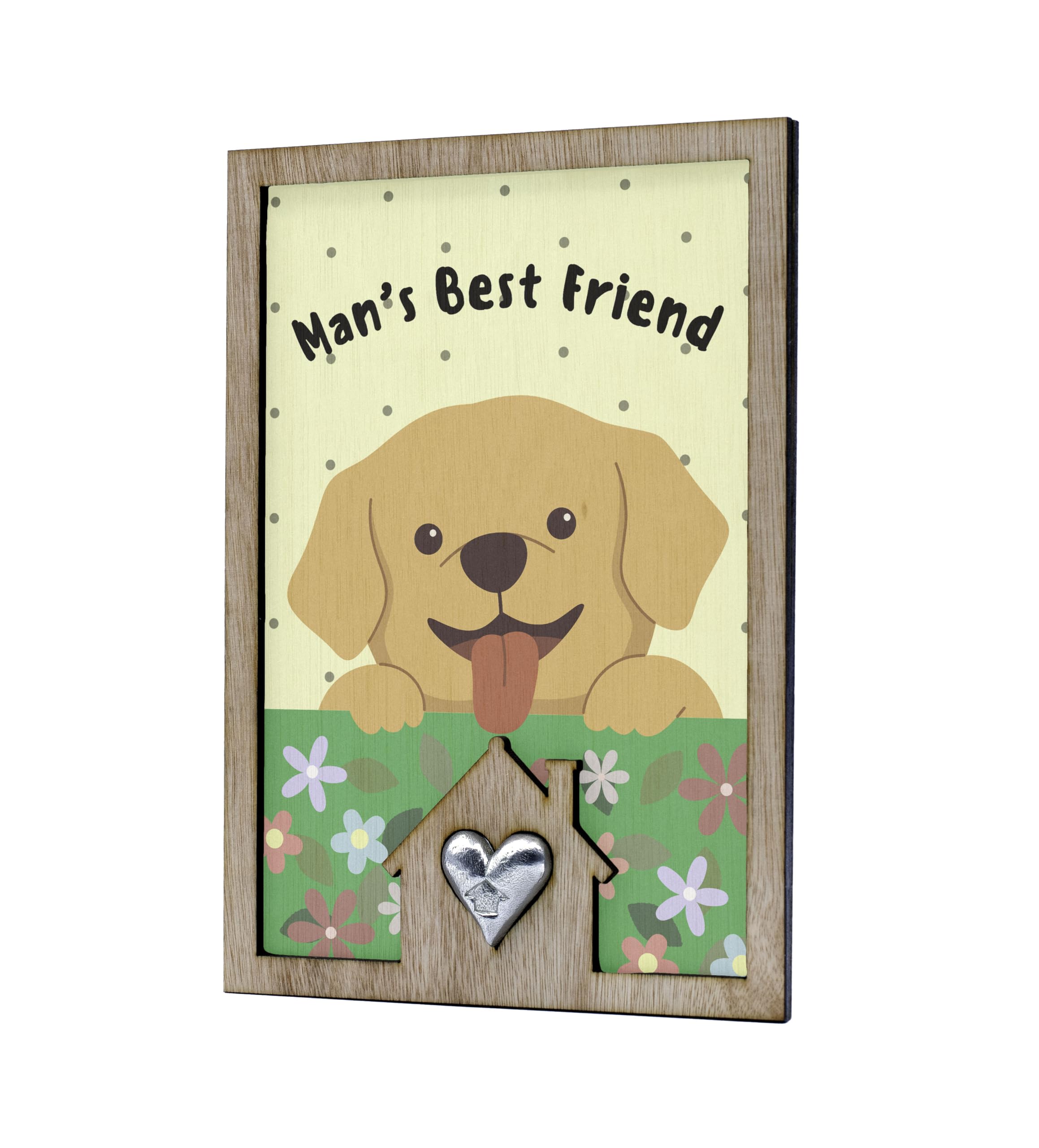 Introducing our Man's Best Friend Dog Lover's Sign with Cute Puppy Design! This adorable dog lover's sign is the perfect addition to any pet-themed decor. Crafted from handcrafted laser cut plywood, this full colour ornament features a cute cartoon style design that will bring a cheerful accent to your home. The playful art and heartwarming message make it a heartwarming gift for any animal lover. The colourful flowers and happy dog illustration add a whimsical touch to this canine decoration. Whether you're a pet owner or simply love dogs, this tin and pewter gift is sure to delight. Show your love for man's best friend with this fun and whimsical sign that reads 'Man's Best Friend'.