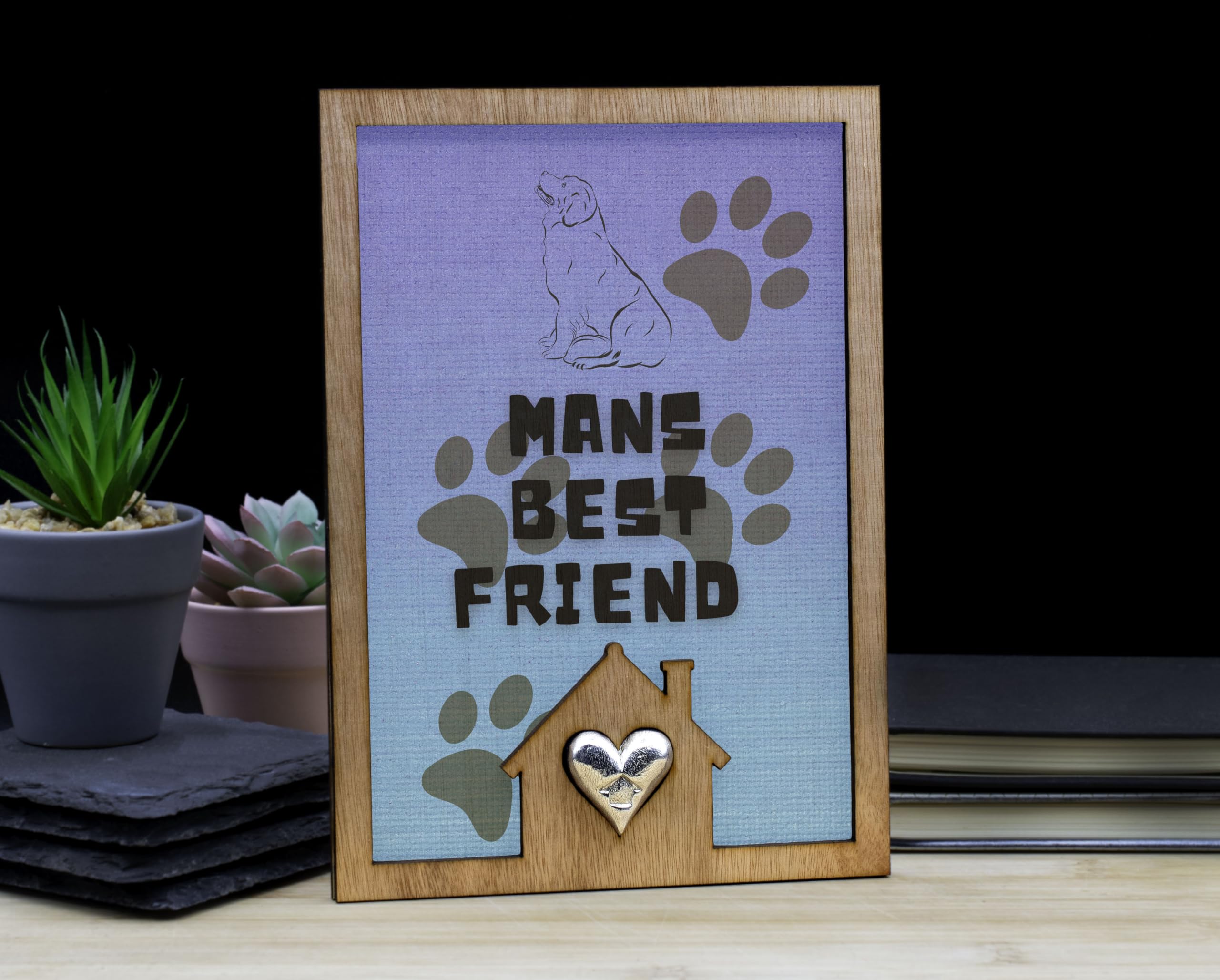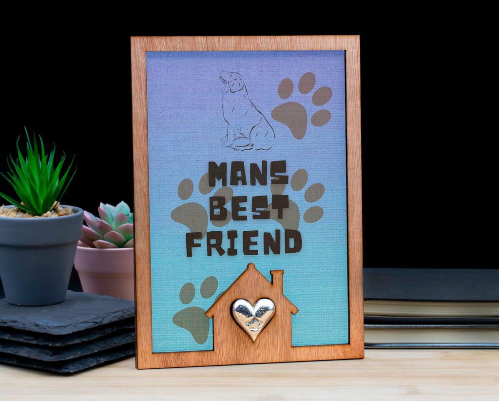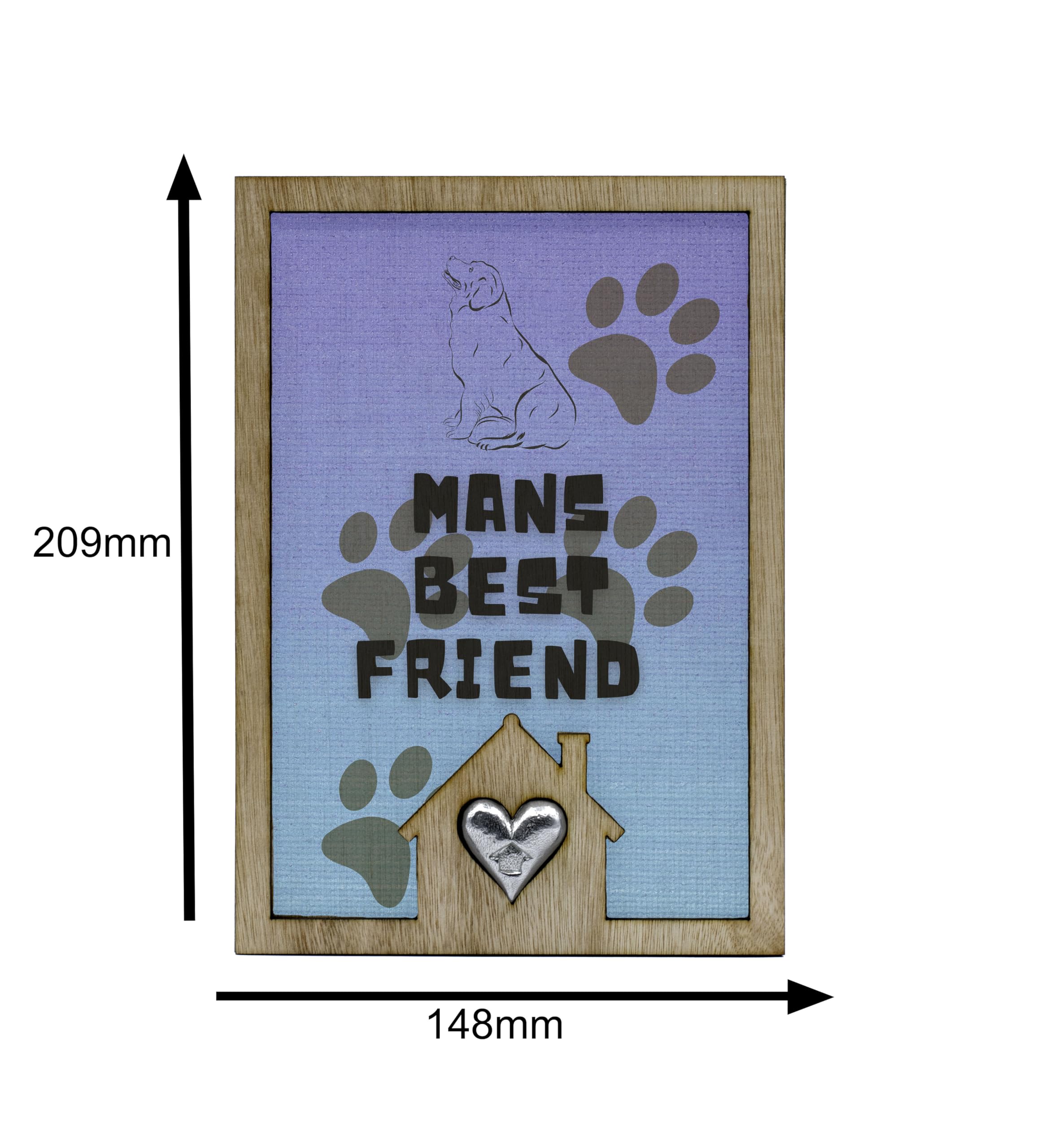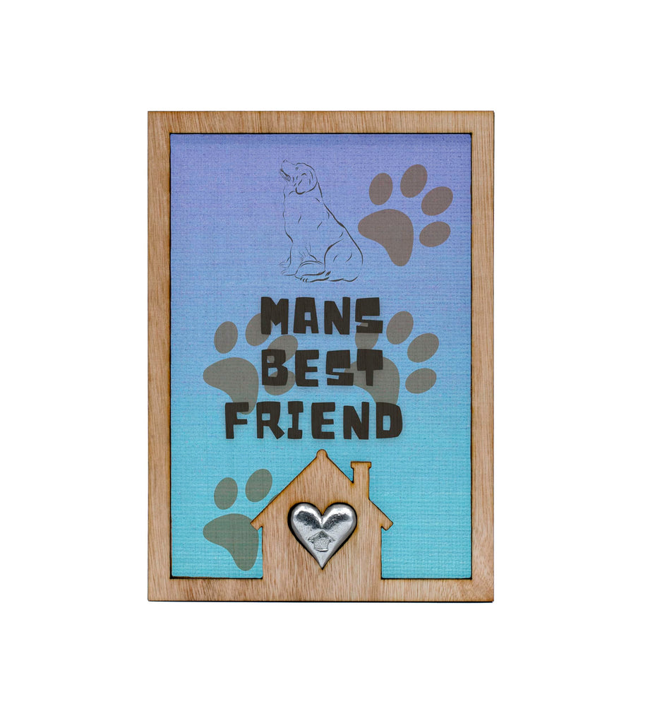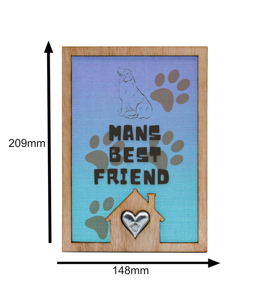 Introducing our 'Man's Best Friend Wooden Frame' - the perfect home d?cor piece for dog lovers and animal enthusiasts alike. This handmade laser cut plywood product features a stunning design of a dog silhouette surrounded by paw prints, set against a calming blue gradient background. The rustic style wooden frame is adorned with a heart ornament, making it a beautiful pet tribute that can be proudly displayed as a wall hanging in any room. This unique piece of art is an ideal gift for any dog lover, showcasing a thoughtful and inspirational message that reads 'man's best friend'. Add a touch of warmth and love to your home with this charming animal lover decoration, designed in the shape of a dog house for that extra special touch. Made of quality tin and pewter, this full colour ornament is a must-have home accessory for those who prioritise their furry friends.