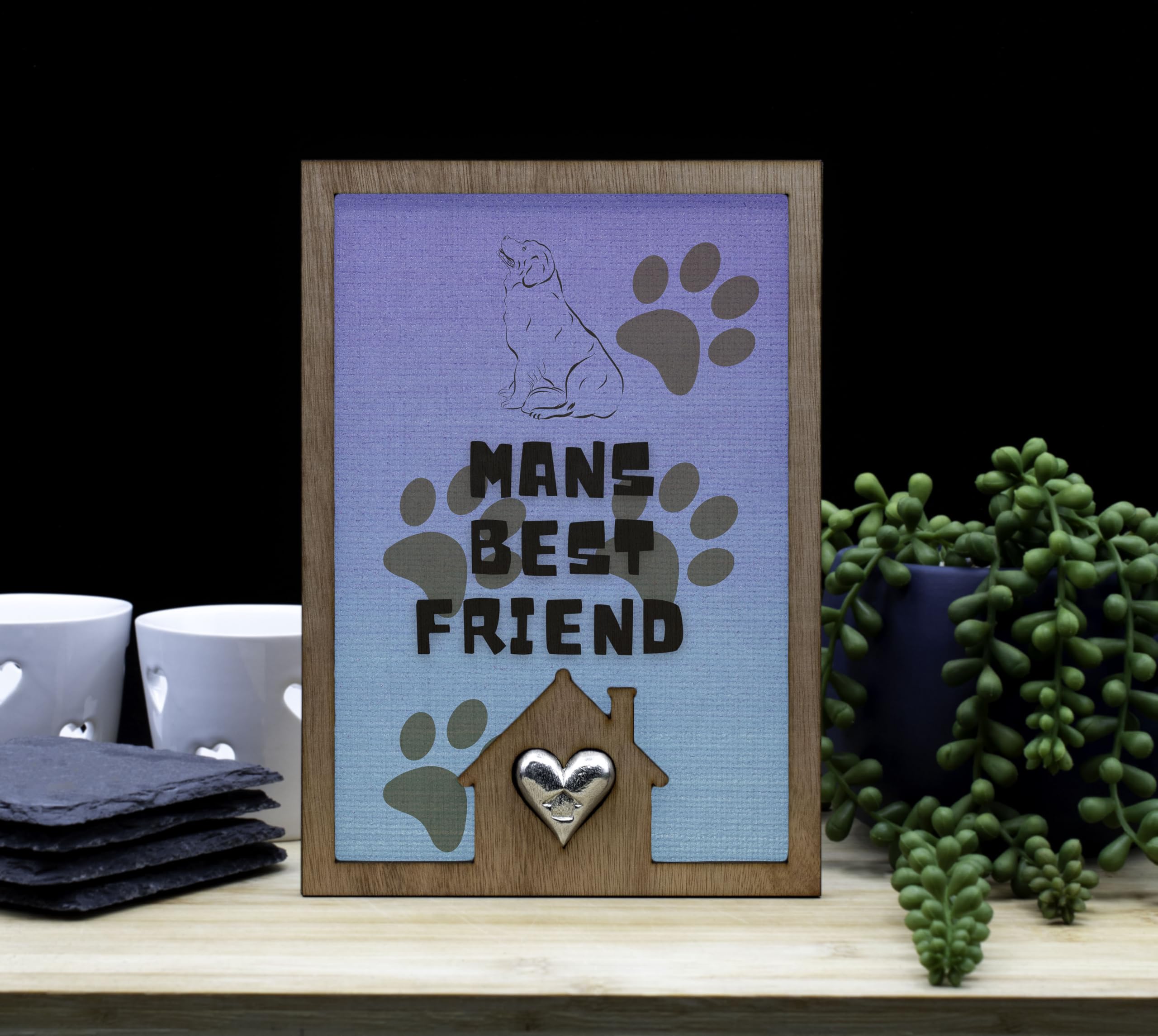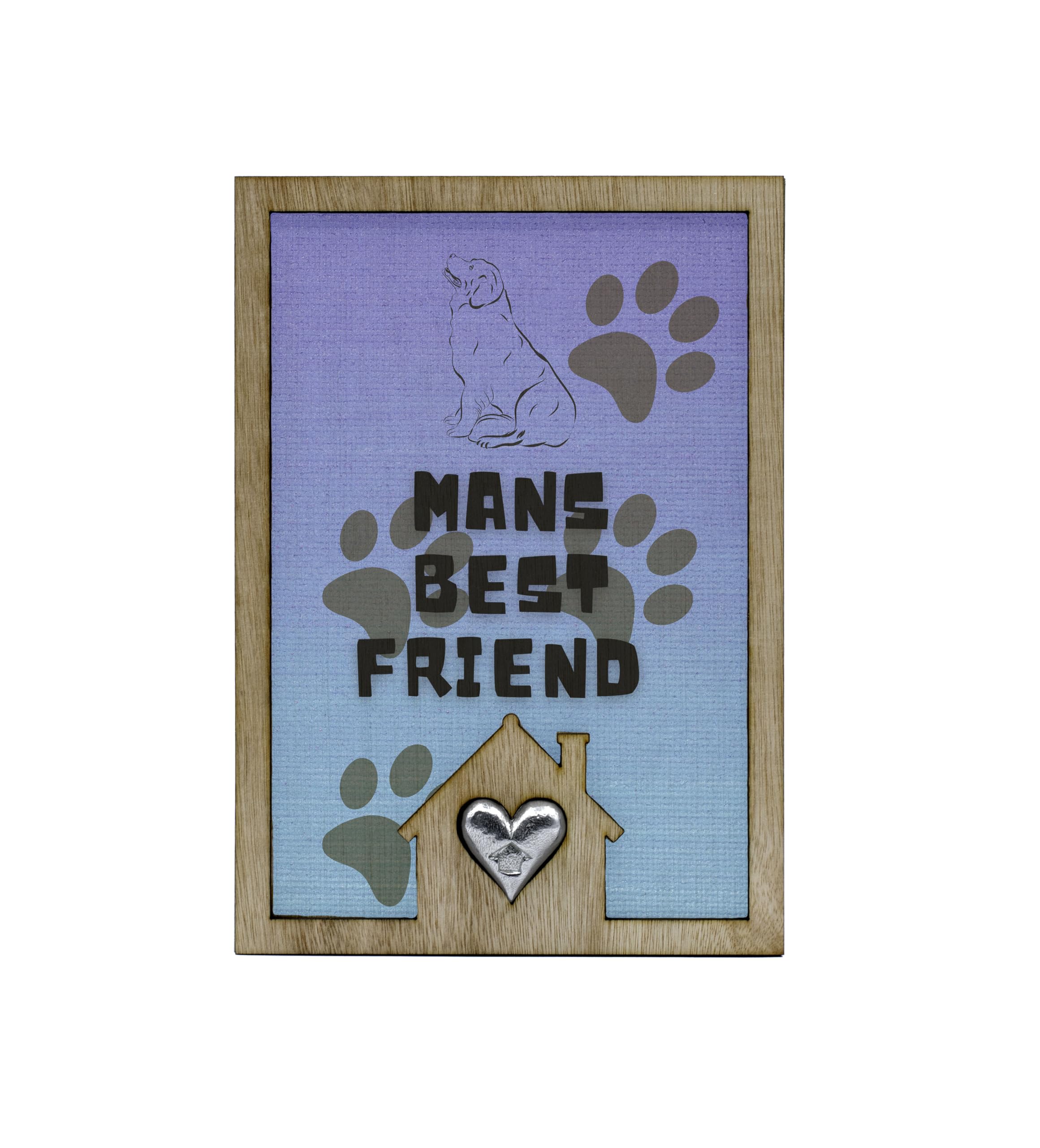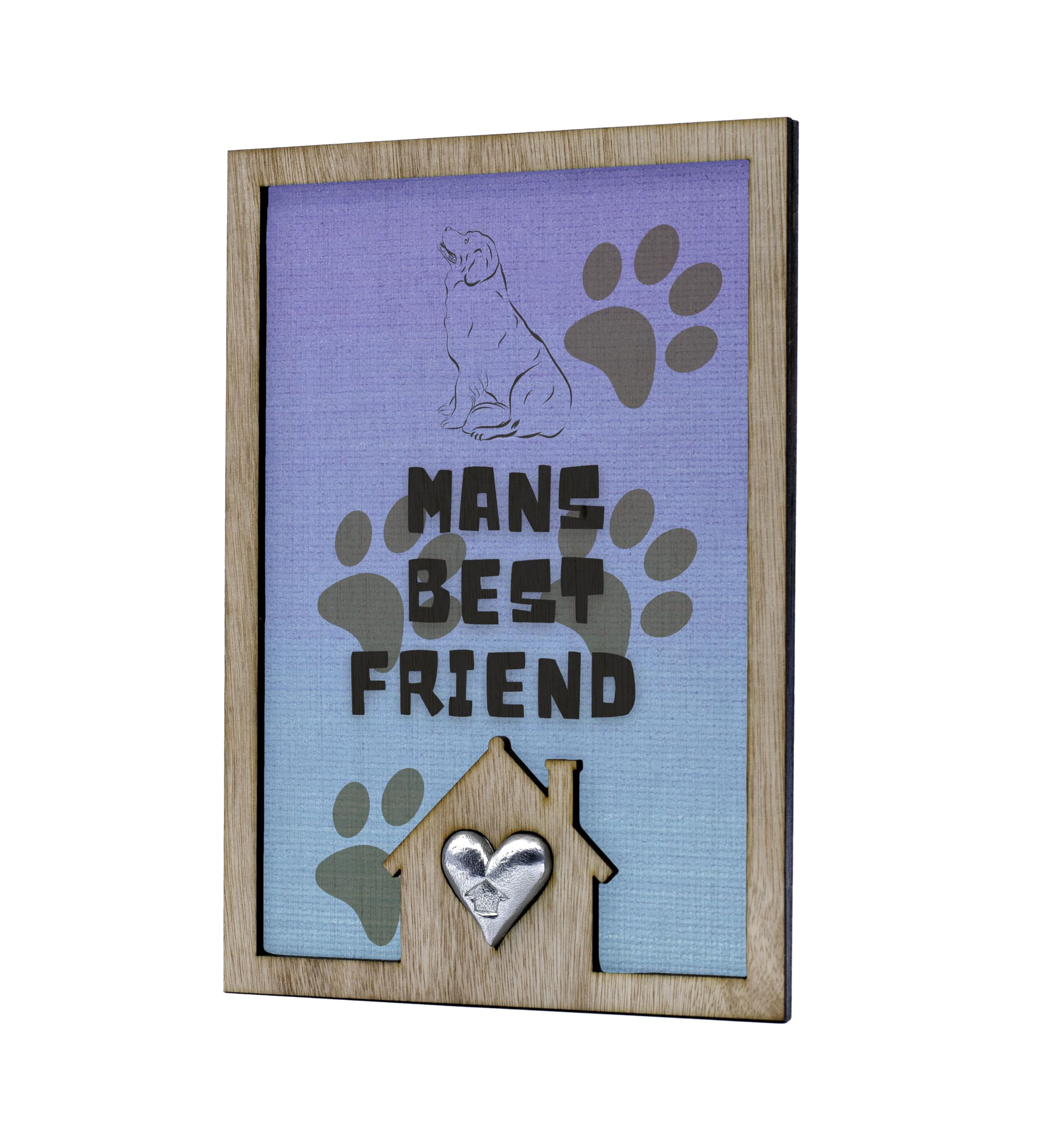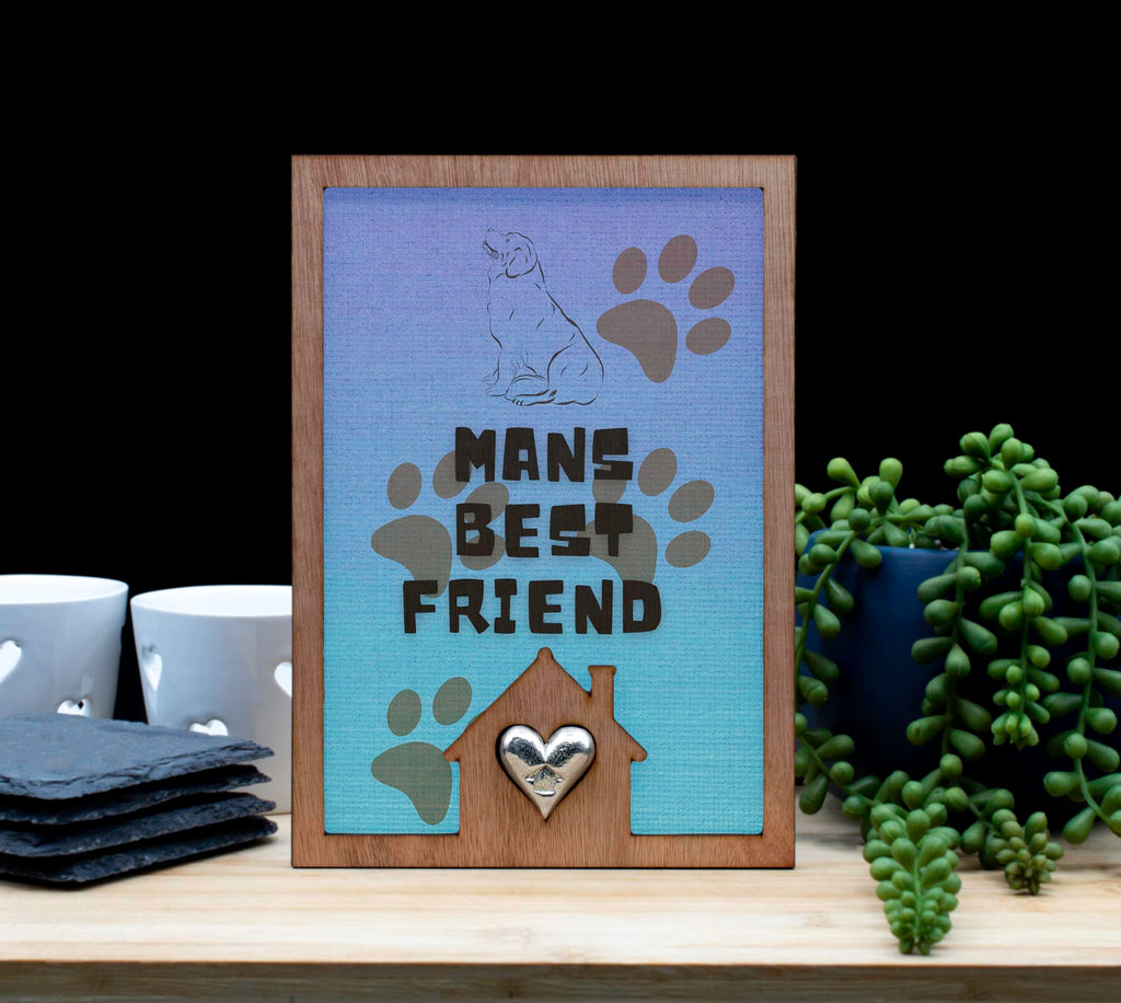 Introducing our 'Man's Best Friend Wooden Frame' - the perfect home d?cor piece for dog lovers and animal enthusiasts alike. This handmade laser cut plywood product features a stunning design of a dog silhouette surrounded by paw prints, set against a calming blue gradient background. The rustic style wooden frame is adorned with a heart ornament, making it a beautiful pet tribute that can be proudly displayed as a wall hanging in any room. This unique piece of art is an ideal gift for any dog lover, showcasing a thoughtful and inspirational message that reads 'man's best friend'. Add a touch of warmth and love to your home with this charming animal lover decoration, designed in the shape of a dog house for that extra special touch. Made of quality tin and pewter, this full colour ornament is a must-have home accessory for those who prioritise their furry friends.