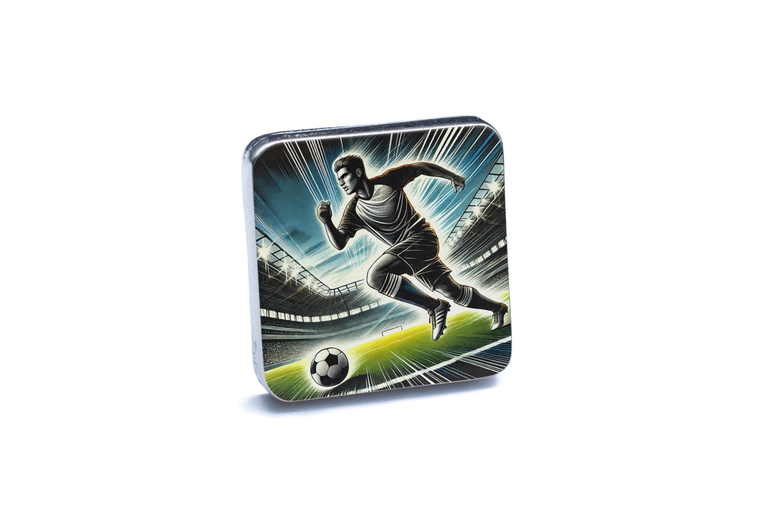 - â½ Soccer-Inspired Design: Perfect for football enthusiasts, featuring a dynamic soccer player illustration on a high-quality enamel surface.