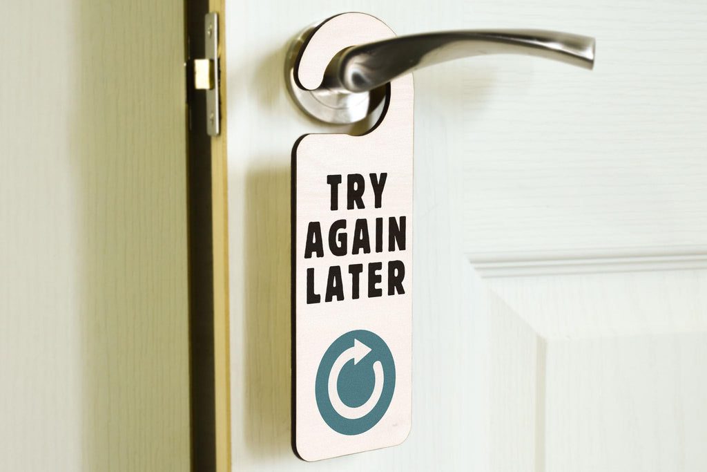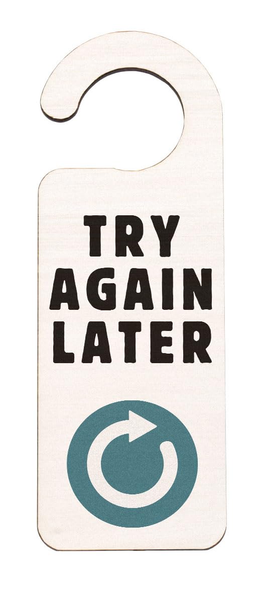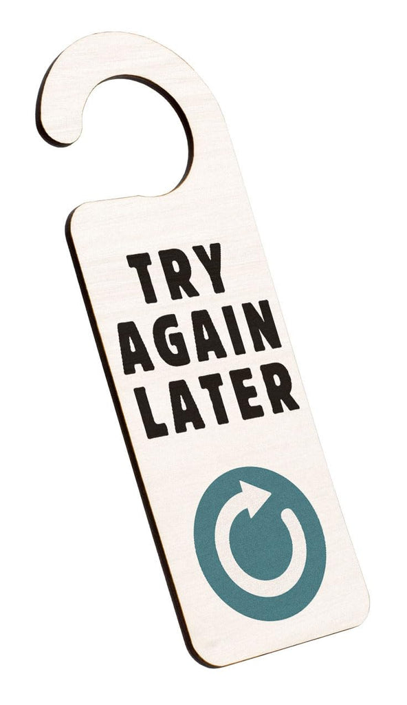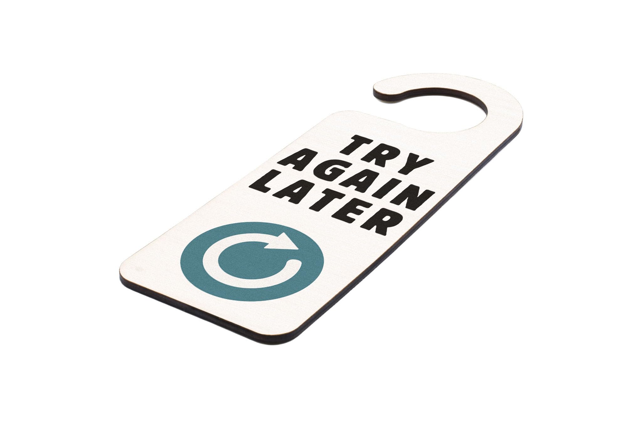 Introducing our Minimalist White Background Motivational Door Hanger: Try Again Later. This handcrafted laser cut plywood product features a full colour door hanger showing a simple and functional design ideal to keep out unwanted visitors. The circular arrow icon and the message 'Try Again Later' make it a perfect temporary notice for any door, whether it's at home or in the office. This motivational sign is not only an encouragement message, but also a gentle reminder for those who need delayed access or simply want to have a moment of peace. The minimalist design of this door hanger makes it a stylish addition to your home decor or office accessory collection. Let this 'Try Again Later' door notice serve as a do not disturb sign with a touch of sophistication.