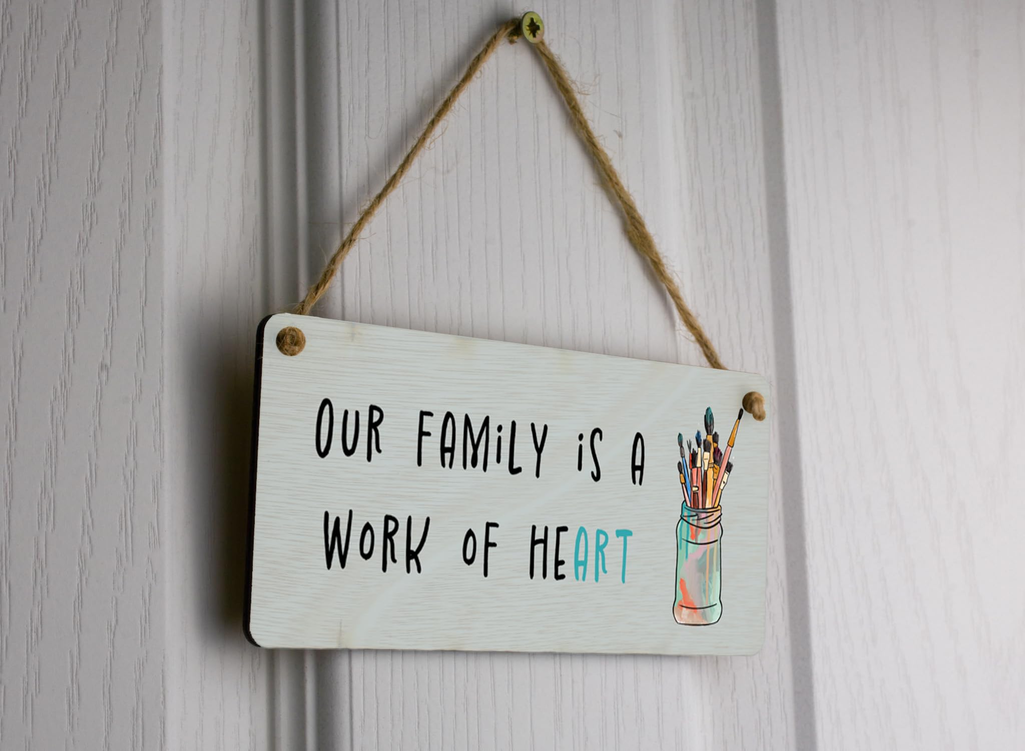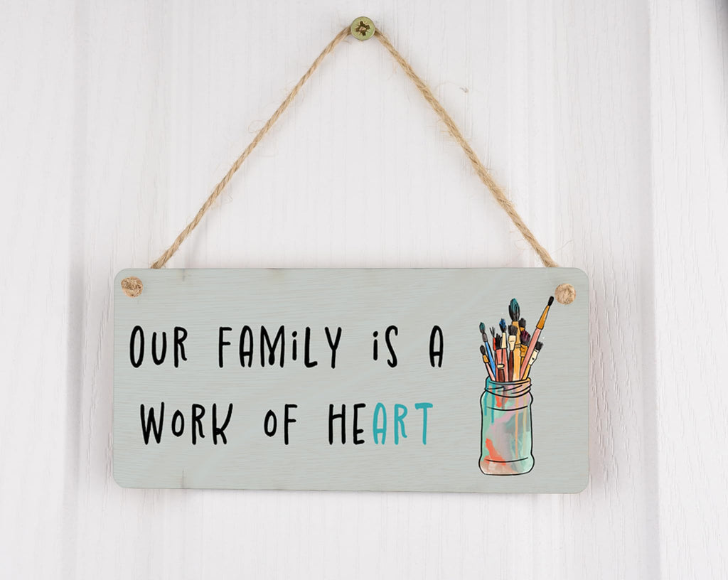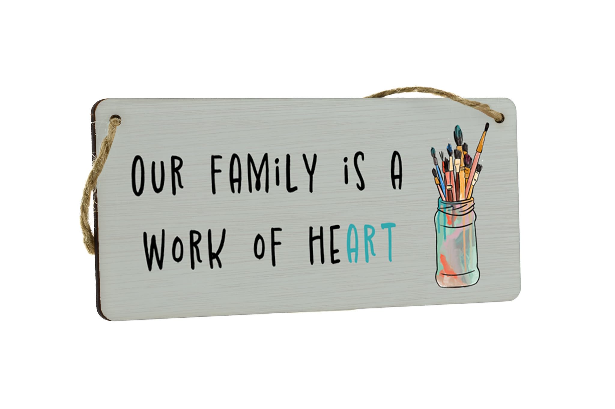 The Modern Heartworks Full Color Plywood Art Sign is the perfect gift for artistic families. Made from high-quality plywood, this hanging sign features a modern arty design that will add a touch of style to any home decor. The sign reads 'Our Family is a Work of Heart,' making it a meaningful and heartfelt piece of art. With its vibrant full-color print and modern font, this art sign is sure to make a statement. It is a great gift for artists and art enthusiasts, as well as for families who appreciate the beauty of art. This unique sign can be used as a house sign or home sign, adding a personalized touch to any space. Whether you're looking for a gift for him or a gift for her, this Modern Heartworks Art Sign is the perfect choice. Show your love for art and your arty family with this beautiful and modern sign.