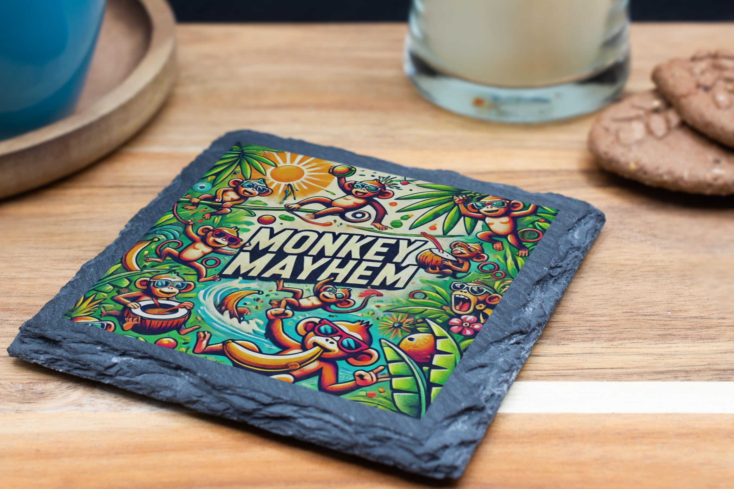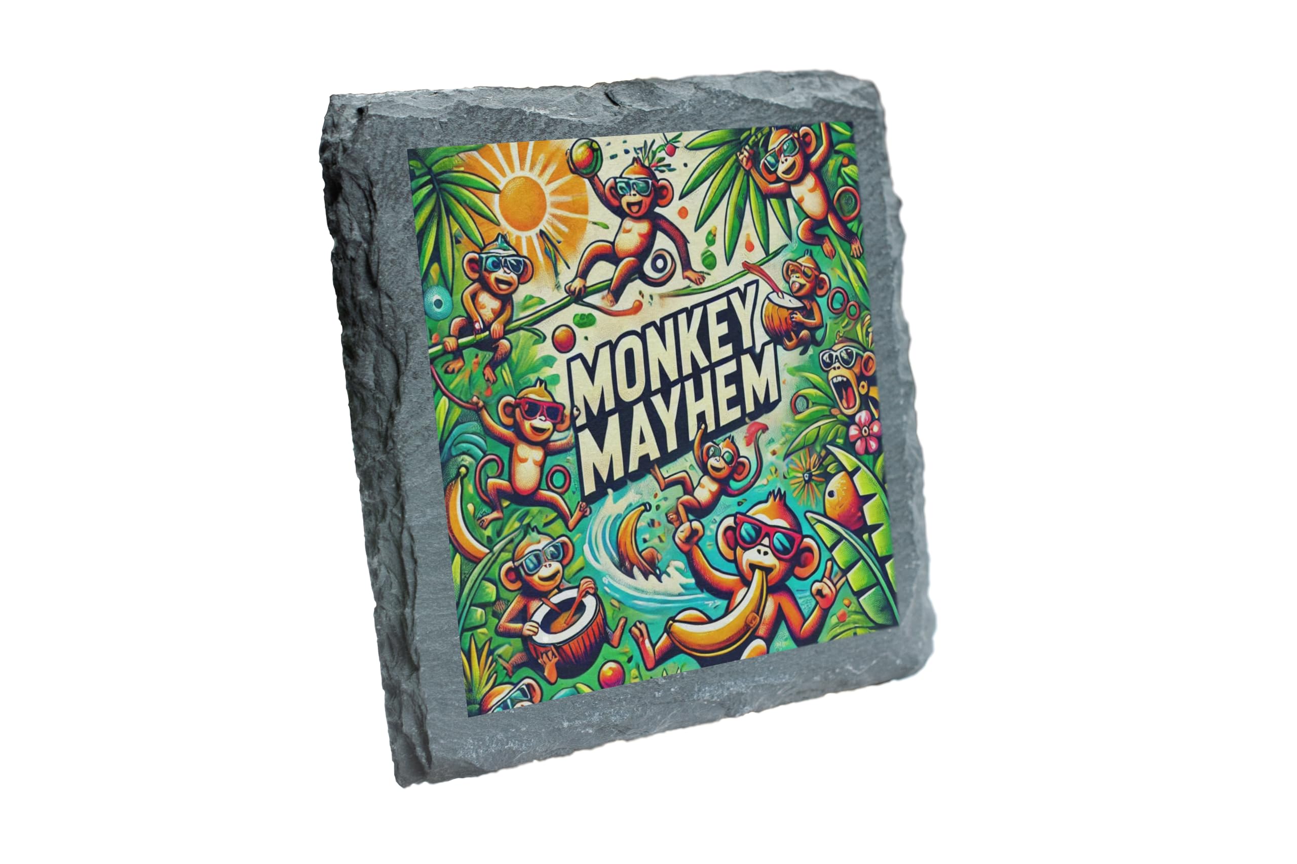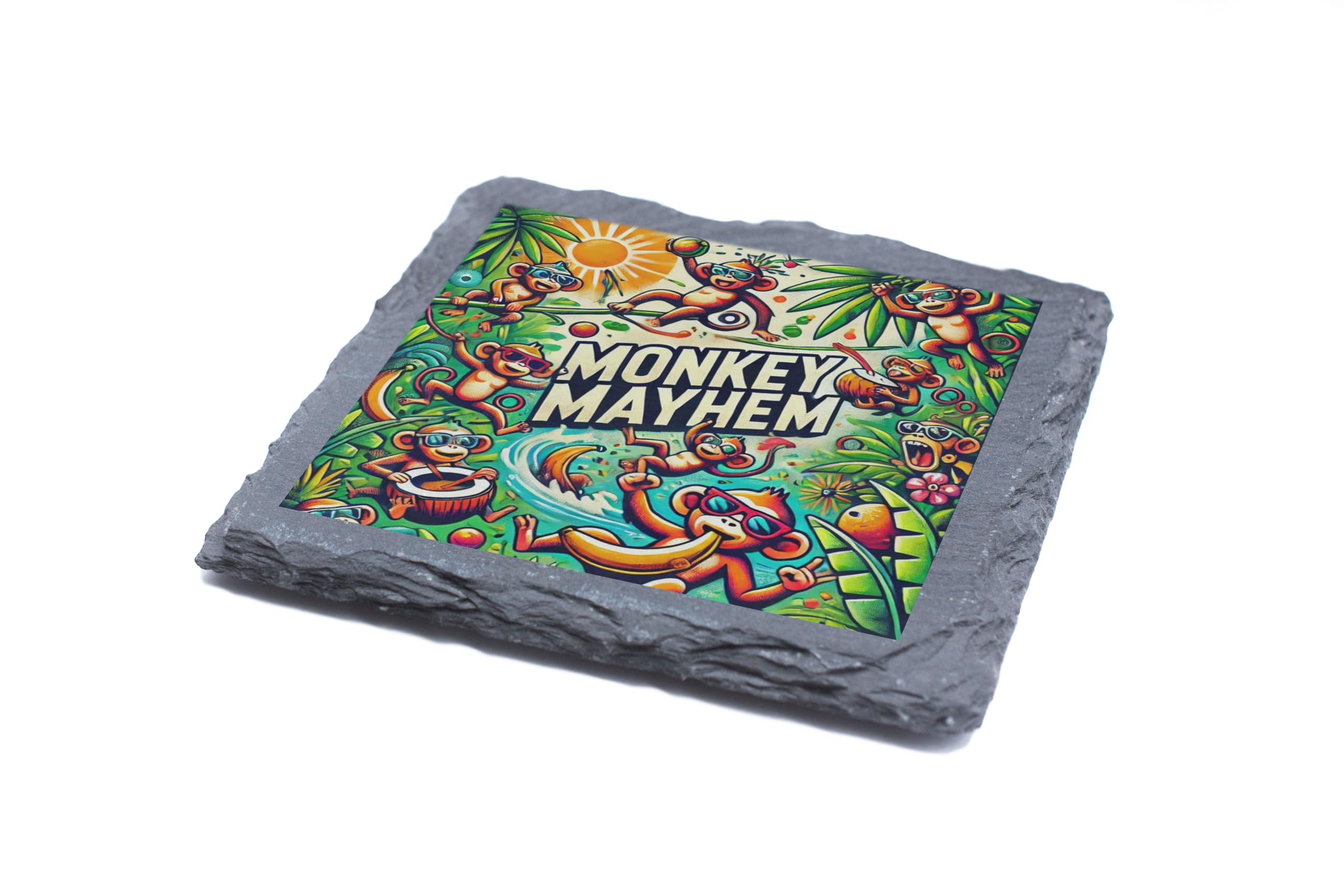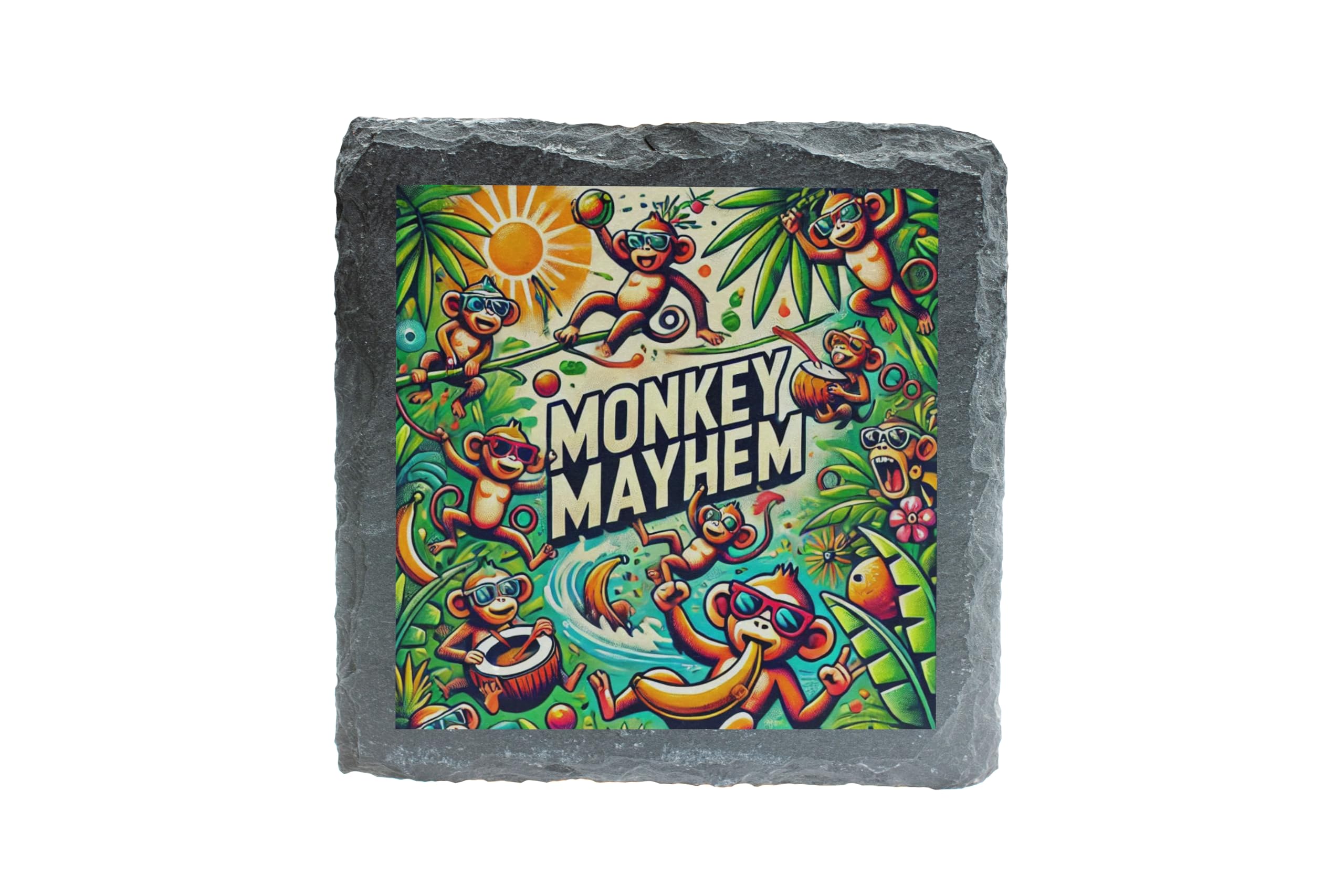 Add a splash of fun to your home or party with this "Monkey Mayhem" slate coaster! Bursting with vibrant colors and playful jungle scenes, this coaster features mischievous monkeys in action, sure to brighten up any space. Crafted from high-quality natural slate, this coaster not only protects your surfaces but also serves as an eye-catching conversation starter. Whether you're hosting a jungle-themed party, decorating a kid?s room, or simply looking to bring some cheer to your coffee table, this coaster is a perfect choice. The perfect blend of practicality and fun, it's an ideal gift for monkey lovers, children, or anyone who appreciates quirky decor. Let the mayhem begin!