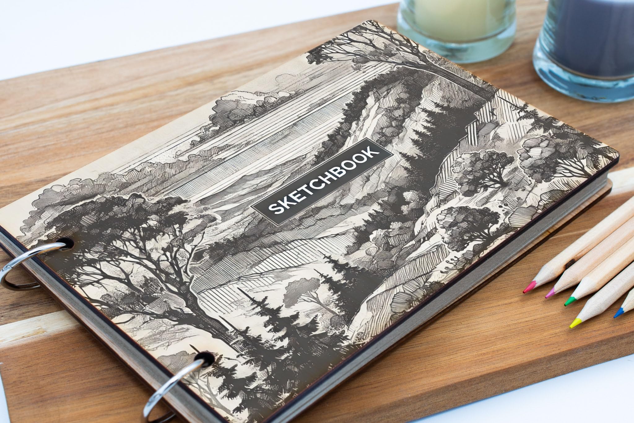 - Wooden cover and AI Generated cover art featuring a pastoral landscape sketch for an elegant touch