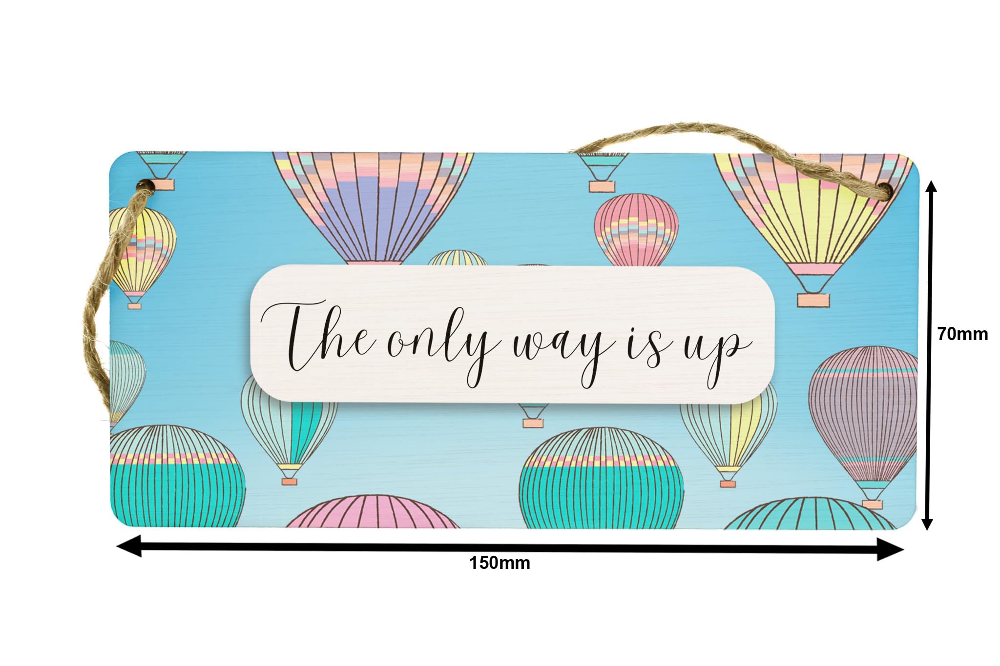 Add a touch of inspiration to your home or office with this motivational wall sign. Made from quality plywood, this hanging sign features a beautiful hot air balloon design that symbolizes the idea that the only way is up. It reads 'The Only Way is Up' in bold, attention-grabbing font. The sign is printed in full colour, ensuring vibrant and eye-catching visuals. Perfect for any room, this inspirational sign will uplift your spirits and remind you to stay positive and focused on your goals. It also makes a thoughtful gift for friends, family, or colleagues who may need a boost of motivation in their lives. Bring a sense of optimism and determination to your space with this unique and stylish decor piece.