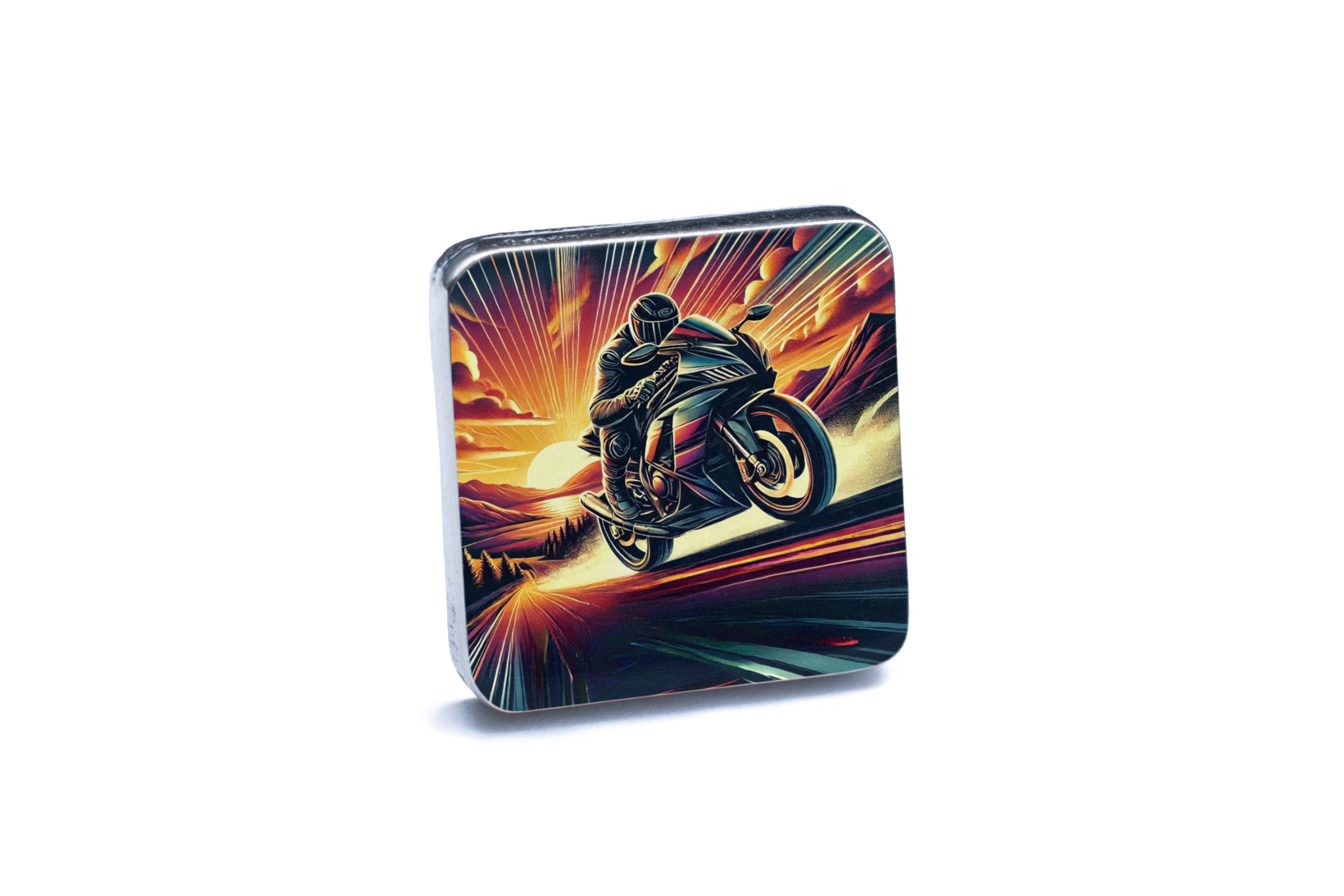 - Dynamic Motorcycle Design: Features a thrilling illustration of a biker speeding into a vibrant sunset, embodying freedom and adventure.