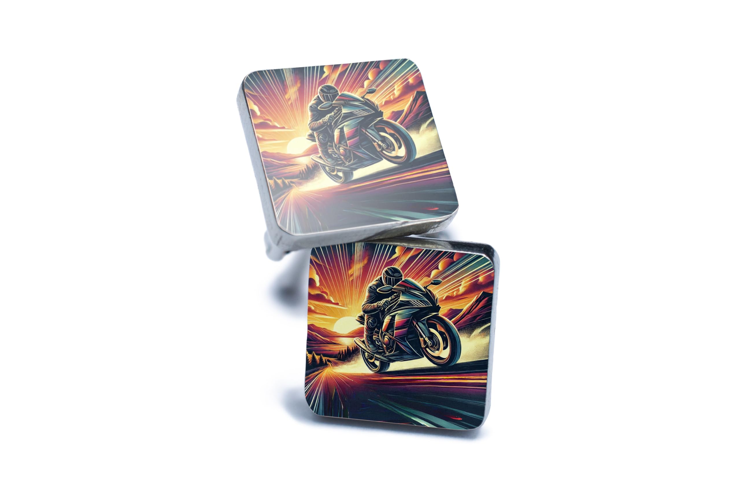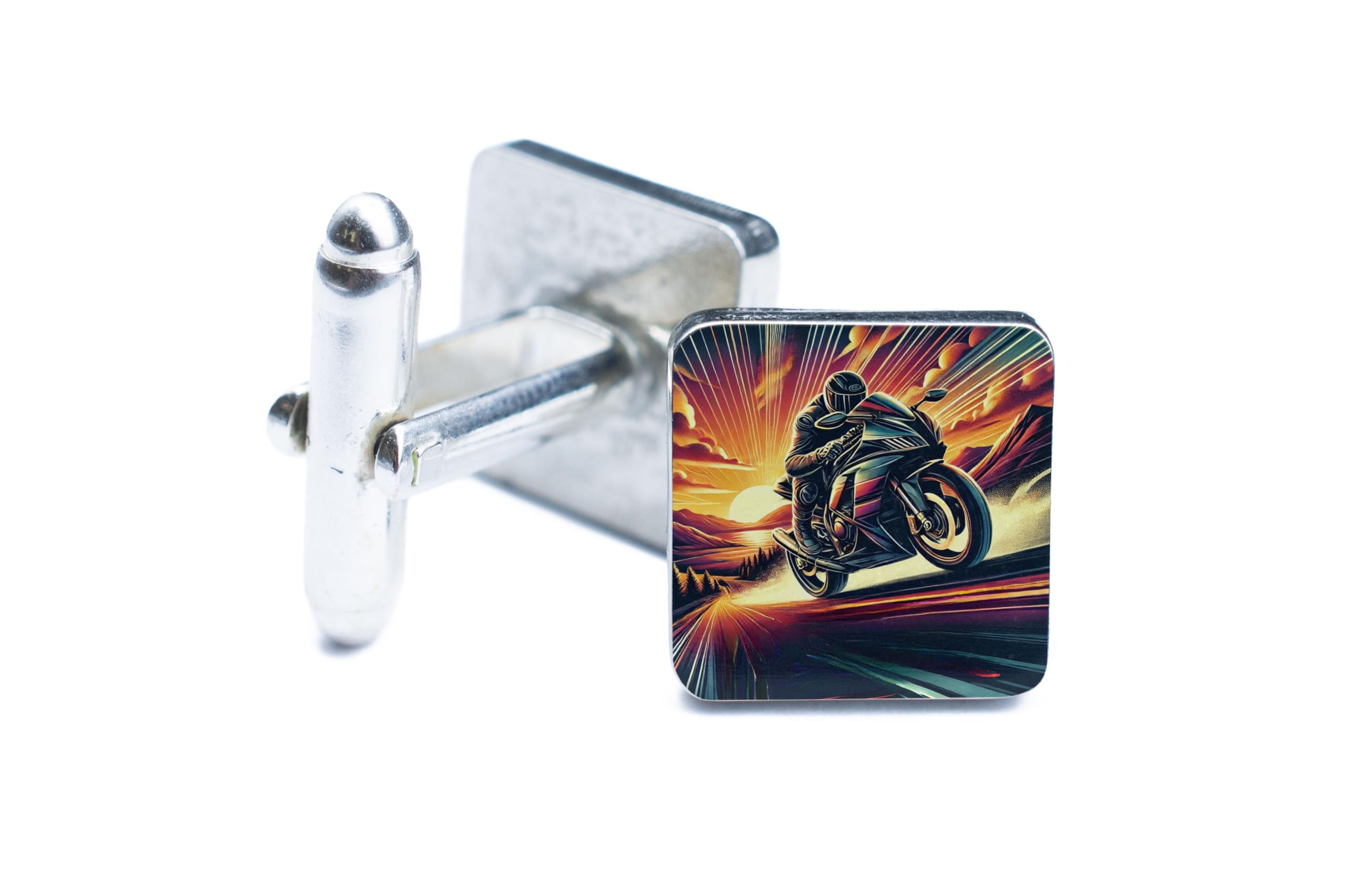 Unleash the spirit of adventure with these Motorcycle Adventure Cufflinks. Featuring a striking design of a biker racing towards a stunning sunset, these cufflinks capture the freedom and thrill of the open road. Perfect for motorcycle enthusiasts, these cufflinks are a bold statement piece that adds personality to any outfit. Crafted with premium materials and a sleek polished finish, these cufflinks combine durability with dynamic style. Whether you're gearing up for a formal event or simply showcasing your passion for riding, these cufflinks are a versatile and meaningful accessory. They make a fantastic gift for bikers, thrill-seekers, or anyone who dreams of life on two wheels. Celebrate your love for the ride with these standout cufflinks!