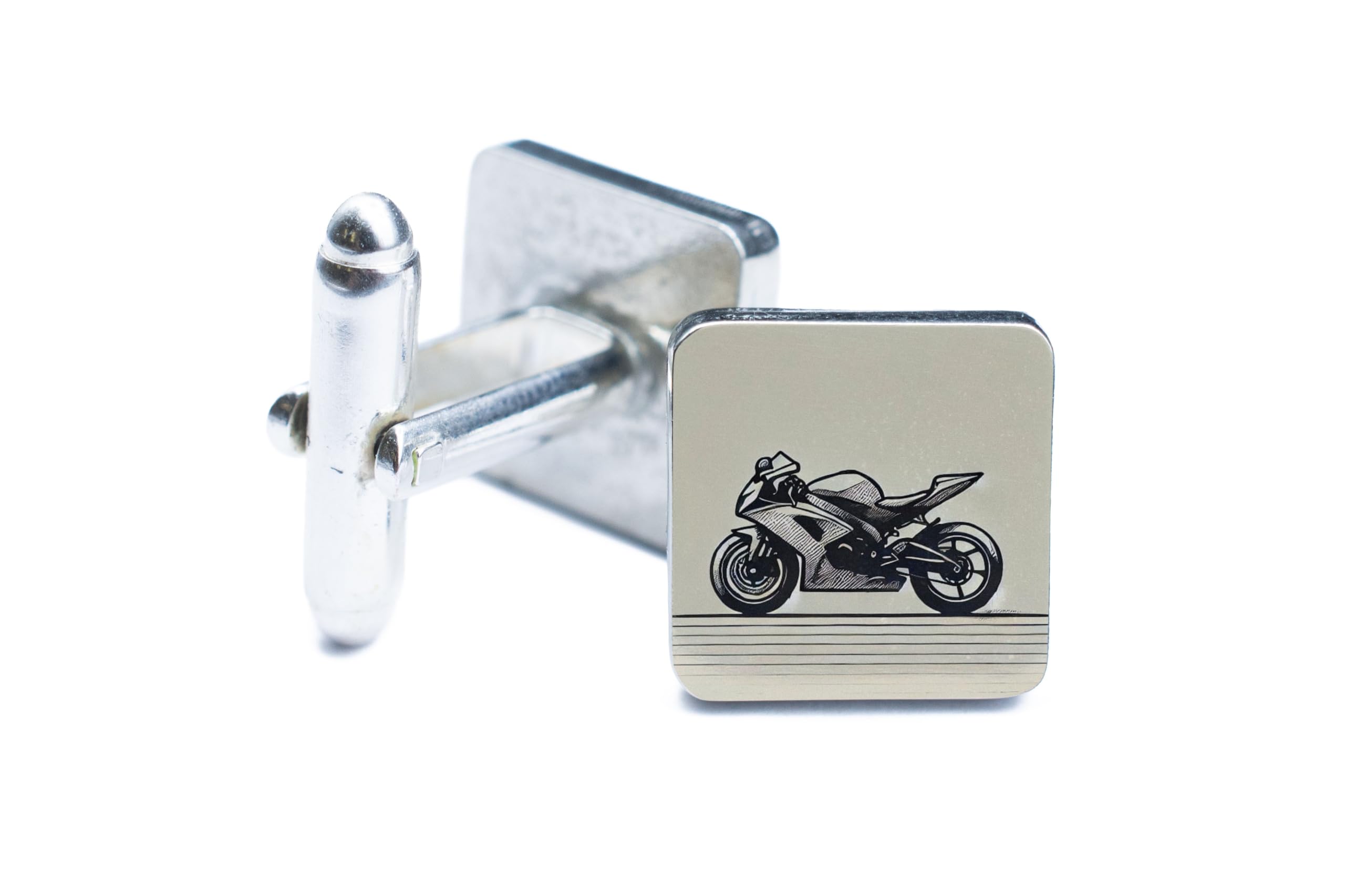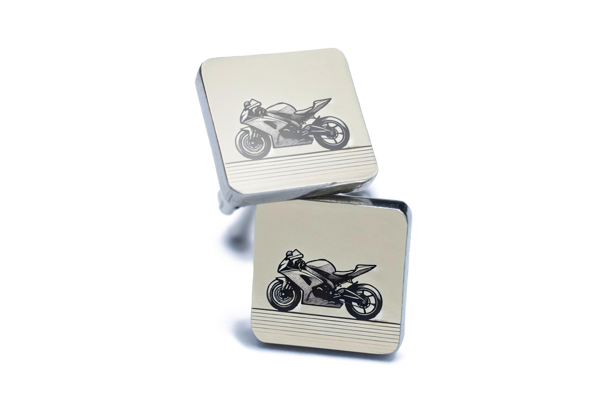 Hit the road in style with these sleek and sophisticated motorcycle cufflinks. Designed for the passionate biker, these cufflinks feature a finely detailed motorcycle graphic etched onto a polished metal base. Whether you're attending a formal event, heading to the office, or meeting up with fellow bikers, these cufflinks are a perfect way to express your love for two-wheelers. Their durable construction and elegant design make them a standout accessory for any occasion. Packaged in a premium gift box, these cufflinks make a thoughtful gift for motorcycle enthusiasts, combining style and passion in one unique accessory.