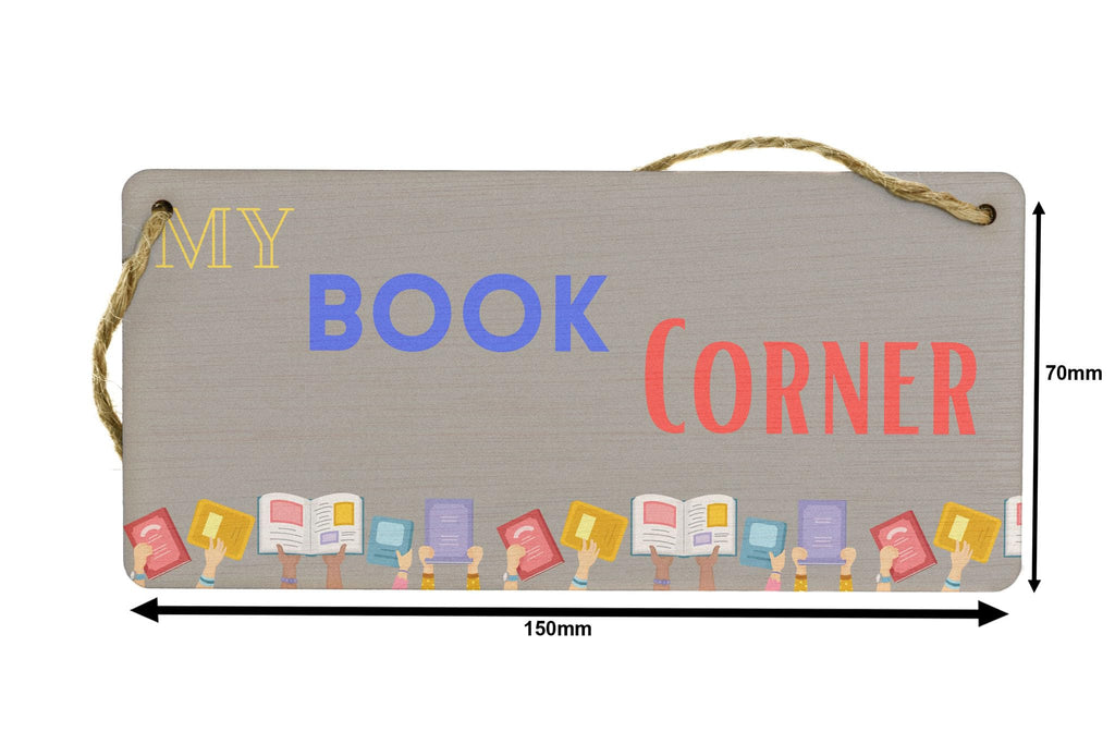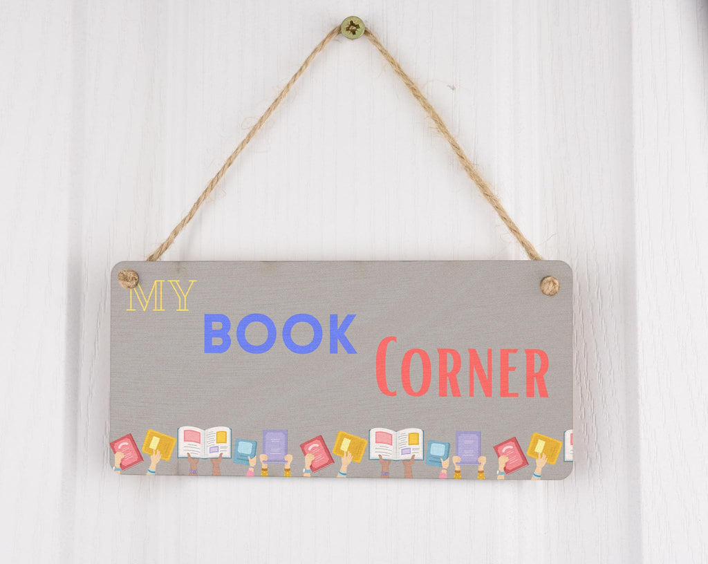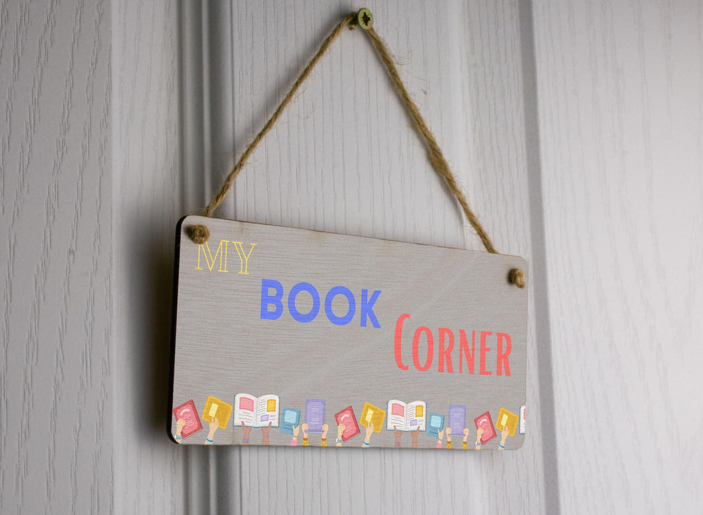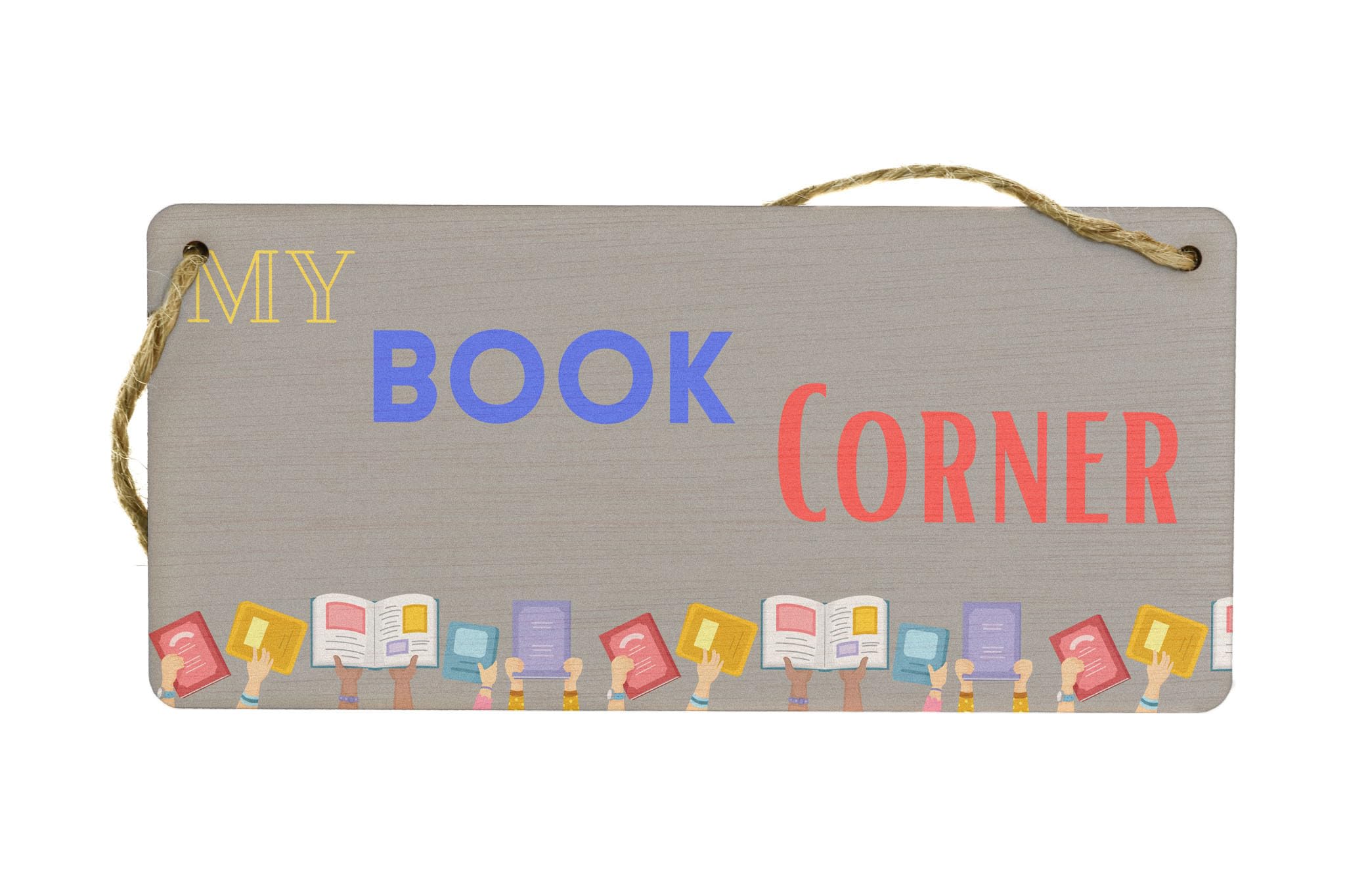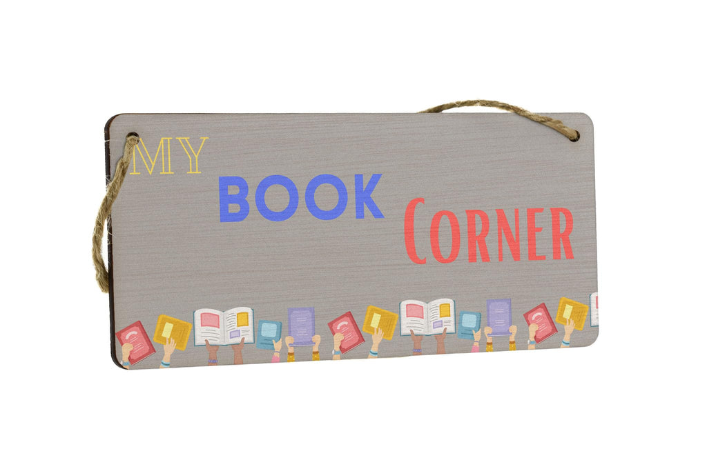 Introducing our My Book Corner - Plywood Hanging Sign! This charming room sign is the perfect addition to any reading nook or kids room. Made from quality plywood, this hanging sign is not only durable but also adds a touch of style to any home decor. It makes a thoughtful and unique gift for your wife, husband, girlfriend, boyfriend, son, daughter, or siblings. With its vibrant yellow, blue, and red writing on a brown background, along with images of hands holding books on the bottom, this sign will surely catch everyone's attention. Showcase your love for books and create a cosy atmosphere with our My Book Corner - Plywood Hanging Sign.